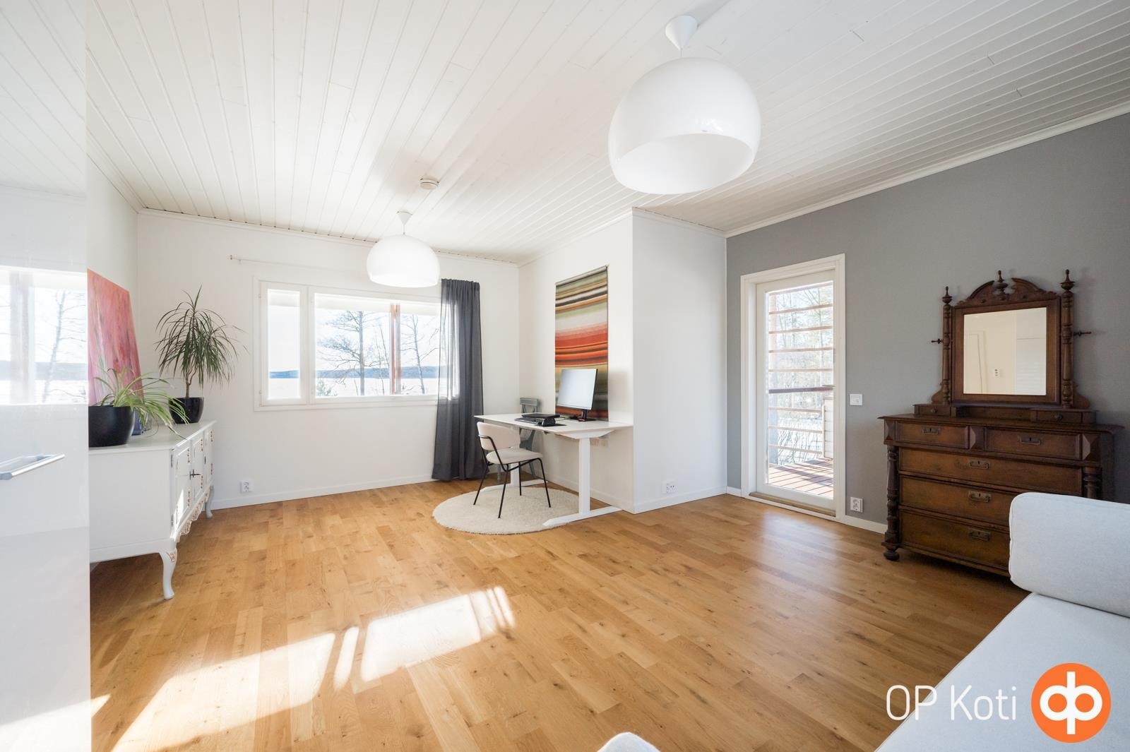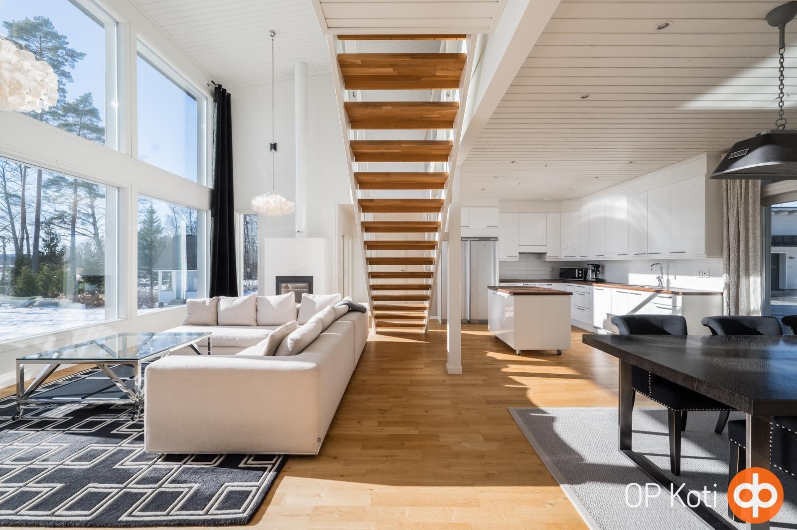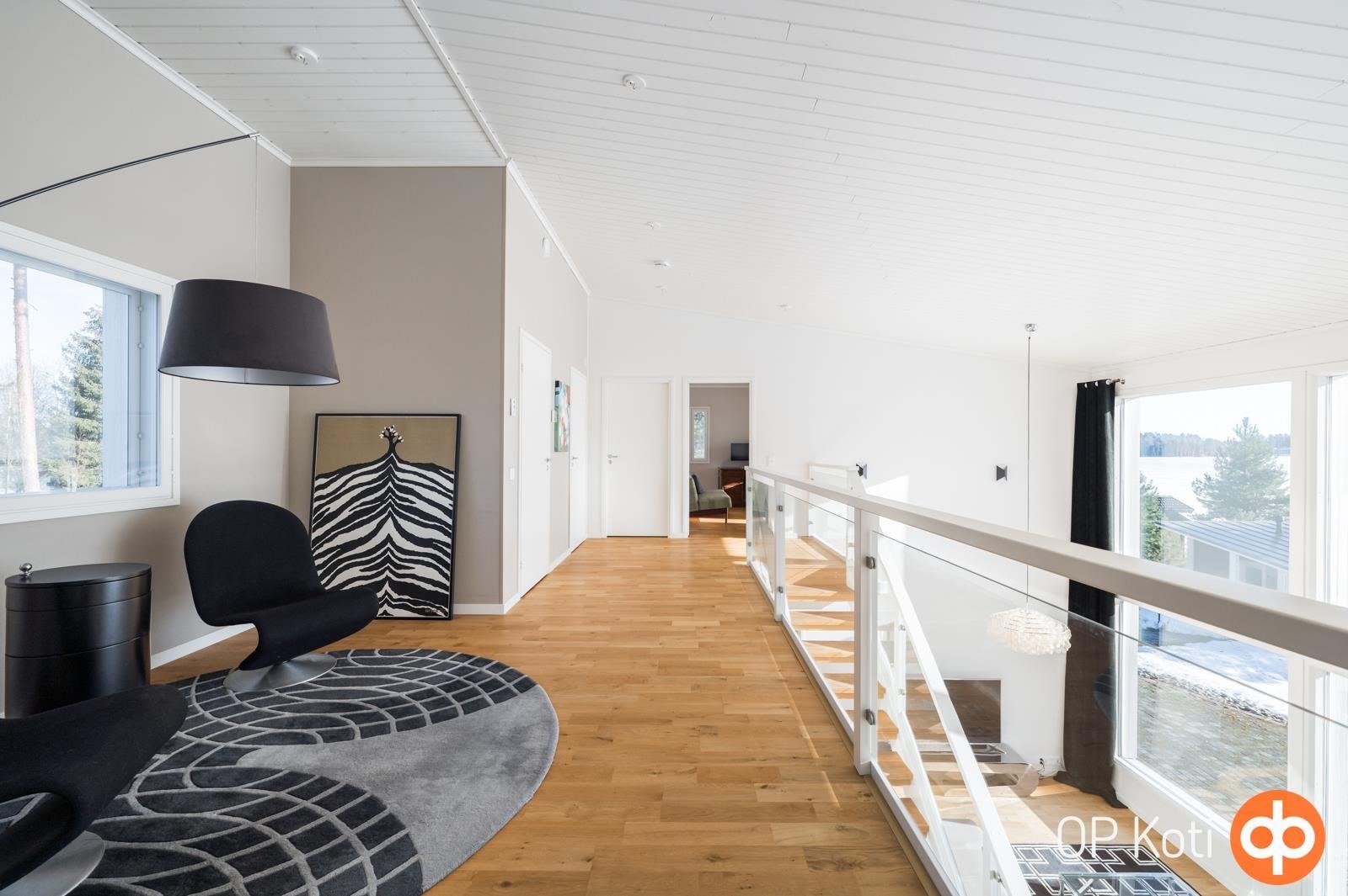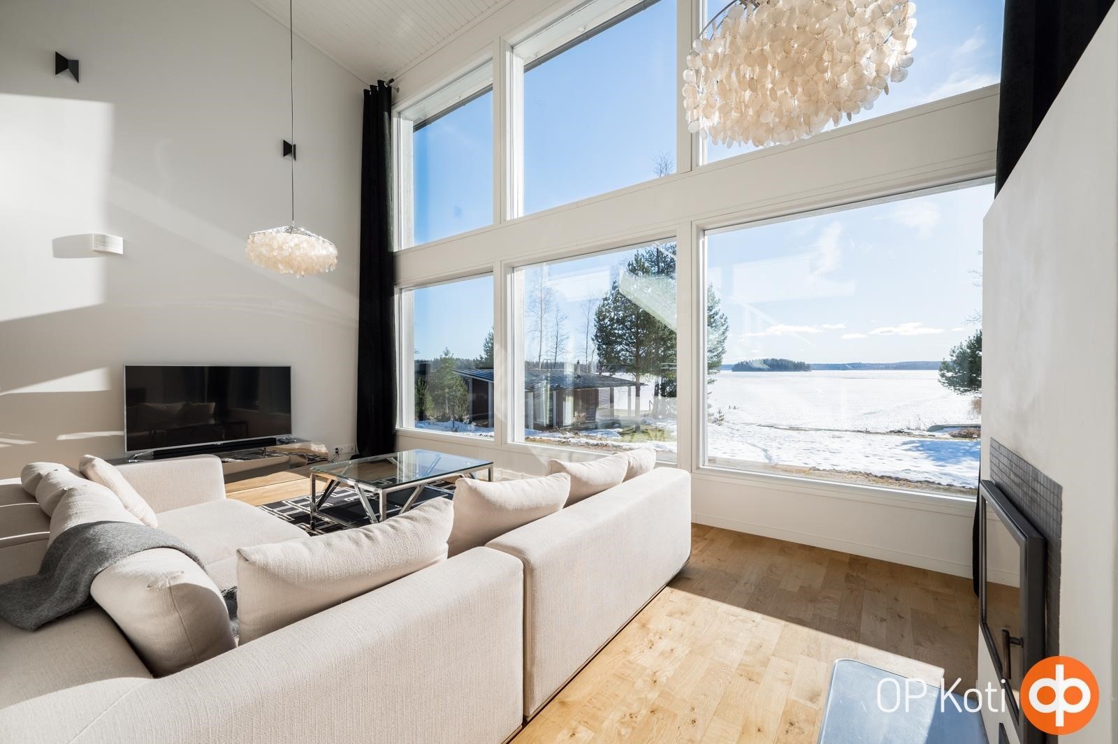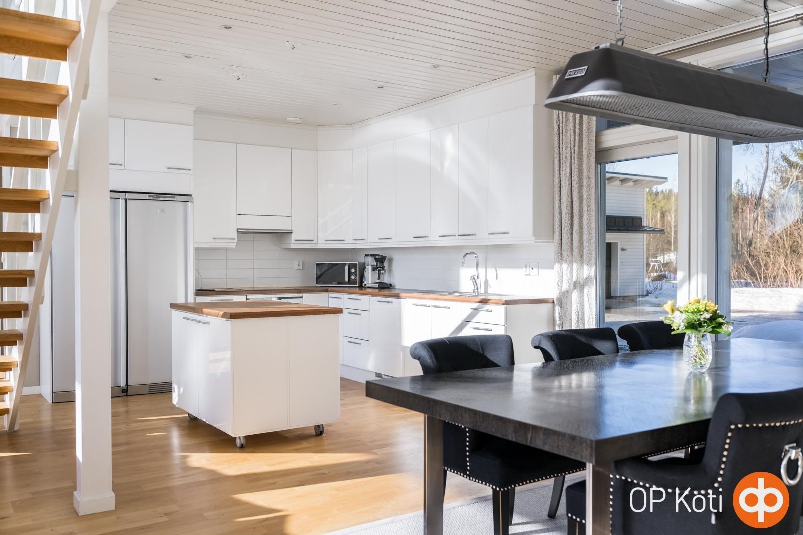 Kodissa suuret, lattiasta kattoon ulottuvat ikkunapinnat avaavat näkymät suoraan järvelle ja tuovat luonnon osaksi sisätiloja kaikkina vuodenaikoina. Valoisat ja avarat oleskelutilat muodostavat harmonisen kokonaisuuden, jossa moderni arkkitehtuuri ja järvimaisema täydentävät toisiaan.