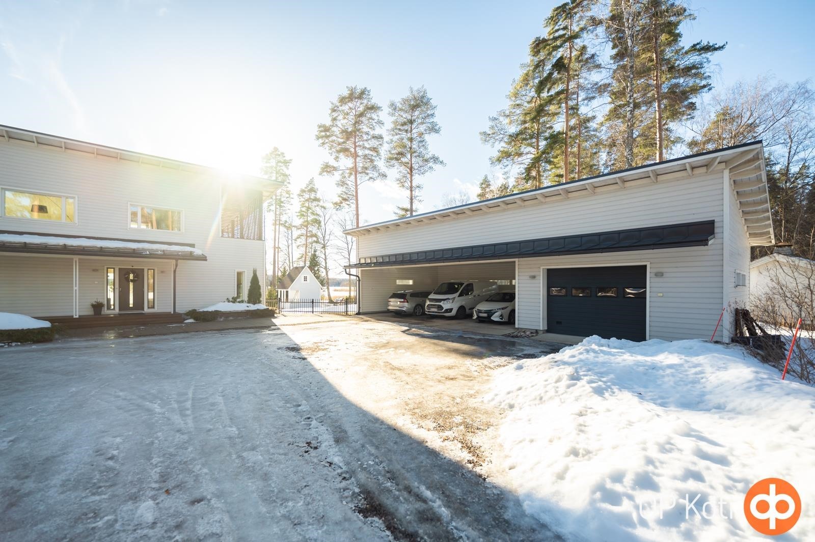 Huolitellussa pihapiirissä sijaitsevat autotalli sekä sen yhteydessä autokatos kolmelle autolle, jotka tarjoavat runsaasti tilaa niin autoille kuin harrastusvälineille.