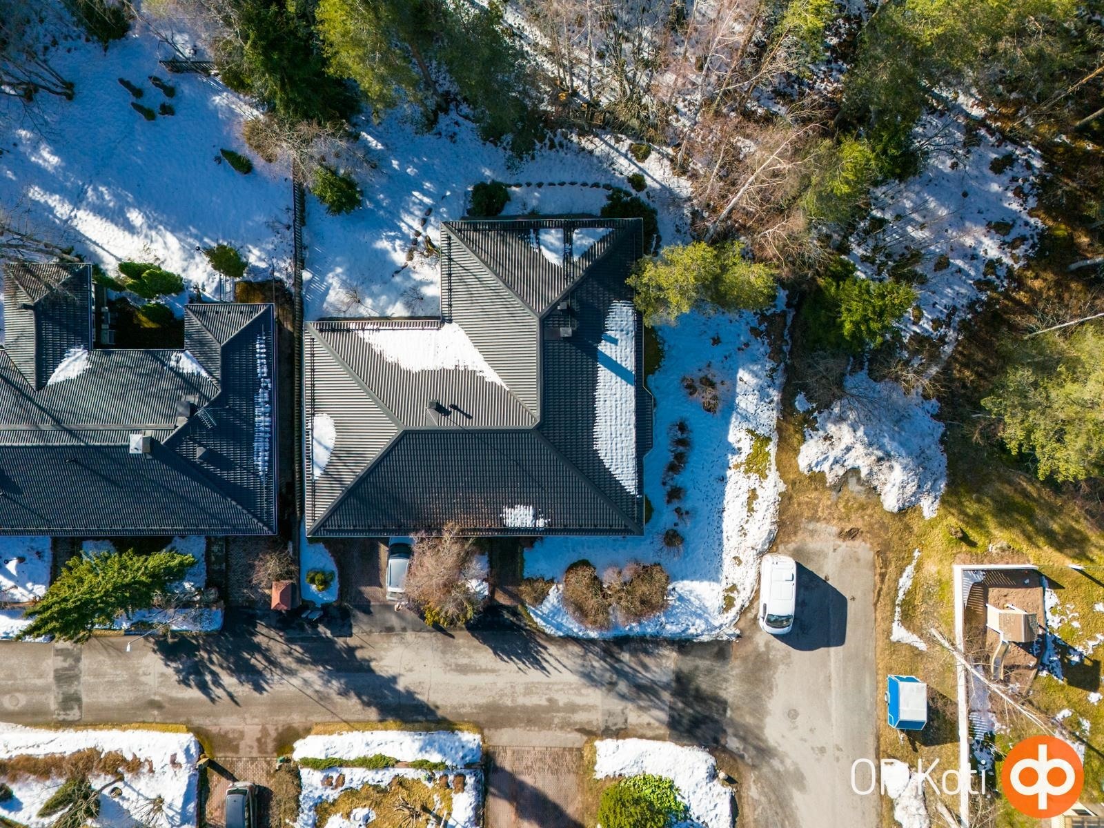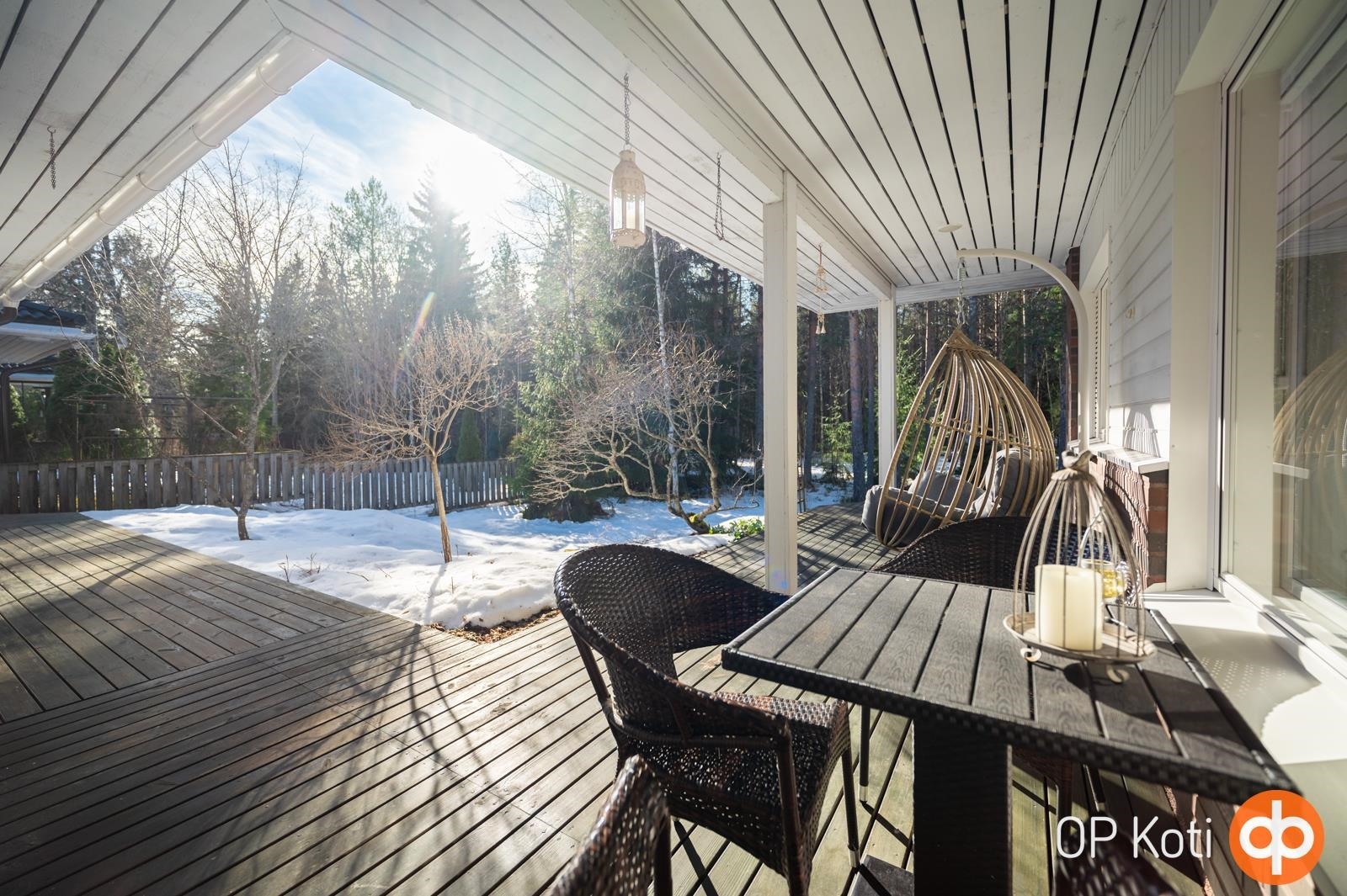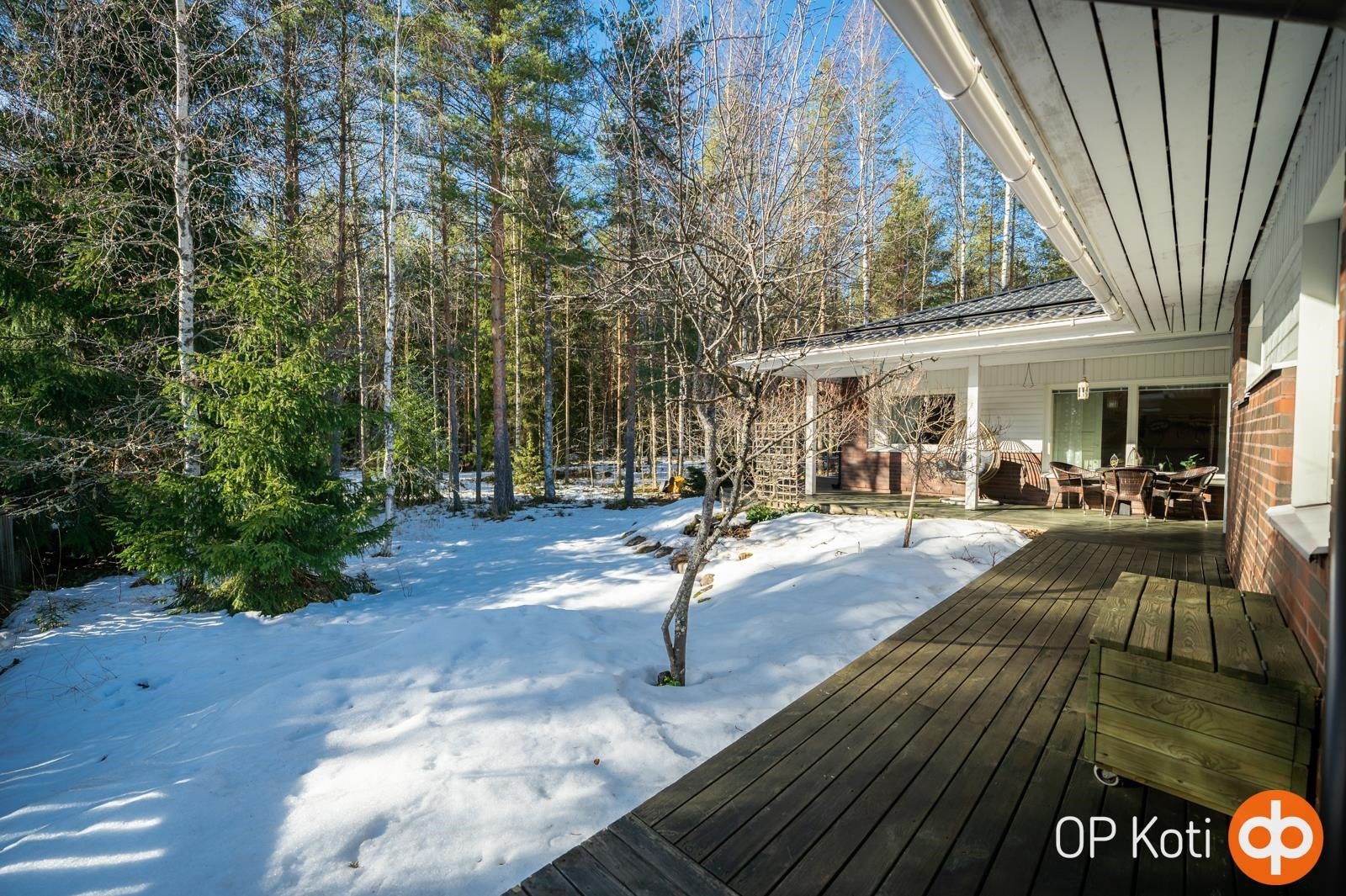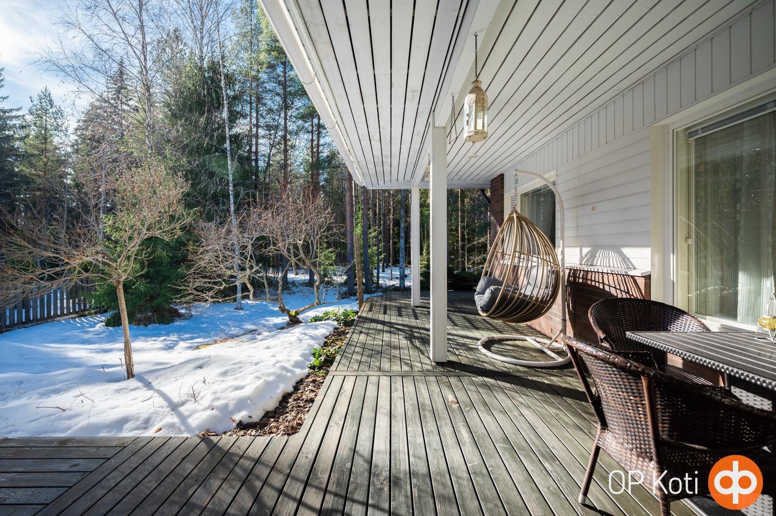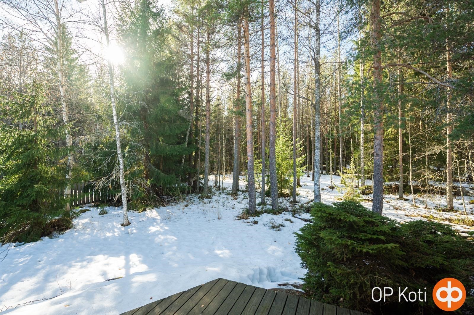Asunto sijaitsee kulmatontilla, jossa on vain yksi rajanaapuri tarjoten mukavasti omaa rauhaa. Suojaisa ja viihtyisä takapiha rajoittuu metsään, luoden luonnonläheisen ja rauhallisen ympäristön. Iso kahden auton talli sekä varastotilat tarjoavat runsaasti säilytys- ja harrastetilaa.