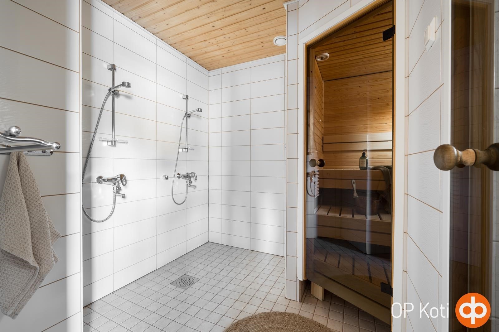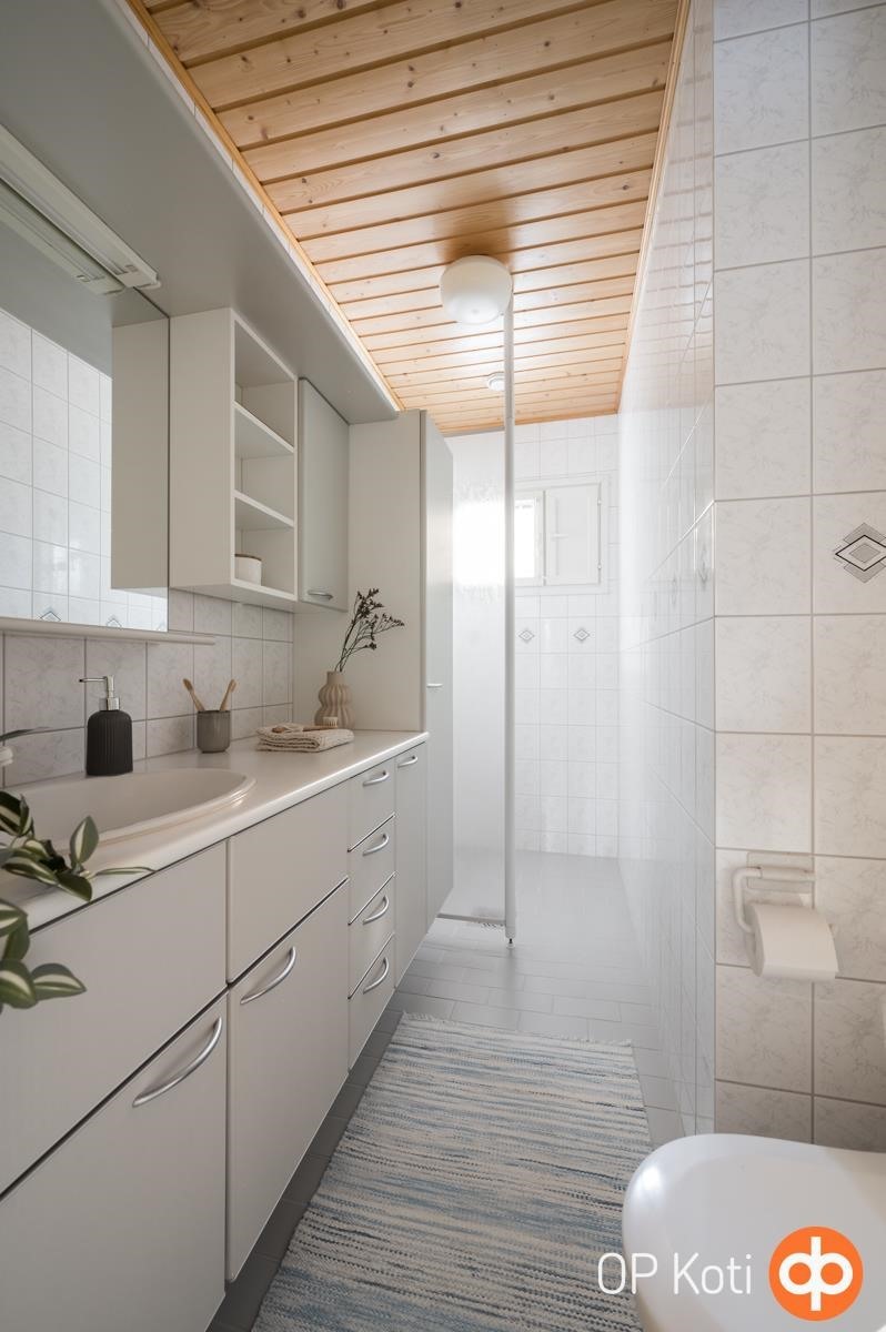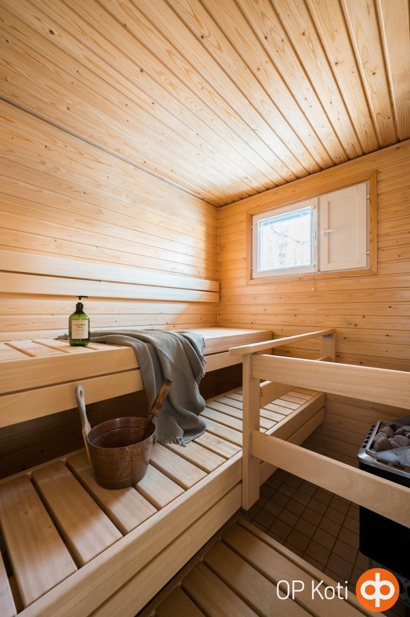 - Sauna, sähkökiuas, kylpyhuone lattialaatoitus osittain kopoa., erillinen wc, suihku, peilikaappi, kaapit, allaskaappi, pesukoneliitäntä, lattialämmitys Sähköinen lattialämmitys mm. märkätilat, wc, keittiö, tkh, khh, tk, kiinteät valaisimet.