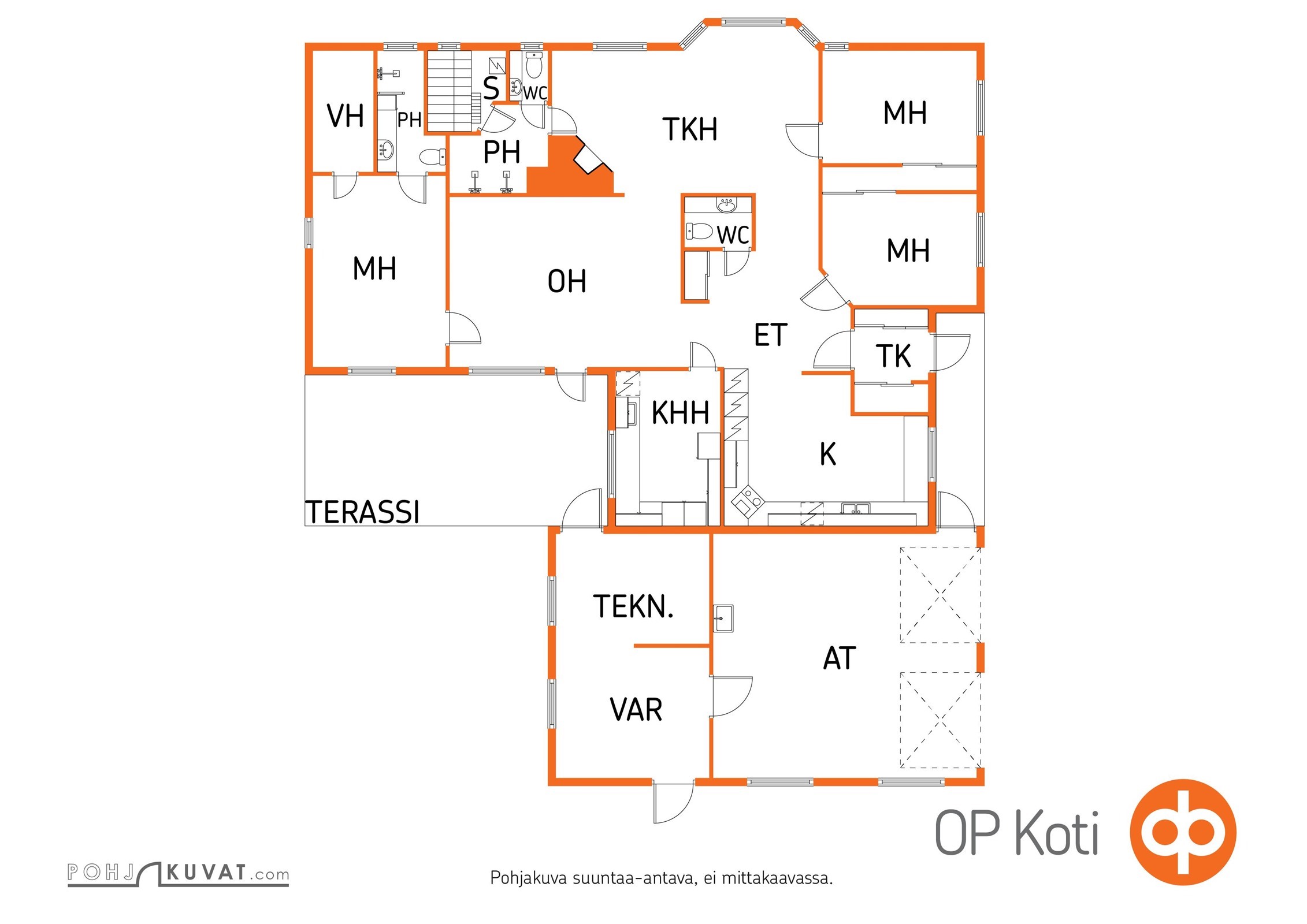 - 3mh, tkh, oh, k, ruokailutila, ph, s, 2wc, kph, khh, terassi, 2 auton talli ja varastotilat
