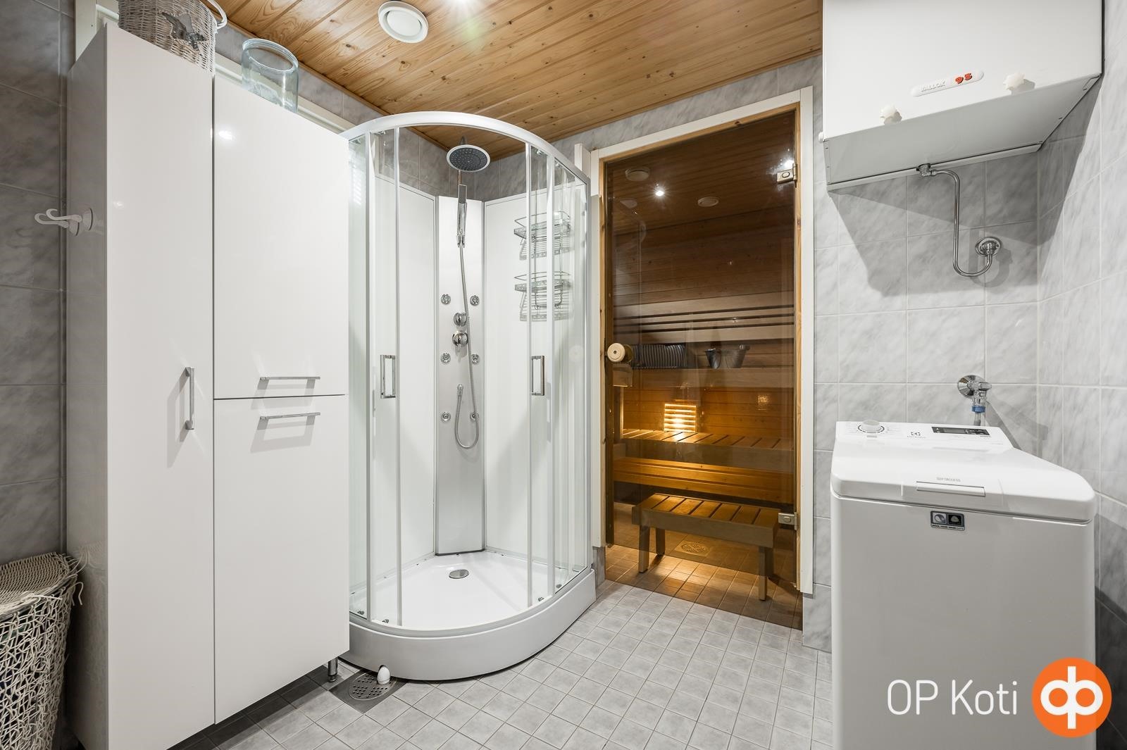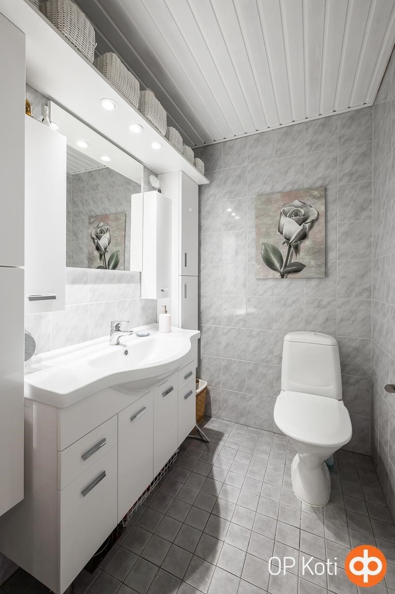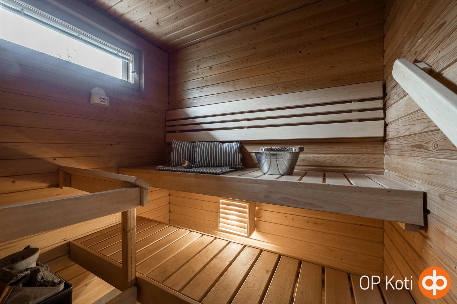 - Sauna, sähkökiuas, kylpyhuone, erillinen wc, suihkukaappi, peilikaappi, pesukoneliitäntä, lattialämmitys, kiinteät valaisimet.