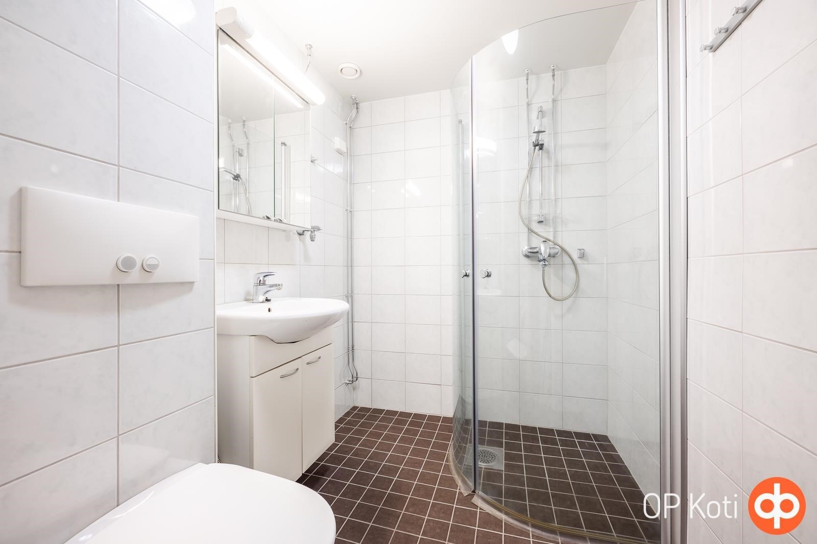 - Kylpyhuone, suihku, suihkukaappi, peilikaappi, kaapit, allaskaappi, pesukoneliitäntä kph, lattialämmitys, kiinteät valaisimet.