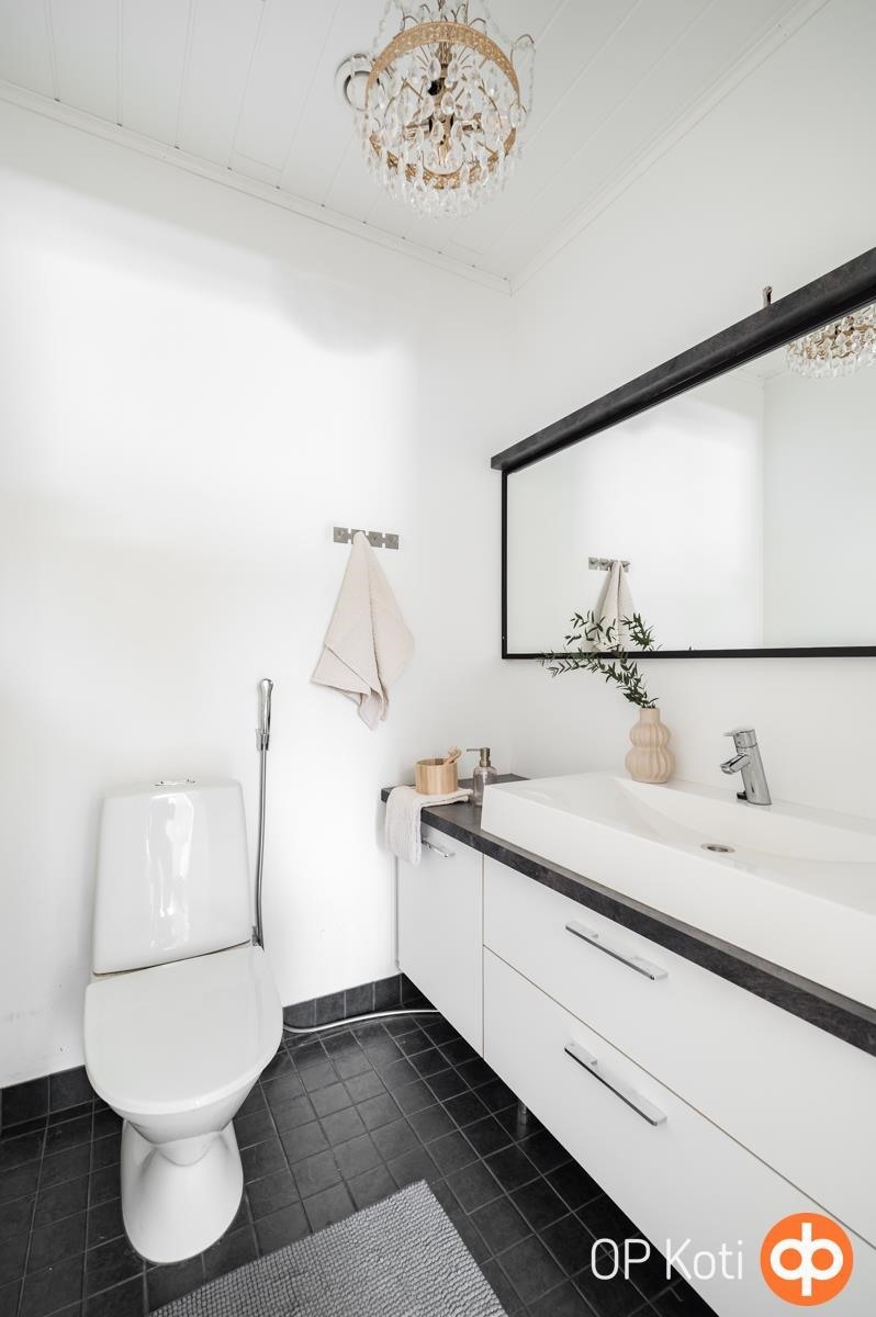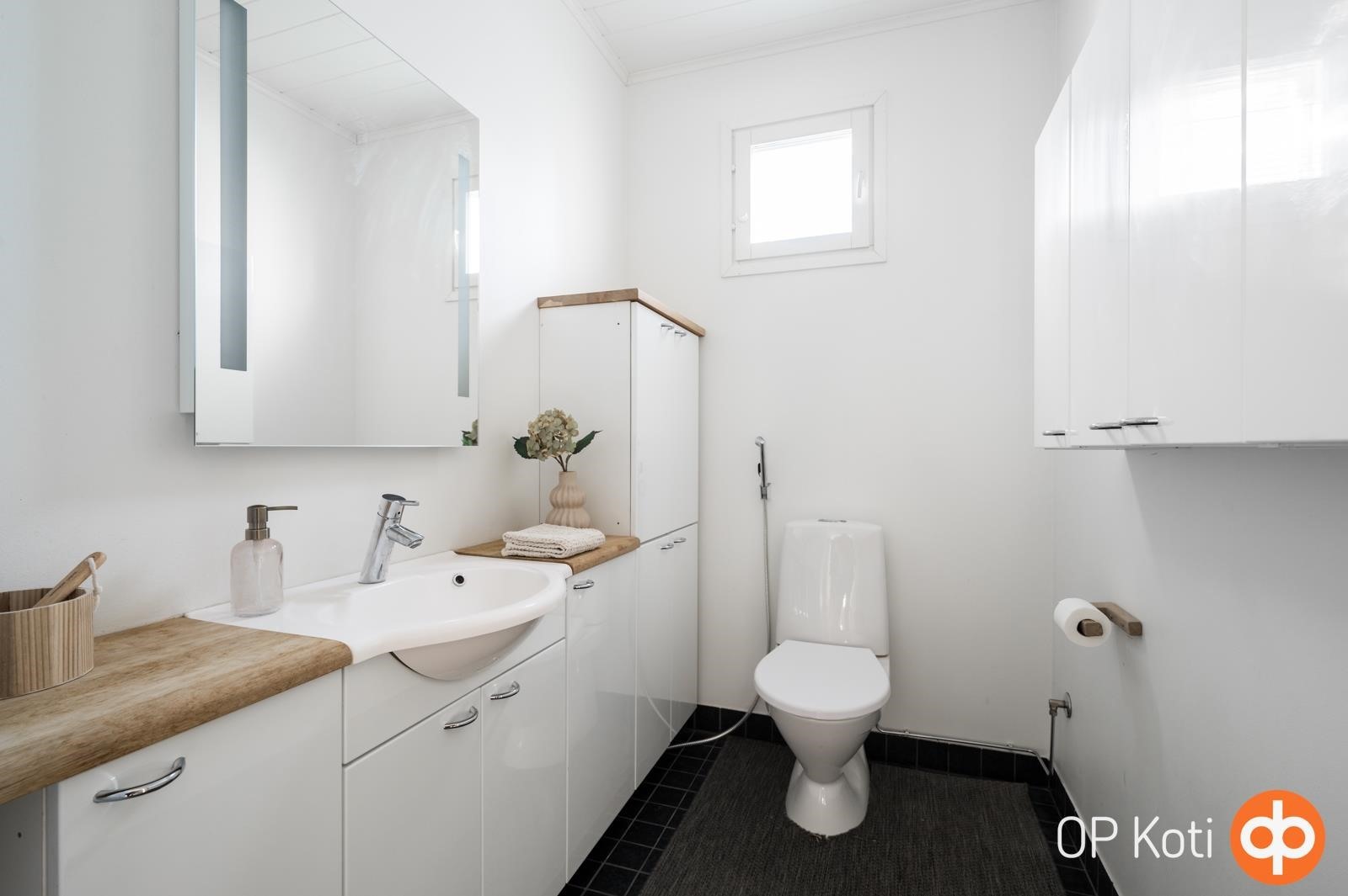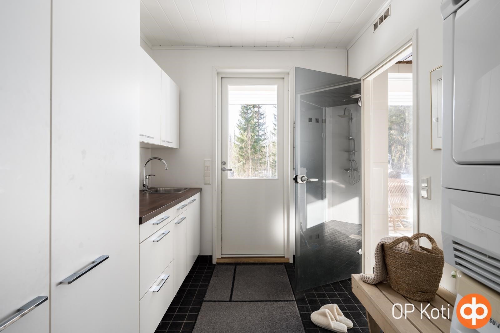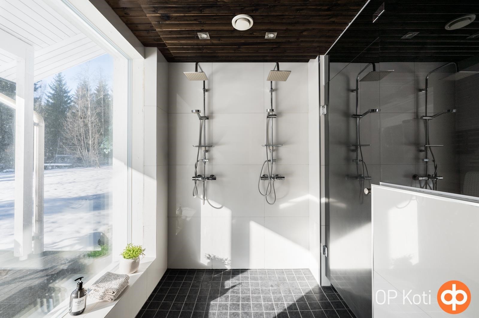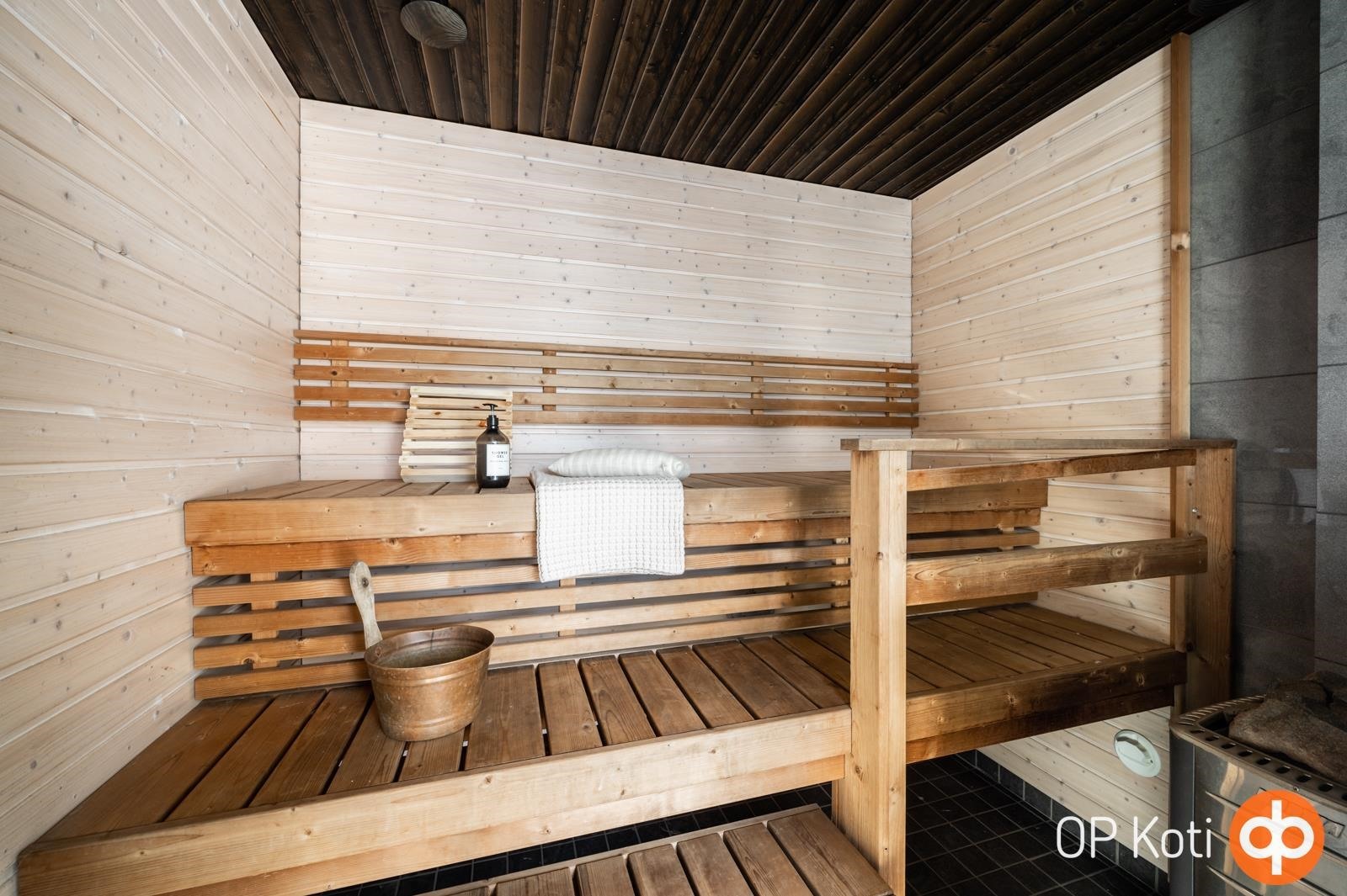- Sauna, puukiuas (varaus myös sähkökiukaalle), kylpyhuone, erillinen wc (2 kpl), suihku (2 kpl), peilit, kaapit, allaskaappi, pesukoneliitäntä, lattialämmitys, kiinteät valaisimet.