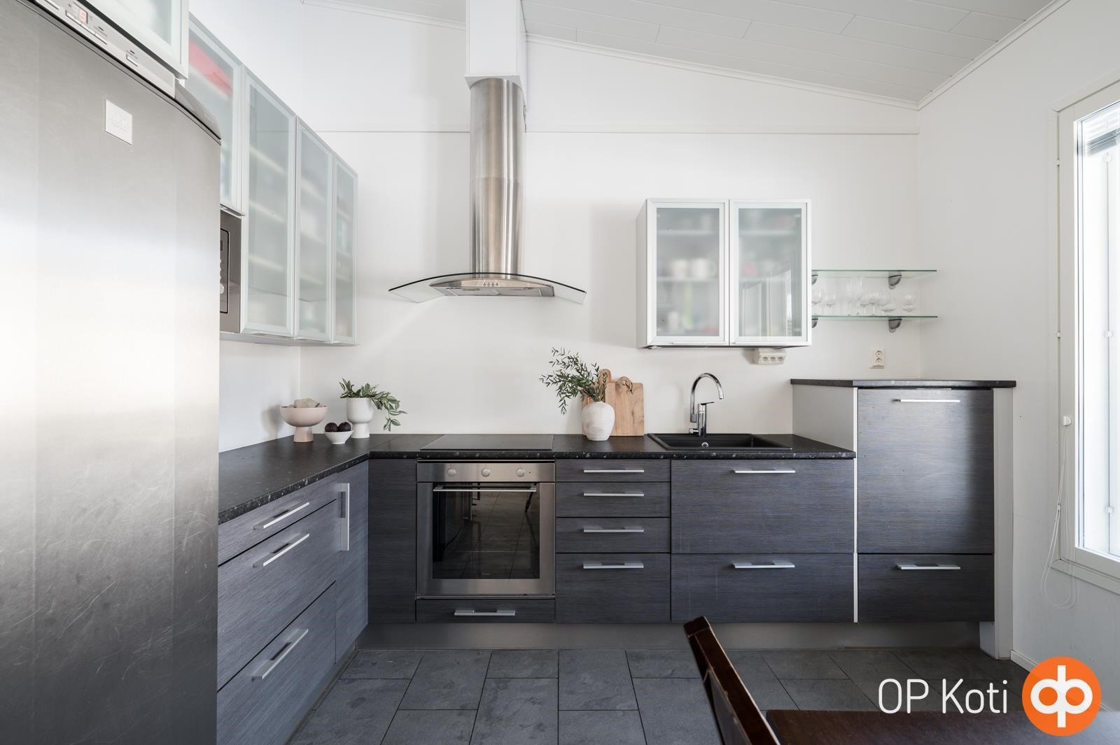 - Jääkaappi, pakastekaappi, erillisuuni, induktioliesi, liesituuletin, mikroaaltouuni, astianpesukone, kaapistot, kiinteät valaisimet.