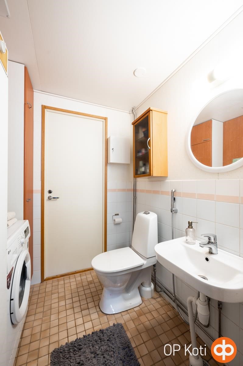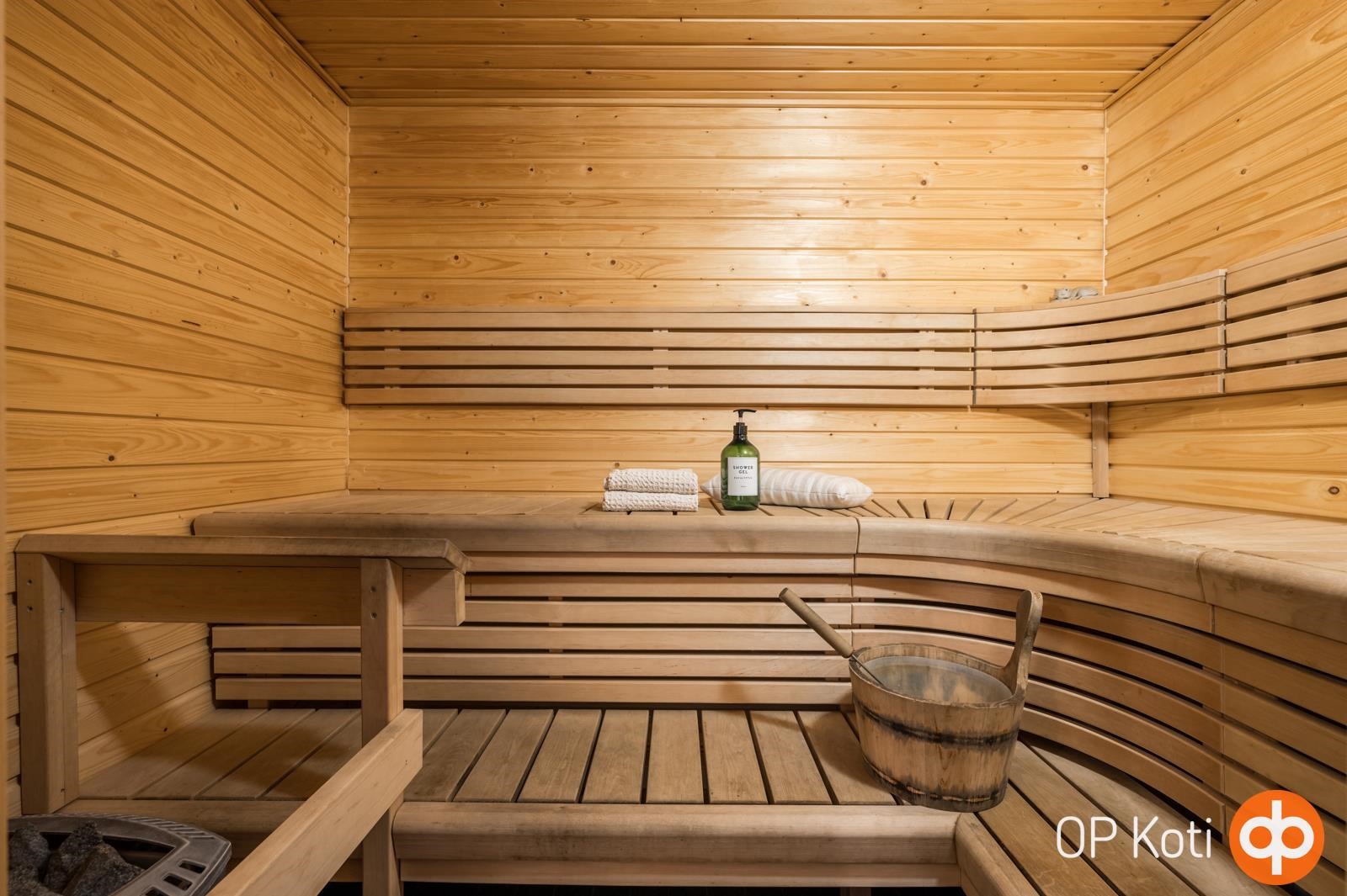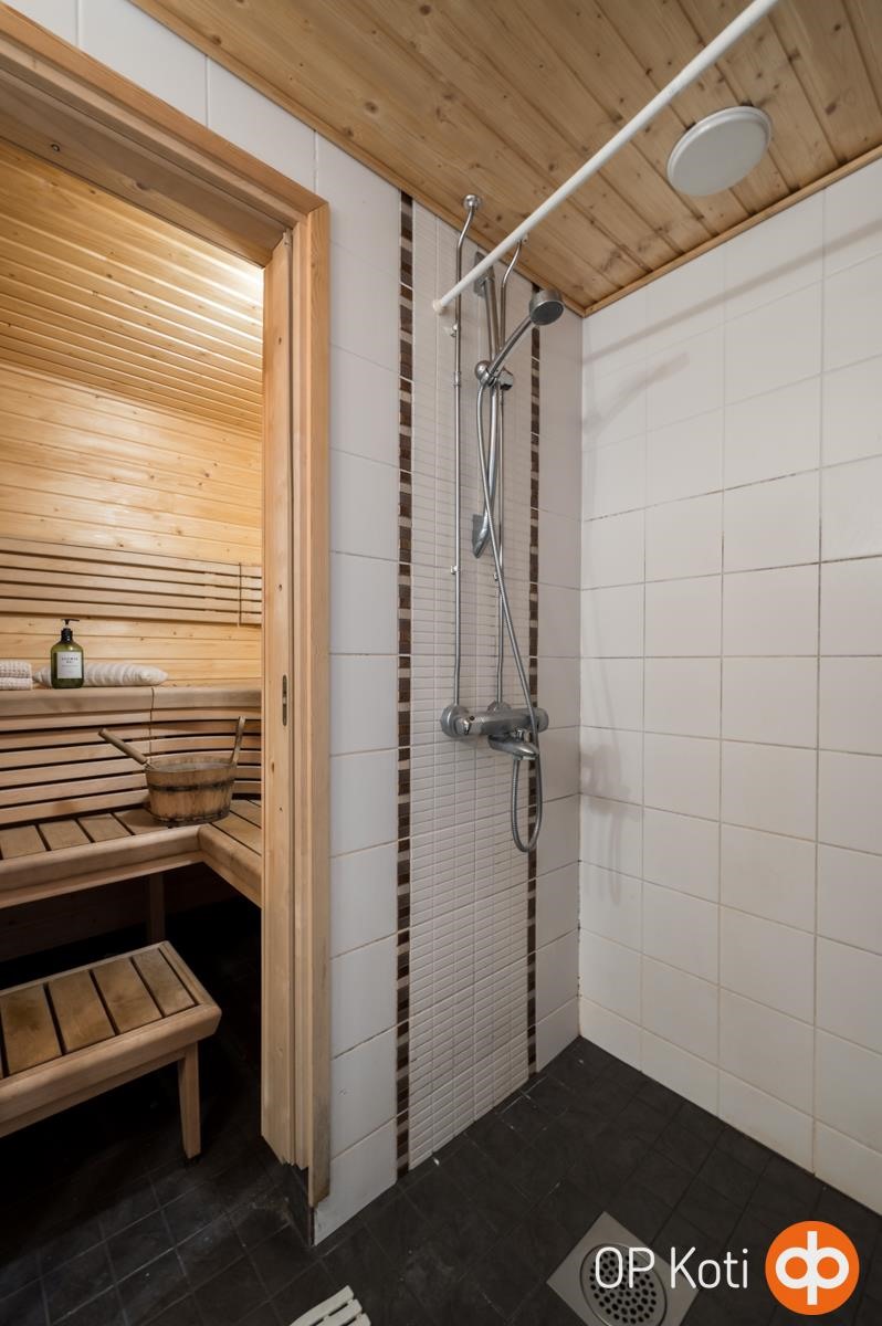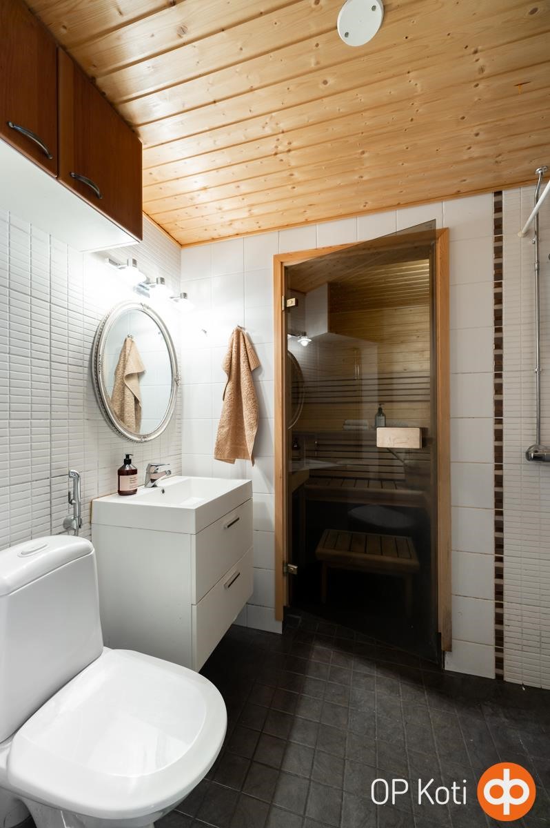 - Sauna, sähkökiuas, kylpyhuone, erillinen wc, suihku, peilit, kaapit, allaskaappi, pesukoneliitäntä, kiinteät valaisimet.