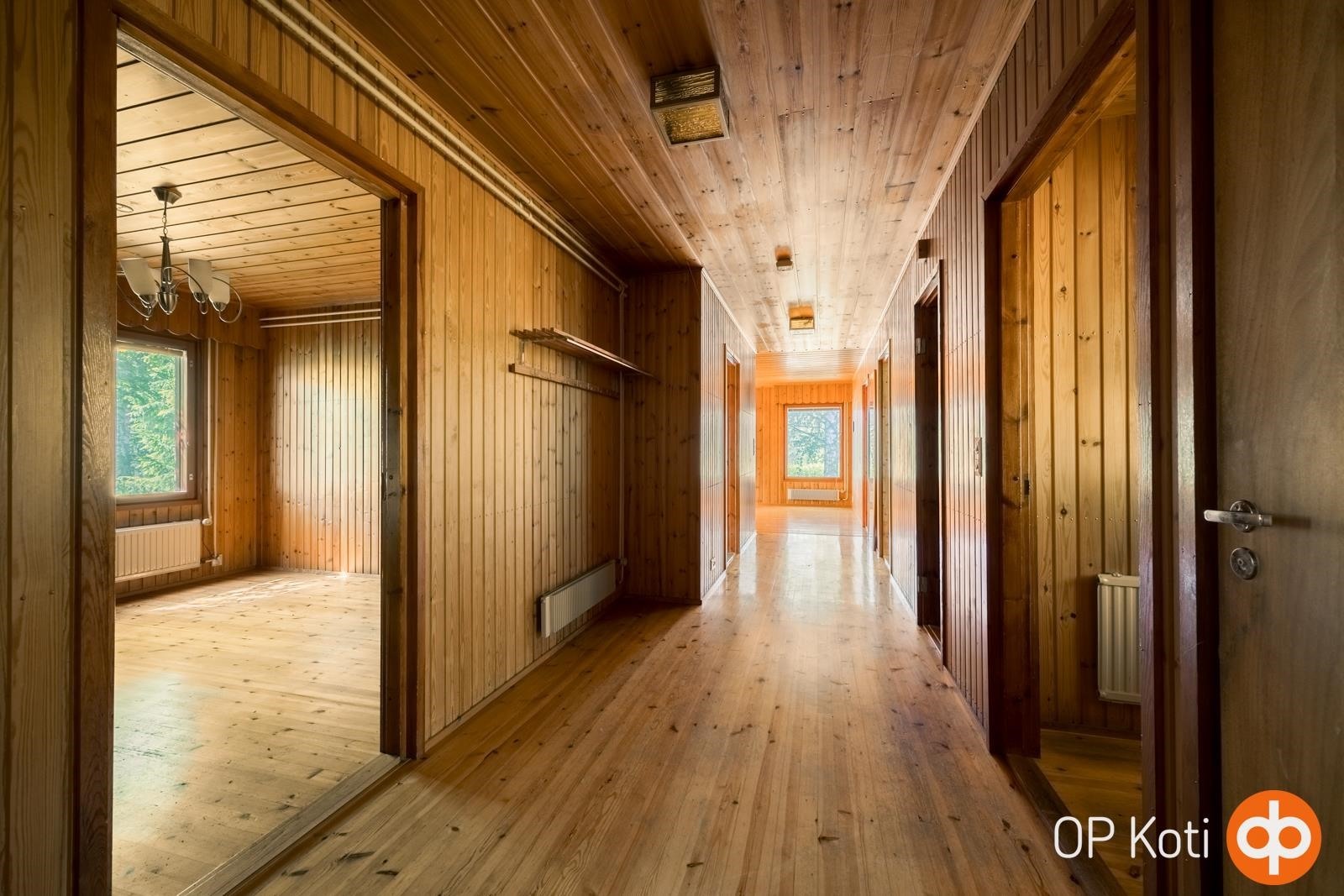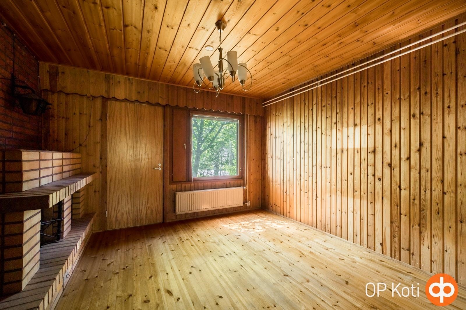 Kylpyhuone: laatoitettu. Wc: lattiamatto, levyseinät. Huoneisto: parkettilattia, paneloidut/levytetyt seinät, paneelikatto.