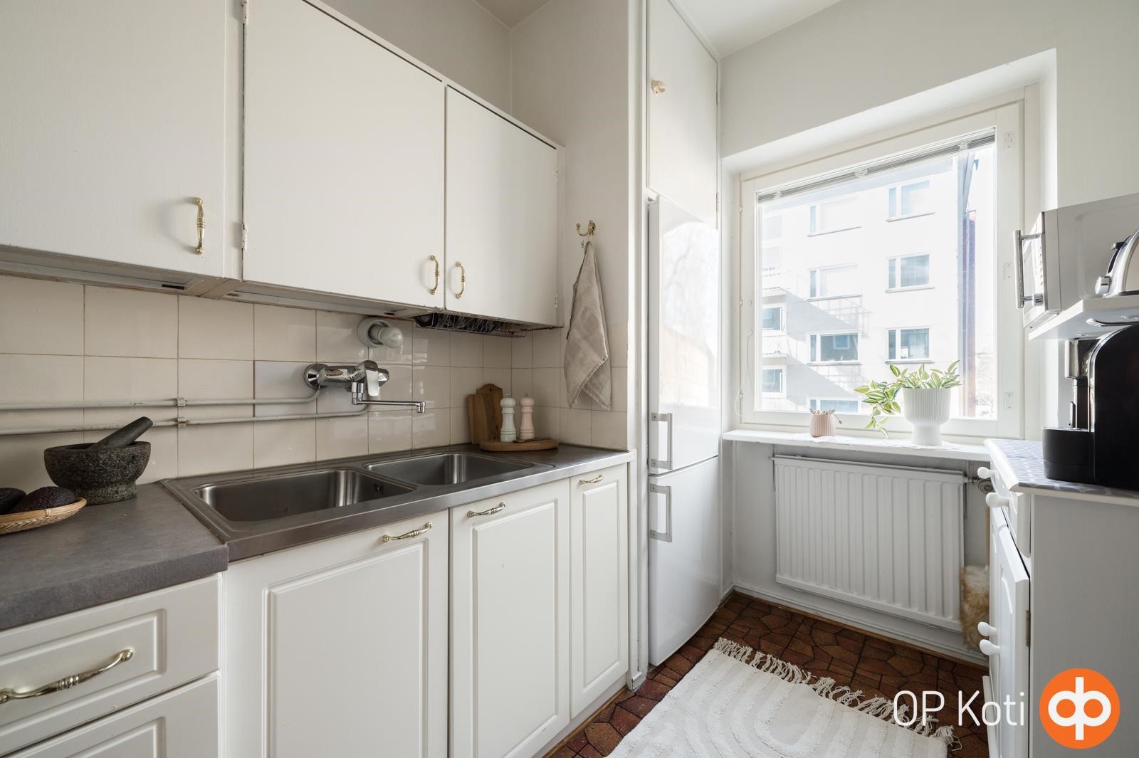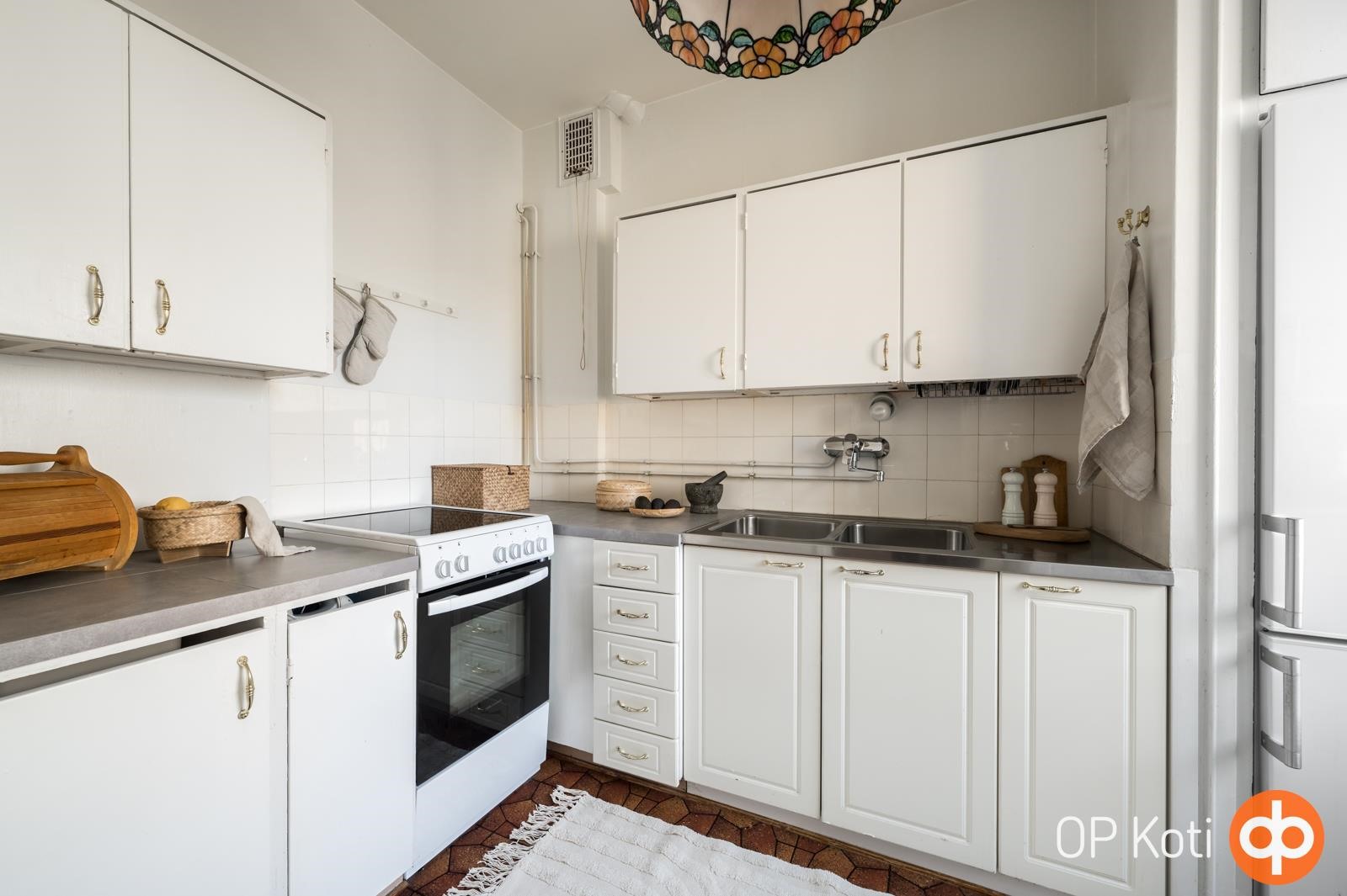 - Jääkaappipakastin, keraaminen liesi, kaapistot, kiinteät valaisimet.