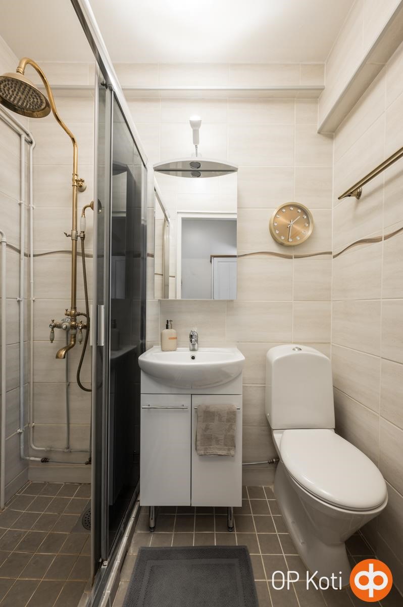 - Kylpyhuone, suihku, suihkukaappi, peilikaappi, allaskaappi, pesukoneliitäntä, kiinteät valaisimet.