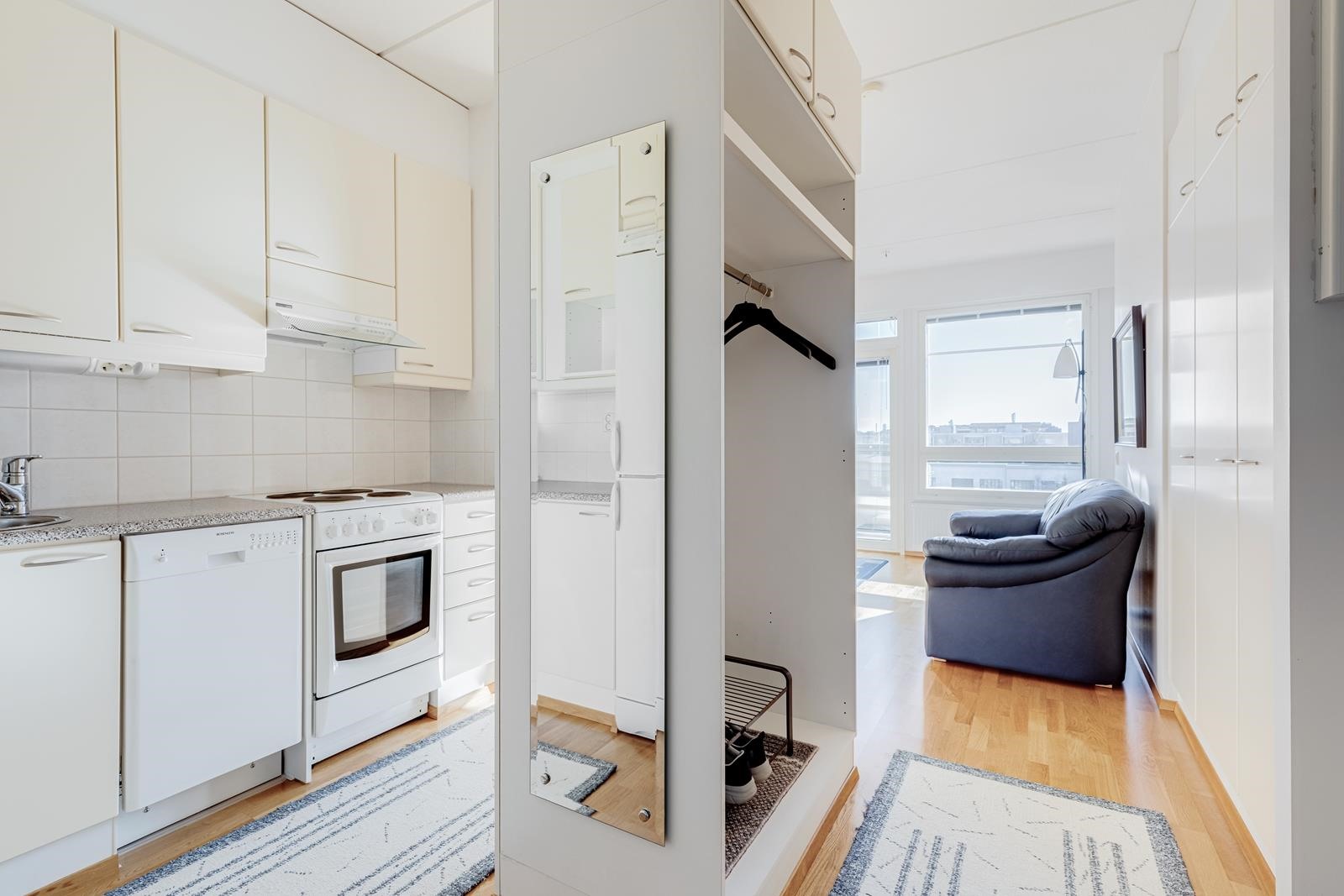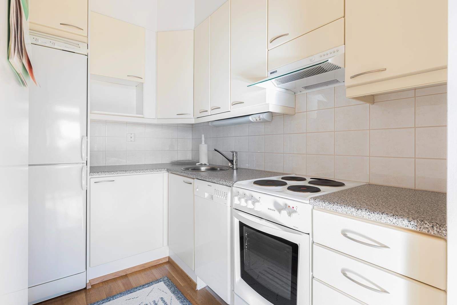 - Jääkaappipakastin, sähköliesi, liesituuletin, astianpesukone.