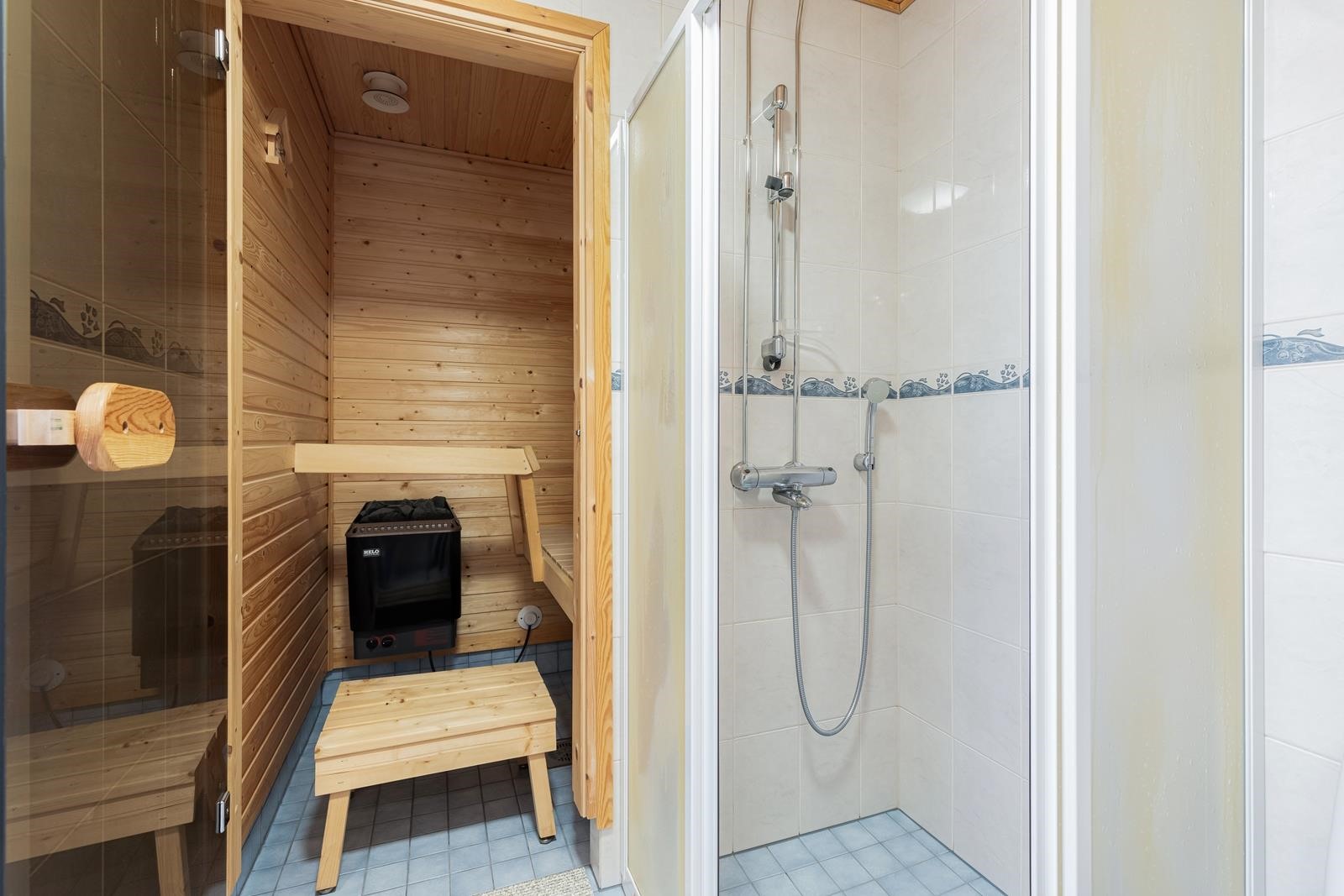 - Sauna, sähkökiuas, kylpyhuone, peilikaappi, pesukoneliitäntä, lattialämmitys.