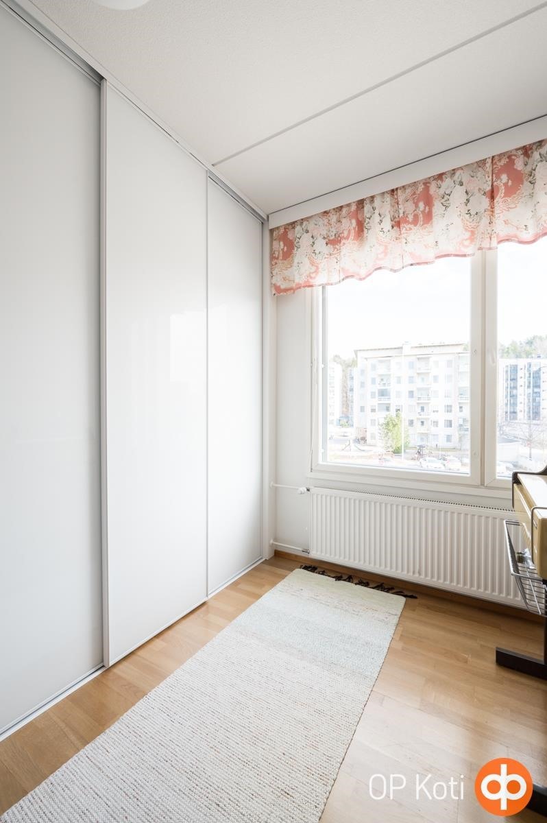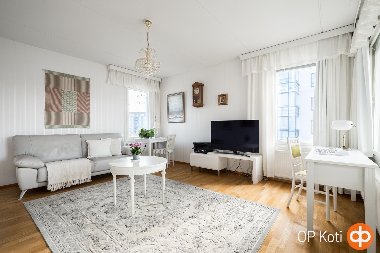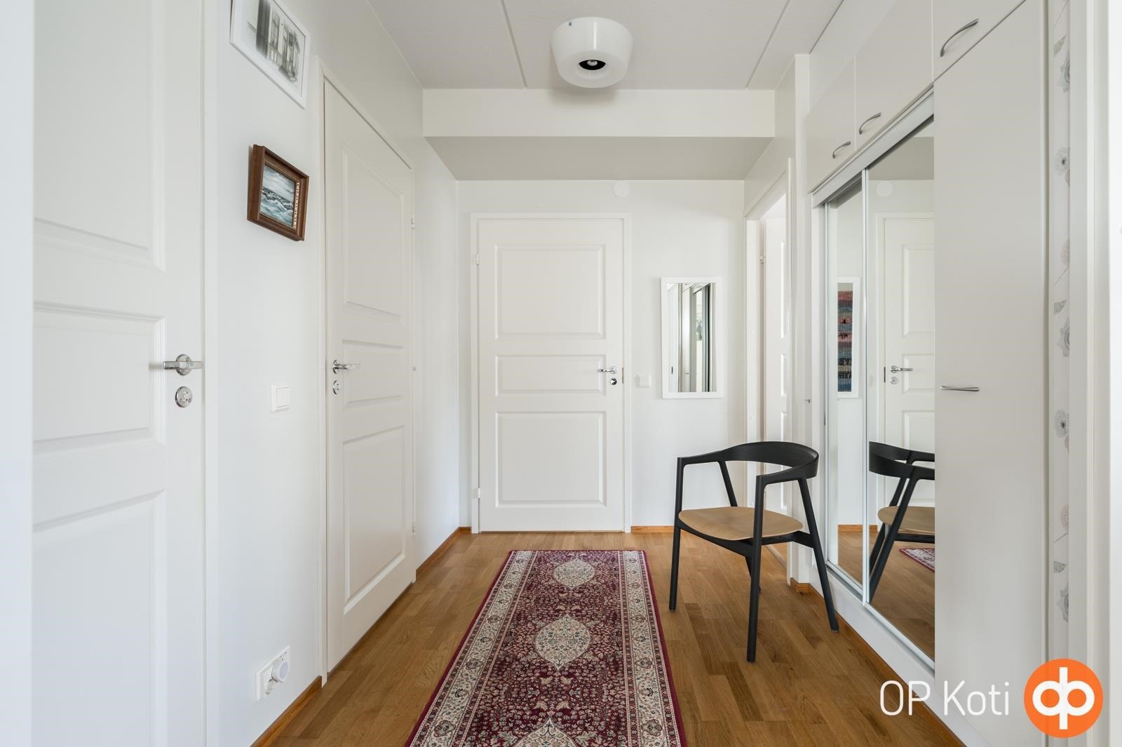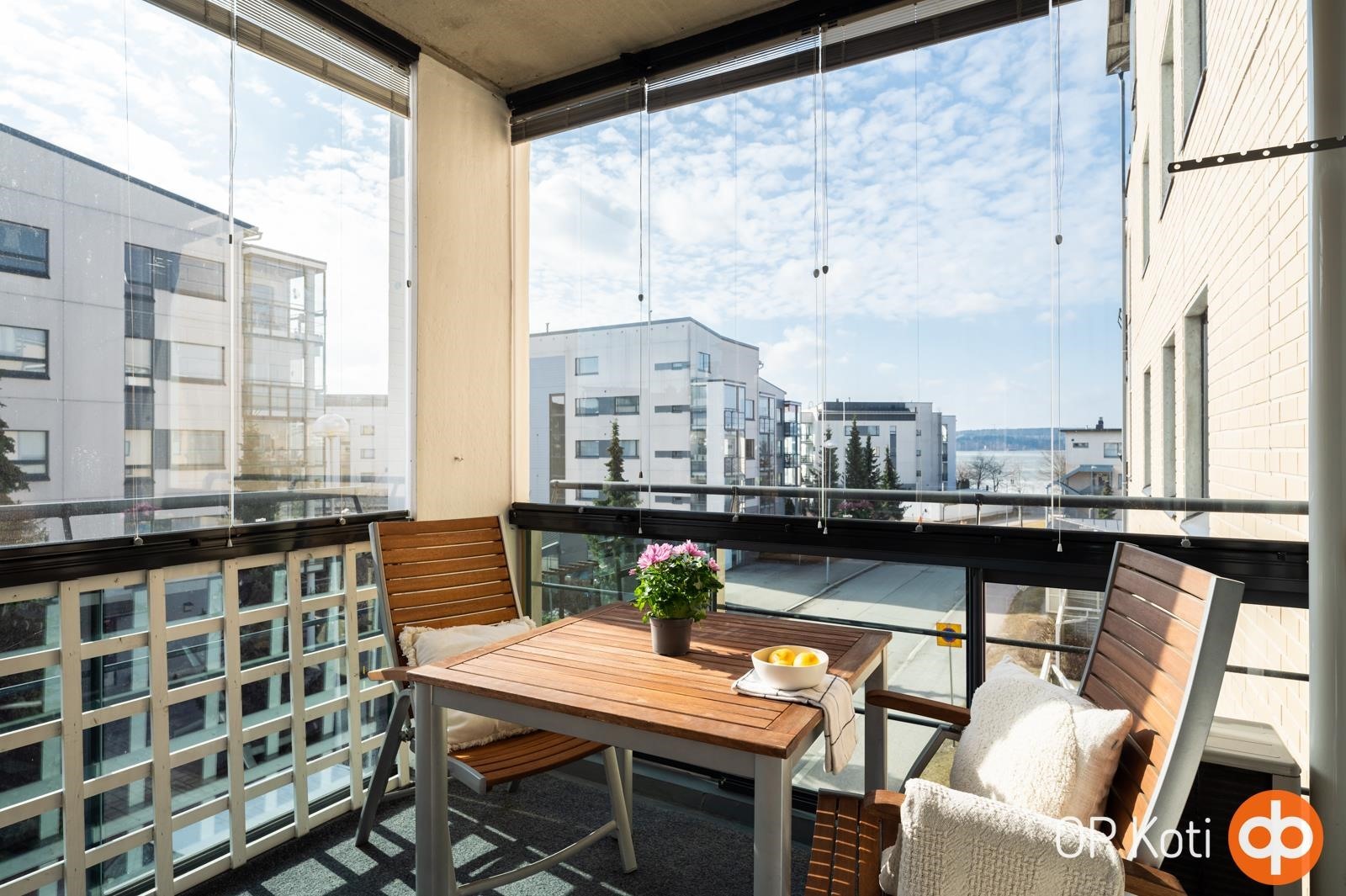 Asunnossa on toimiva pohjaratkaisu: kaksi makuuhuonetta, tilava olohuone, erillinen wc, kylpyhuone, sauna sekä hyvin suunniteltu keittiö. Keittiö on remontoitu kokonaisuudessaan vuonna 2019, ja erillinen wc on saanut uudet kalusteet vuonna 2020. Toiseen makuuhuoneeseen asennettiin vuonna 2025 uudet liukuovikaapistot, jotka tuovat reilusti säilytystilaa. Muilta osin asunto on alkuperäisessä mutta siistissä kunnossa, ja huoneistoa on päivitetty mm. seinätapetein. Tilava lasitettu parveke toimii lähes lisähuoneena suuren osan vuodesta.