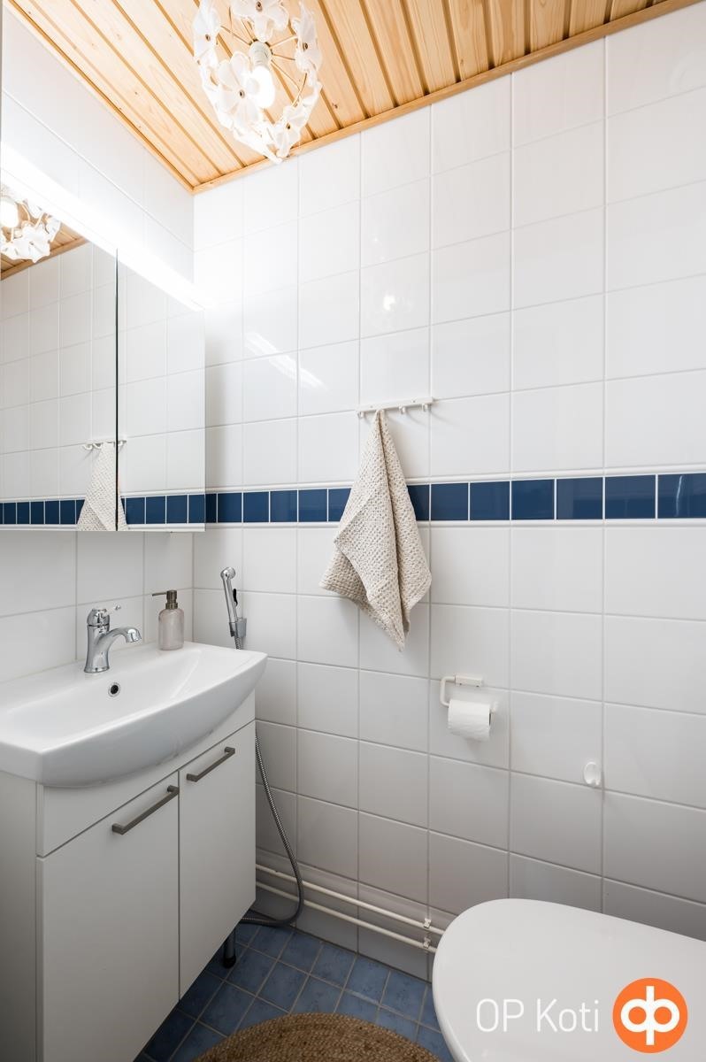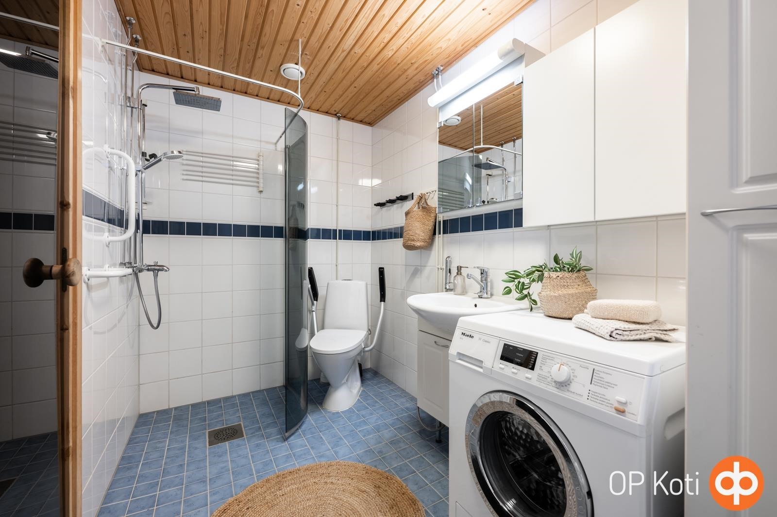 - Sauna, sähkökiuas, kylpyhuone, erillinen wc, suihku, suihkuseinä, peilit, peilikaappi, kaapit, allaskaappi, pesukoneliitäntä, lattialämmitys vesikiertoinen, kiinteät valaisimet.