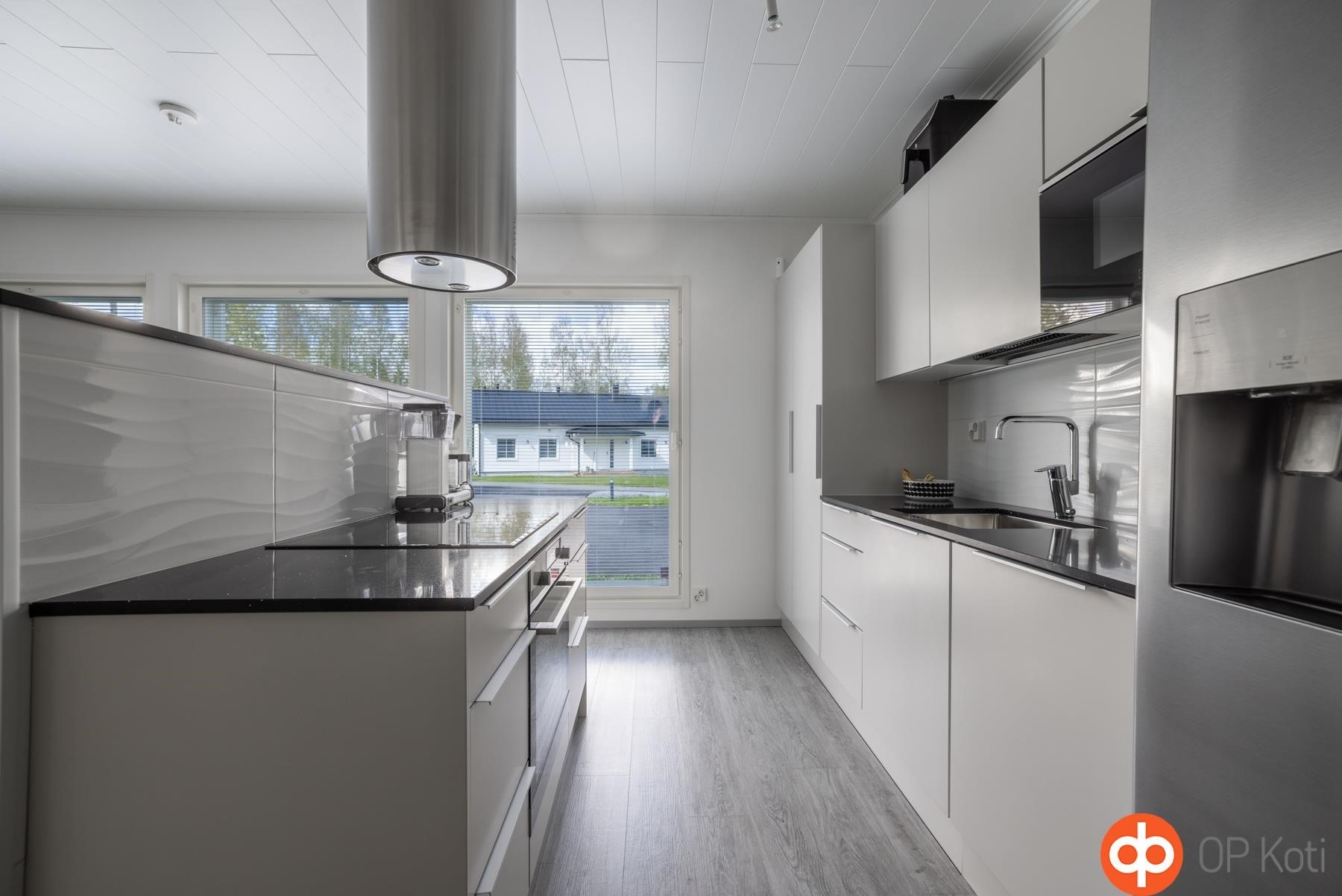 - Jääkaappipakastin, induktioliesi, liesituuletin, mikroaaltouuni, astianpesukone, kaapistot, kiinteät valaisimet, pöytätasojen materiaali kivi.