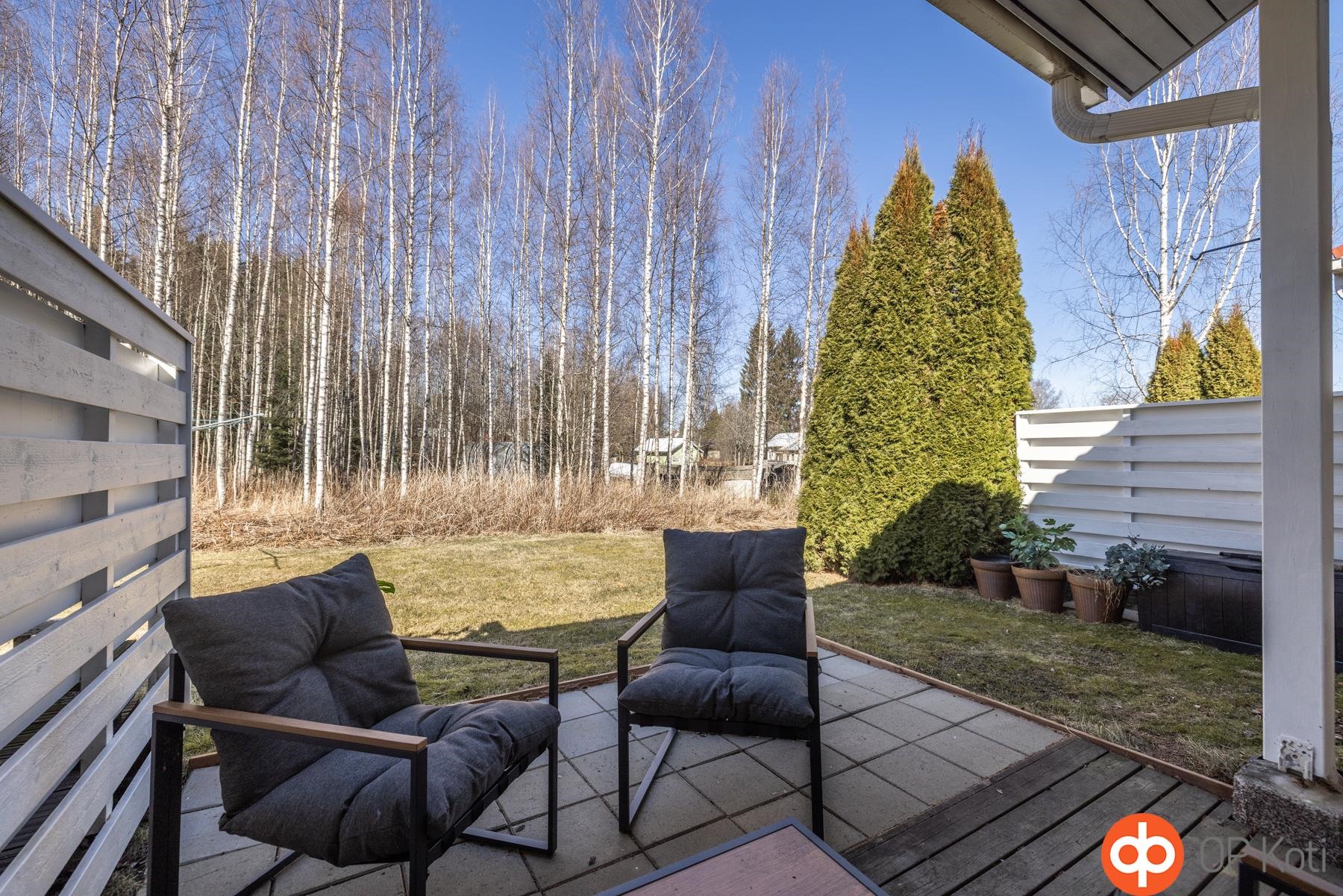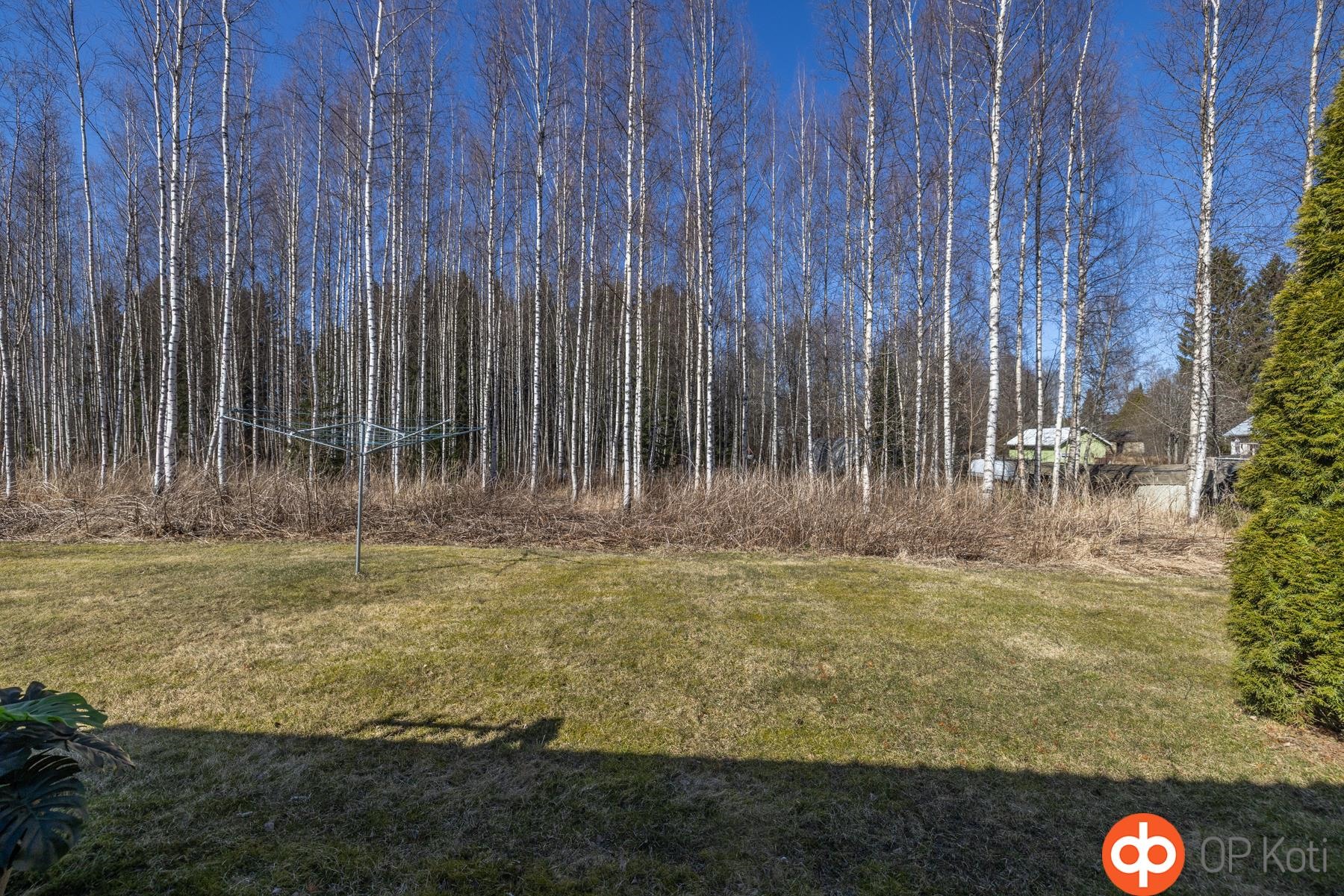 Olohuoneesta avautuu kulku tilavalle pihalle, joka rajoittuu suoraan metsään - täällä nautit omasta rauhasta, luonnon läheisyydestä ja vehreistä näkymistä. Piha tarjoaa loistavat puitteet niin rentoutumiseen, lasten leikkeihin kuin kesäisiin illanviettoihin.