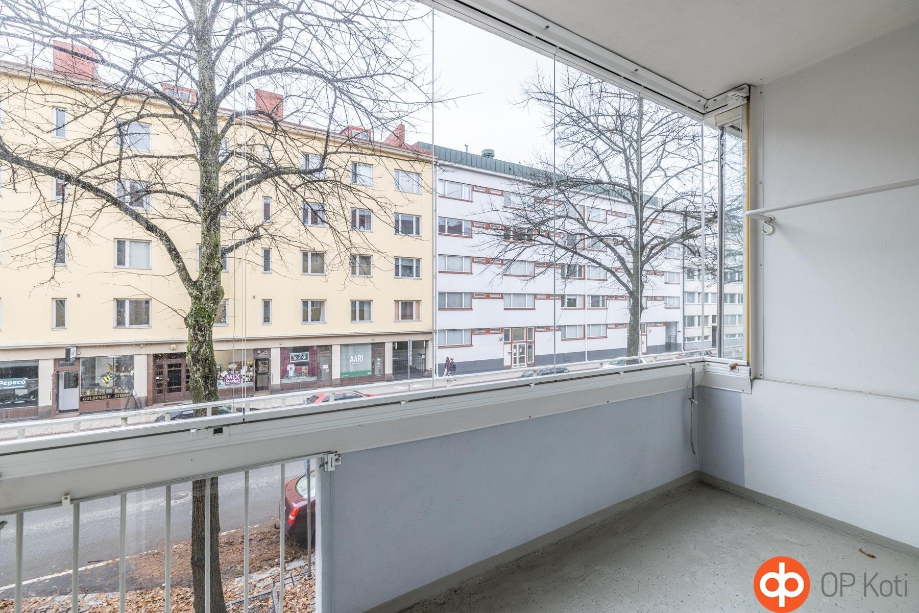 - Parveke Hämeentielle päin. Makuuhuoneet ja keittiön ikkunat sisäpihalle.