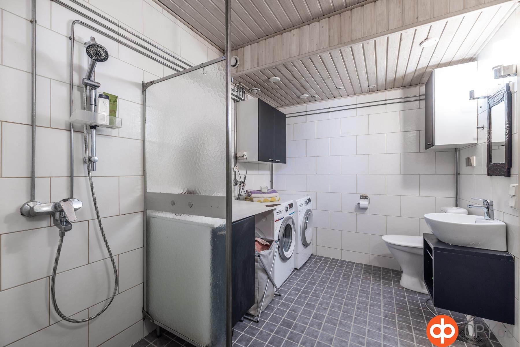 - Sauna, sähkökiuas, kylpyhuone, suihku, suihkuseinä, peilit, kaapit, allaskaappi, pesukoneliitäntä, lattialämmitys, kiinteät valaisimet. Kylpyhuone remontoitu 2010.