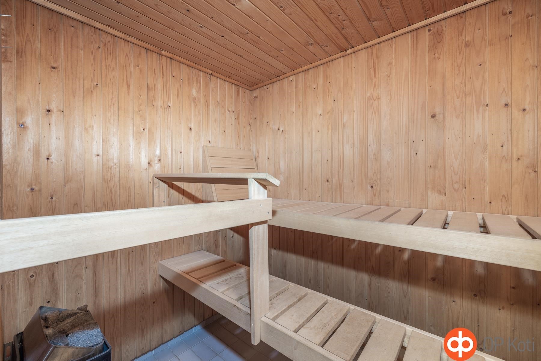 - Sauna, sähkökiuas, kylpyhuone, erillinen wc, suihku, peilikaappi, pesukoneliitäntä, kiinteät valaisimet.