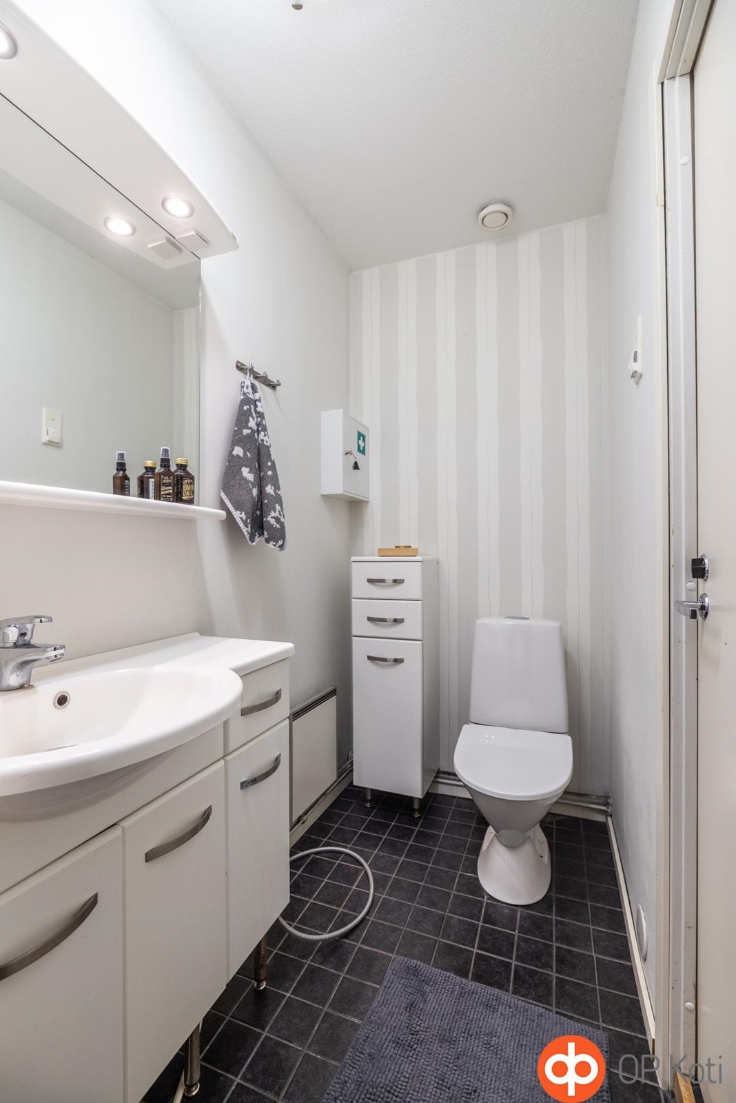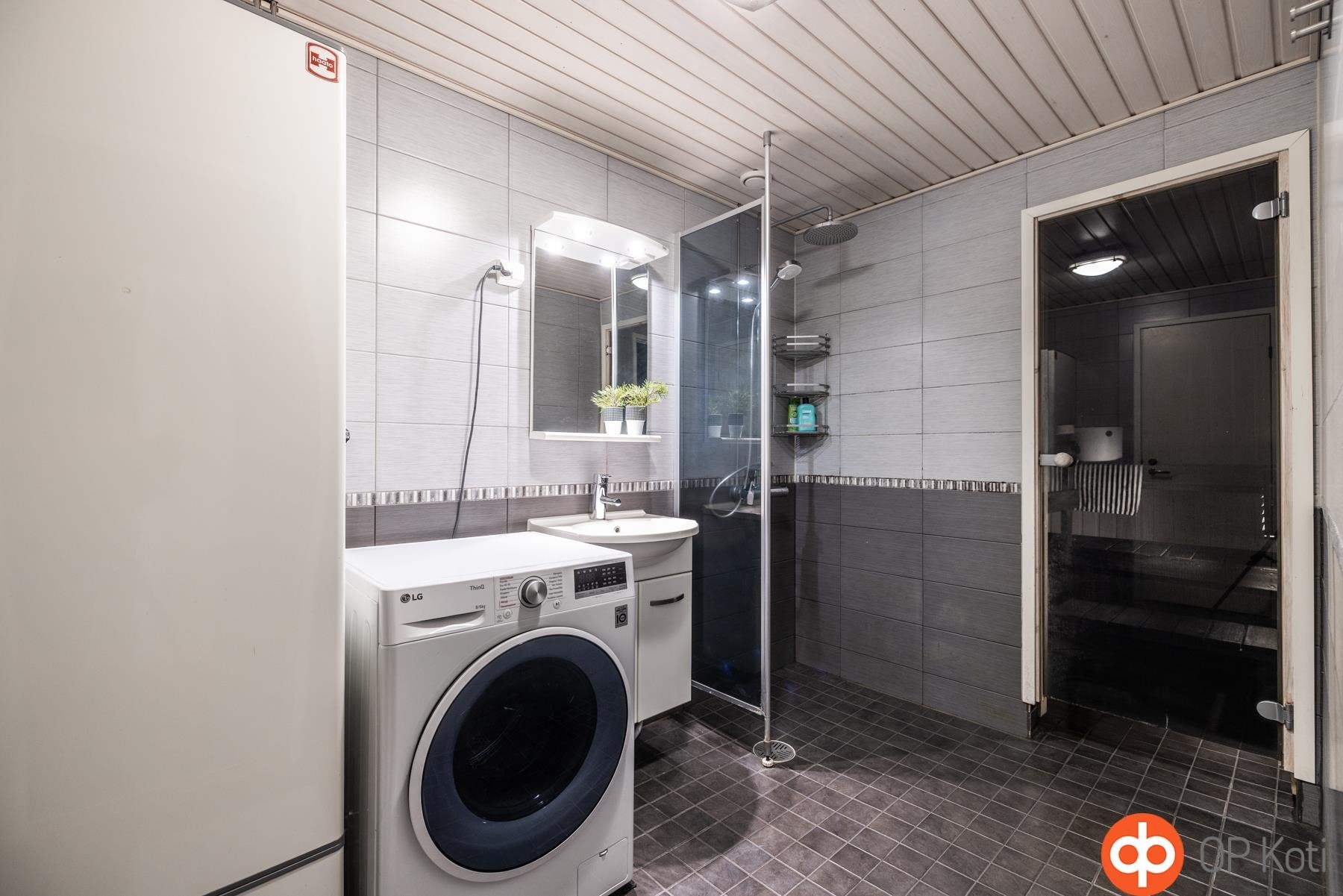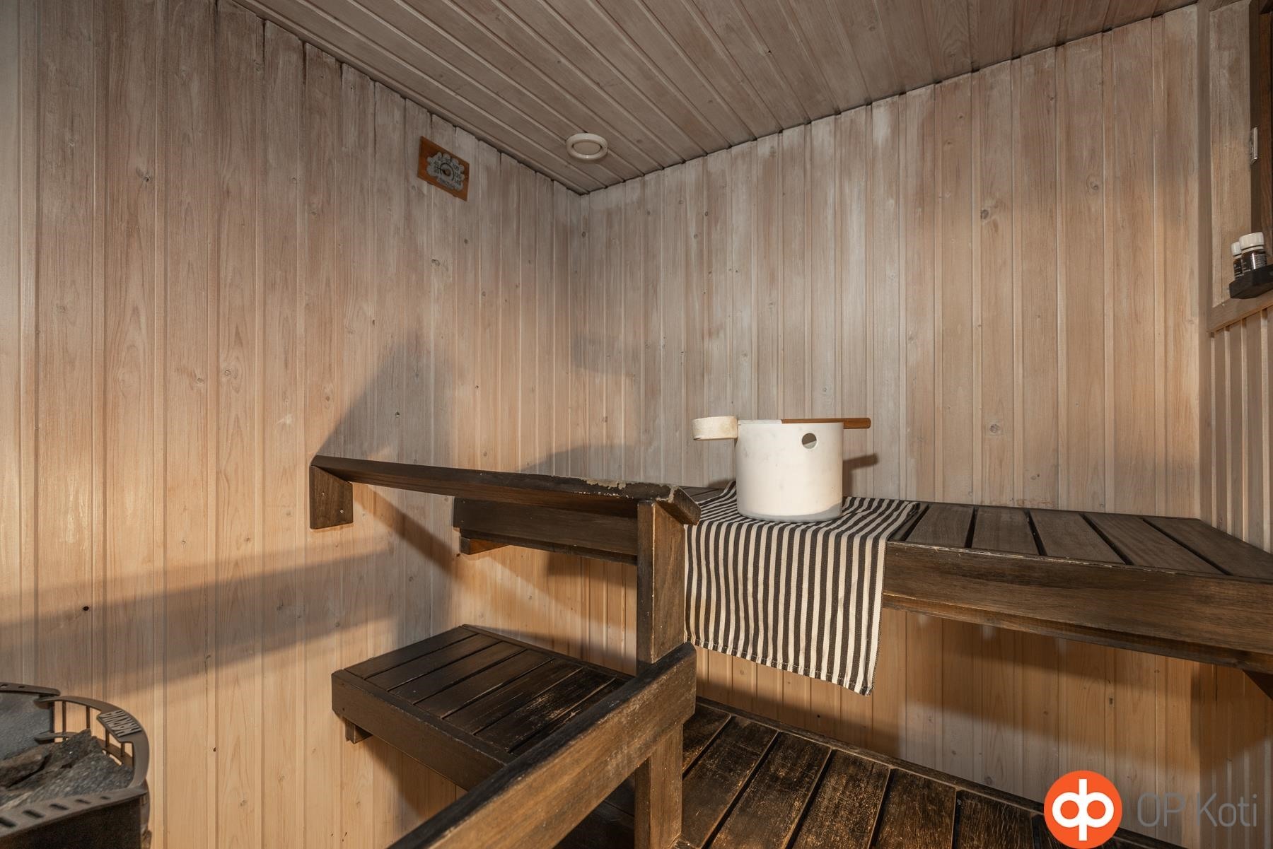 - Sauna, sähkökiuas, kylpyhuone, erillinen wc, suihku, suihkuseinä, peilit, allaskaappi, pesukoneliitäntä psh, lattialämmitys psh, kiinteät valaisimet.