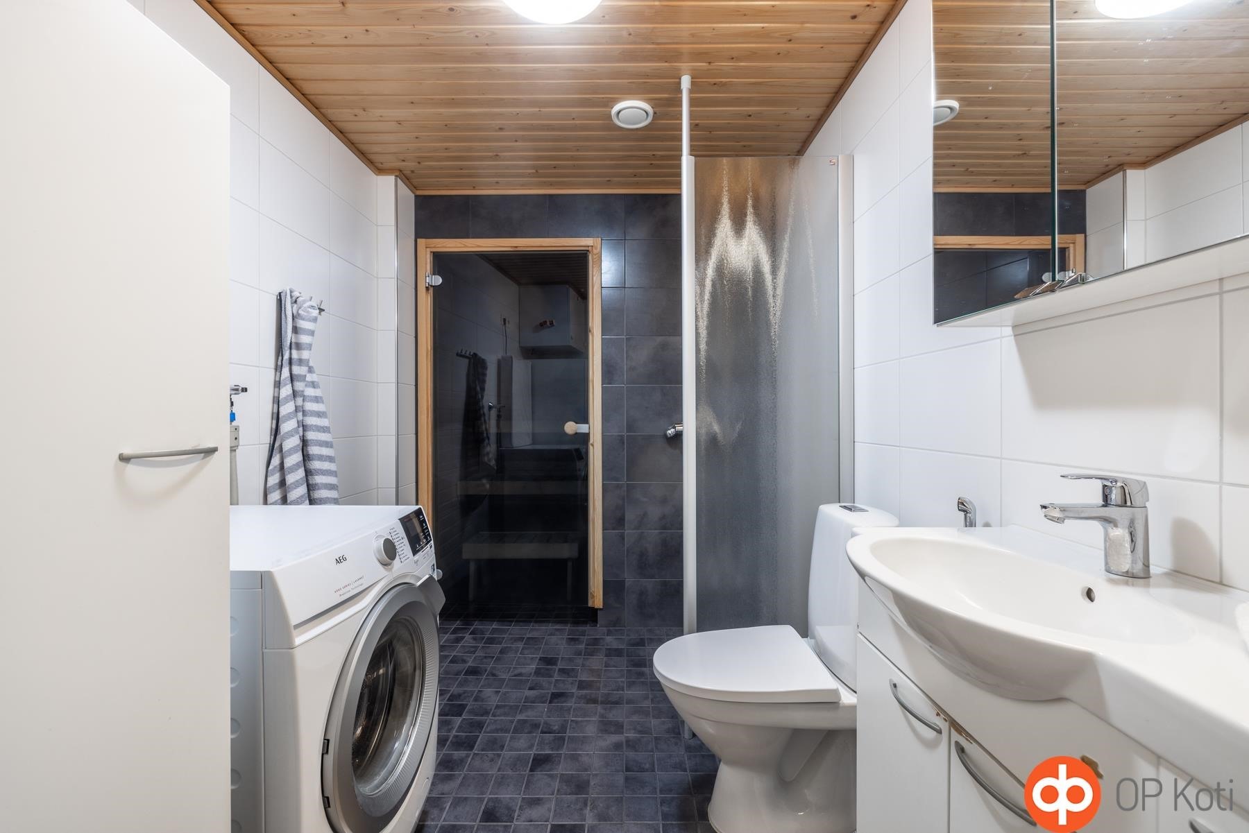 - Sauna, sähkökiuas, kylpyhuone, suihku, suihkuseinä, peilikaappi, allaskaappi, pesukoneliitäntä, lattialämmitys, kiinteät valaisimet.