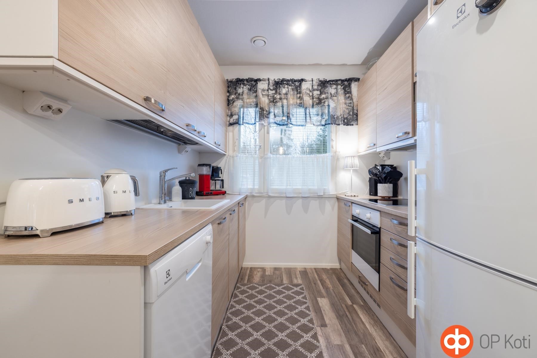 - Jääkaappipakastin, liesitaso keraaminen, liesituuletin, astianpesukone, kaapistot, kiinteät valaisimet.