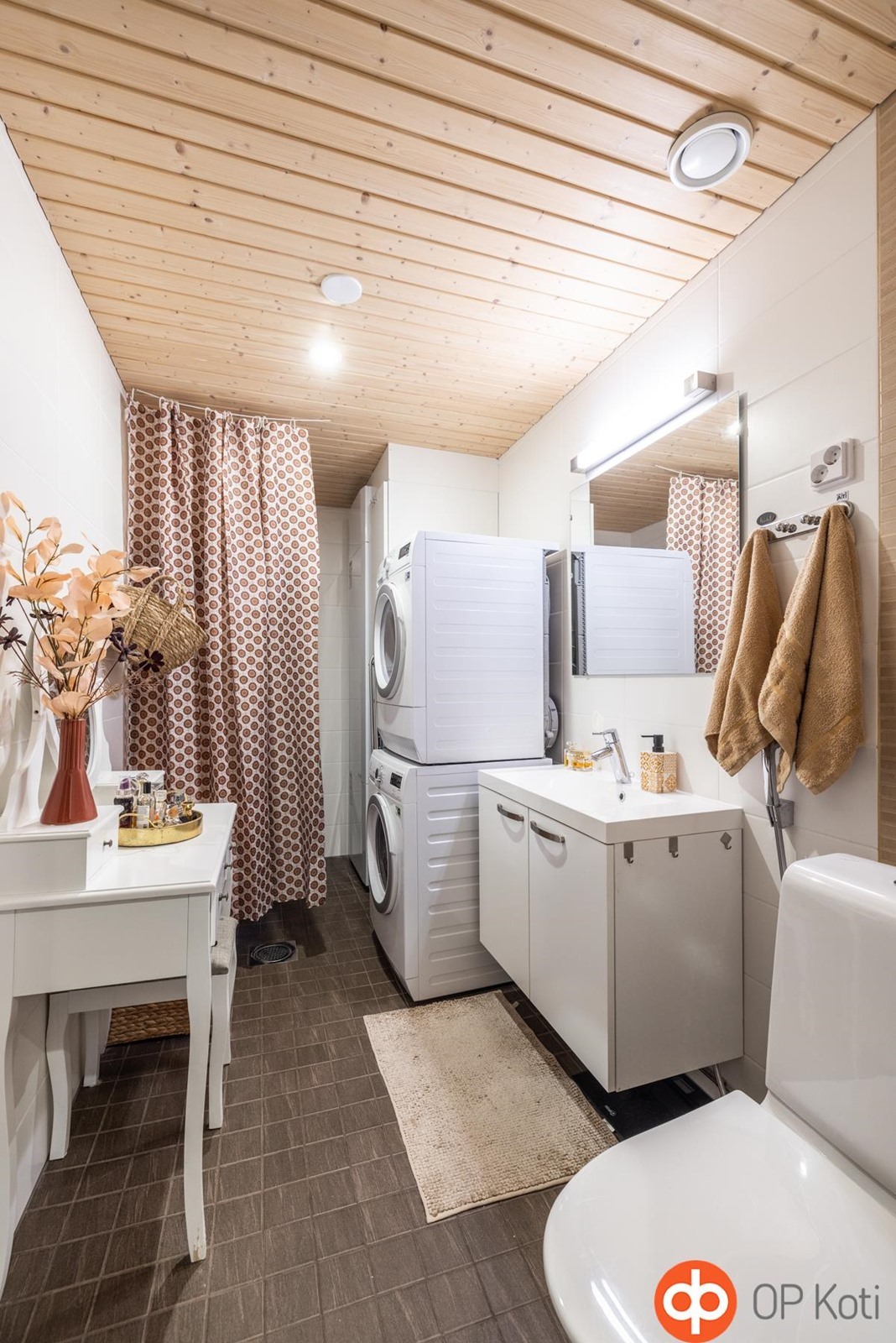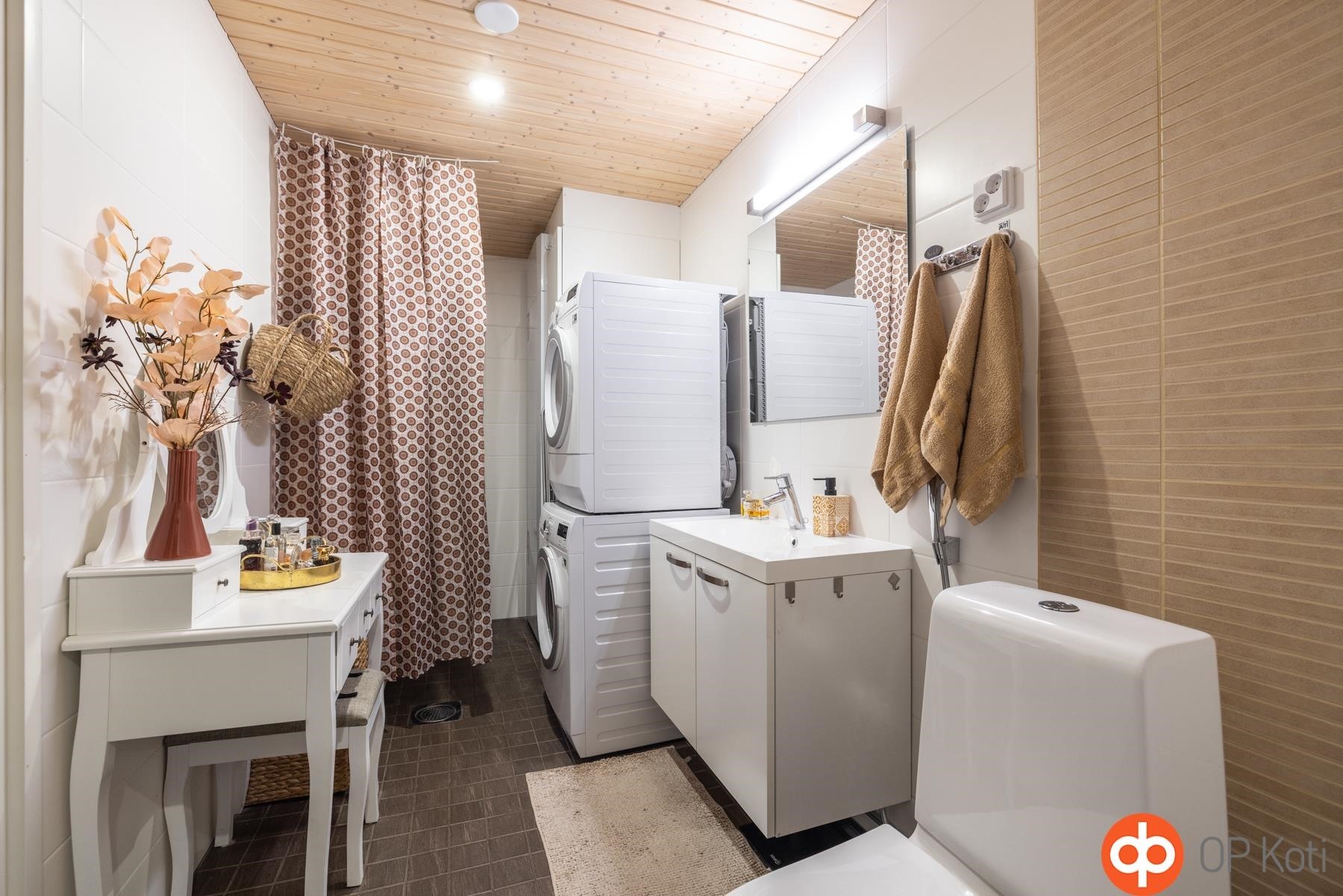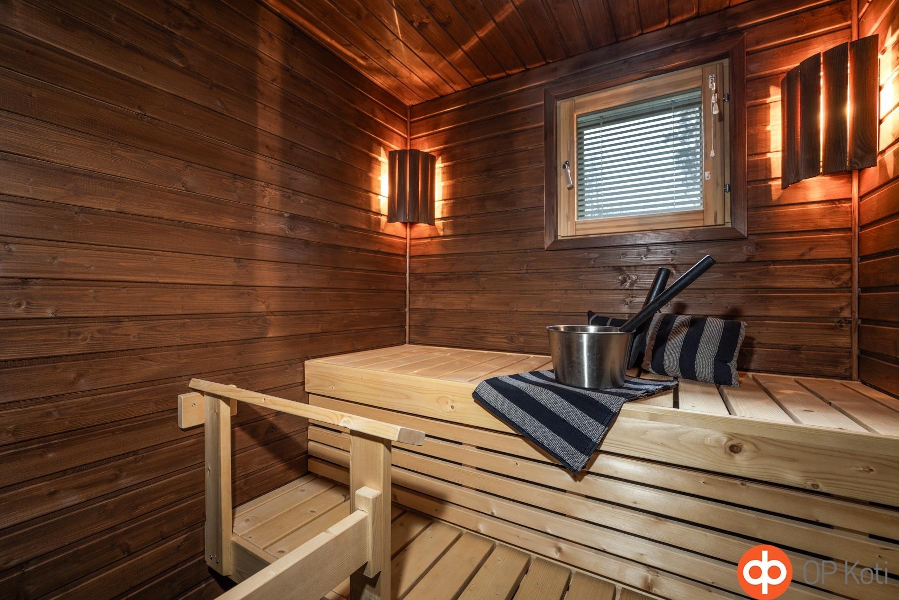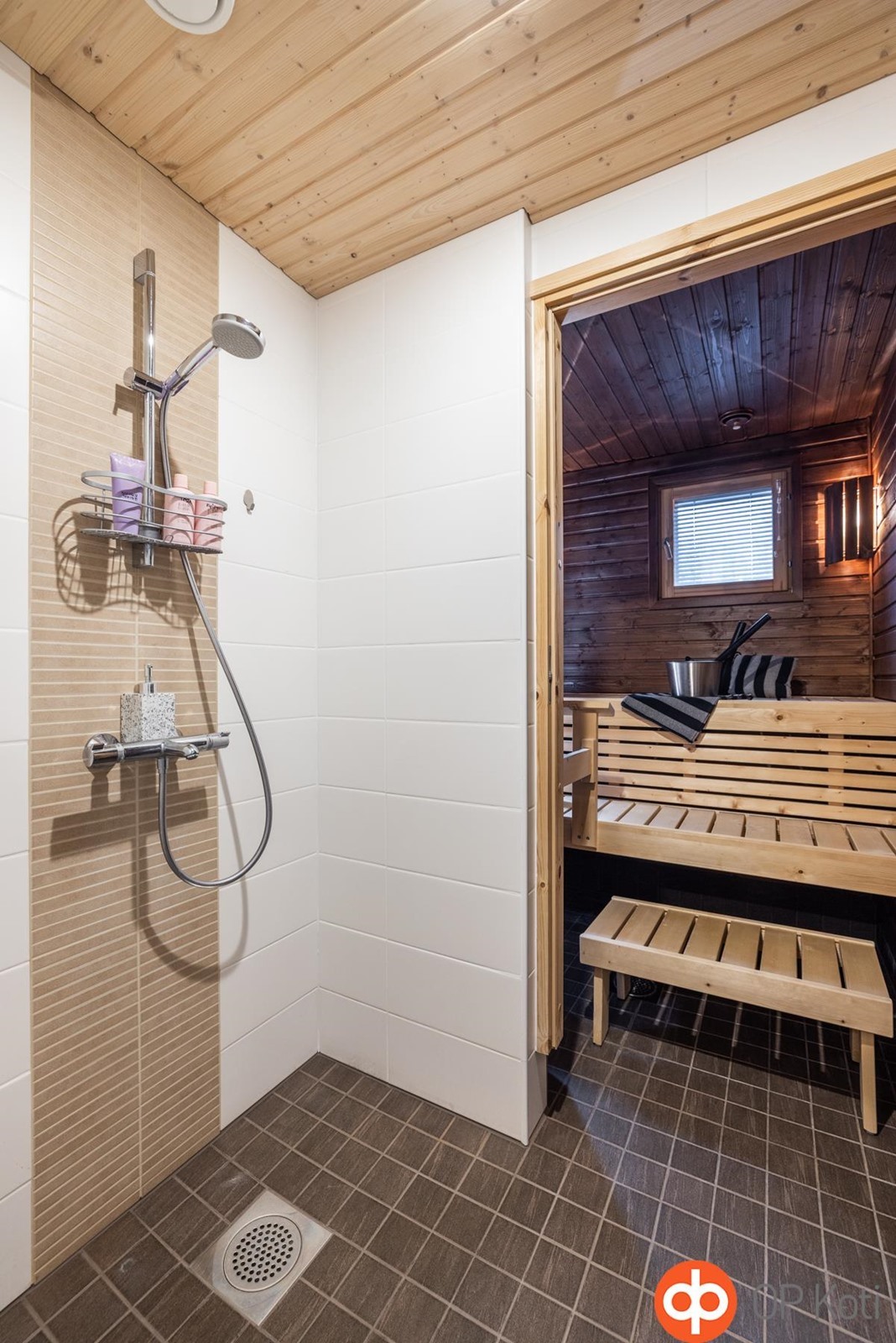 - Sauna, sähkökiuas, kylpyhuone, suihku, suihkuseinä, peilit, allaskaappi, pesukoneliitäntä, lattialämmitys koko asunto, kiinteät valaisimet.
