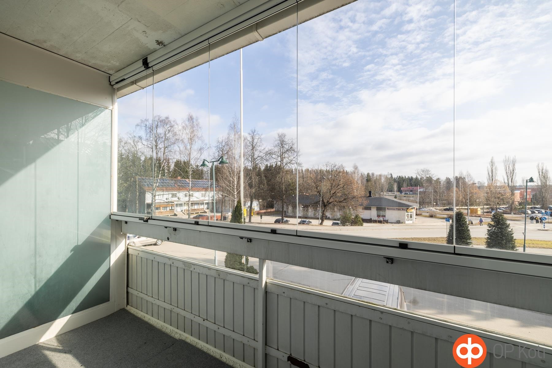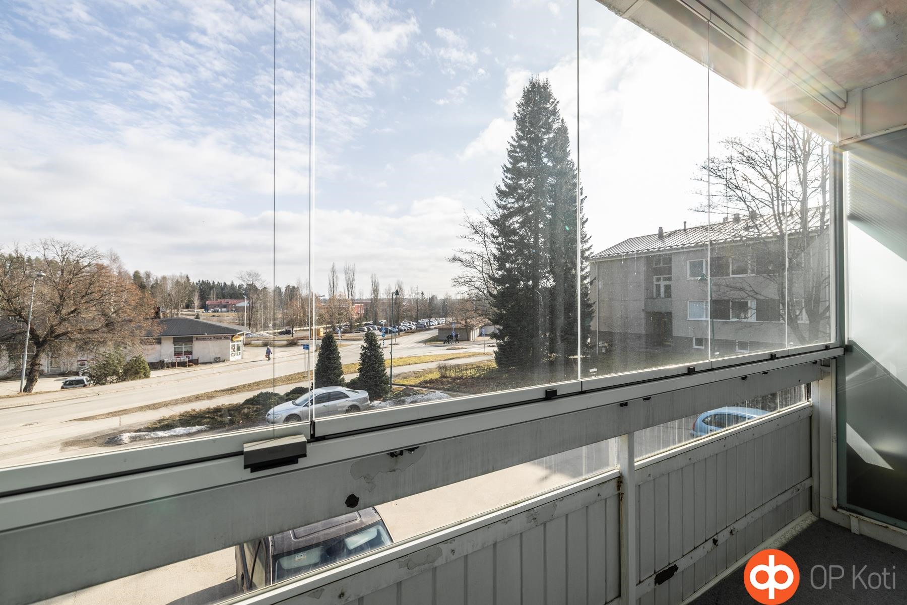 - Läpitalon huoneisto. Maisemaa Tervakosken keskustan suuntaan ja toisella puolella taloyhtiön sisäpihalle.