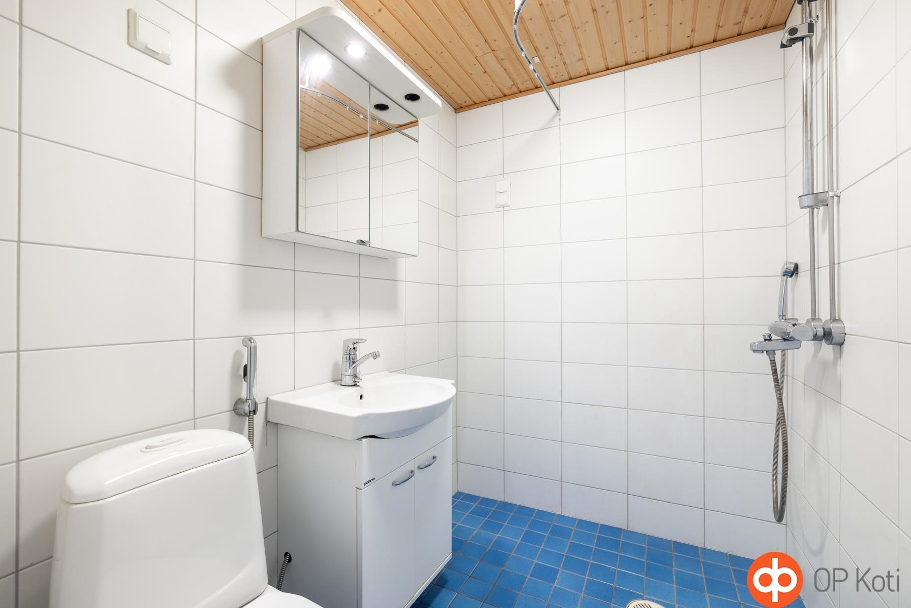 - Kylpyhuone, suihku, peilikaappi, pesukoneliitäntä, lattialämmitys, kiinteät valaisimet.