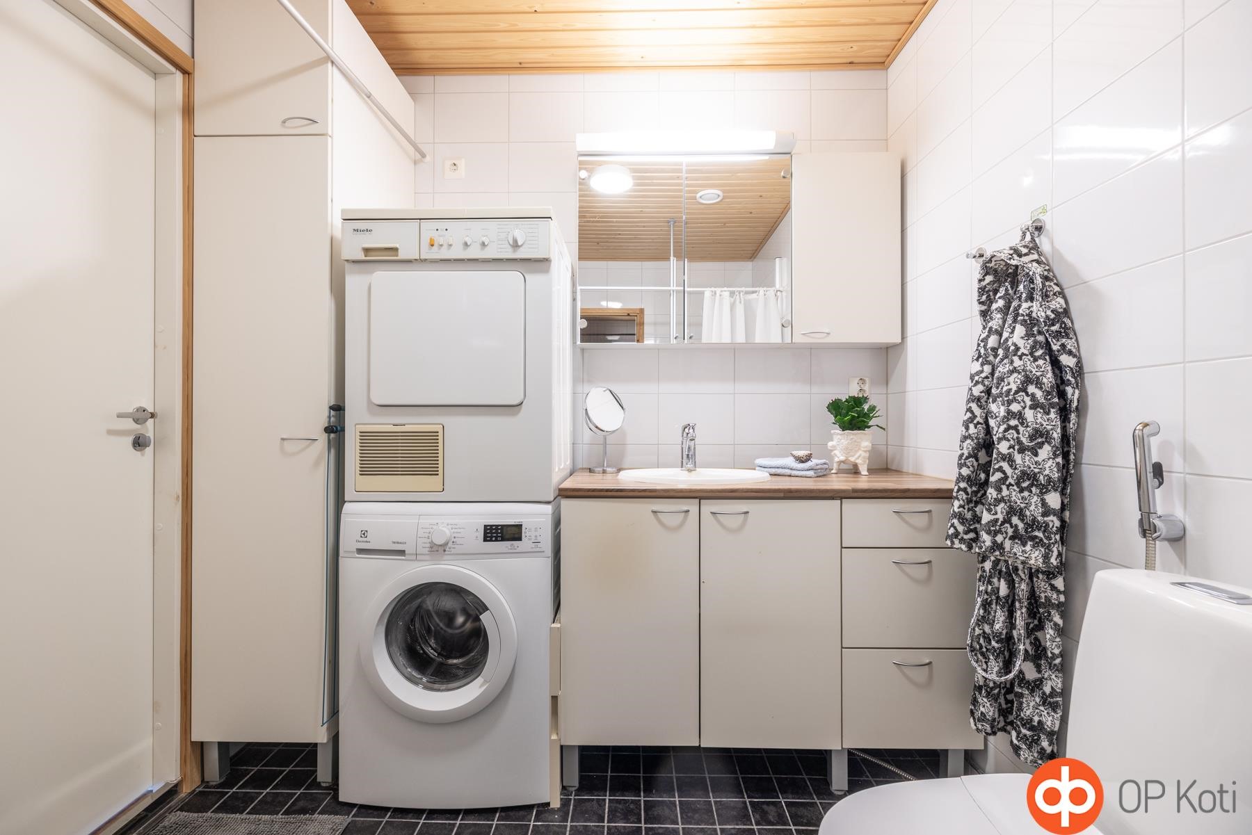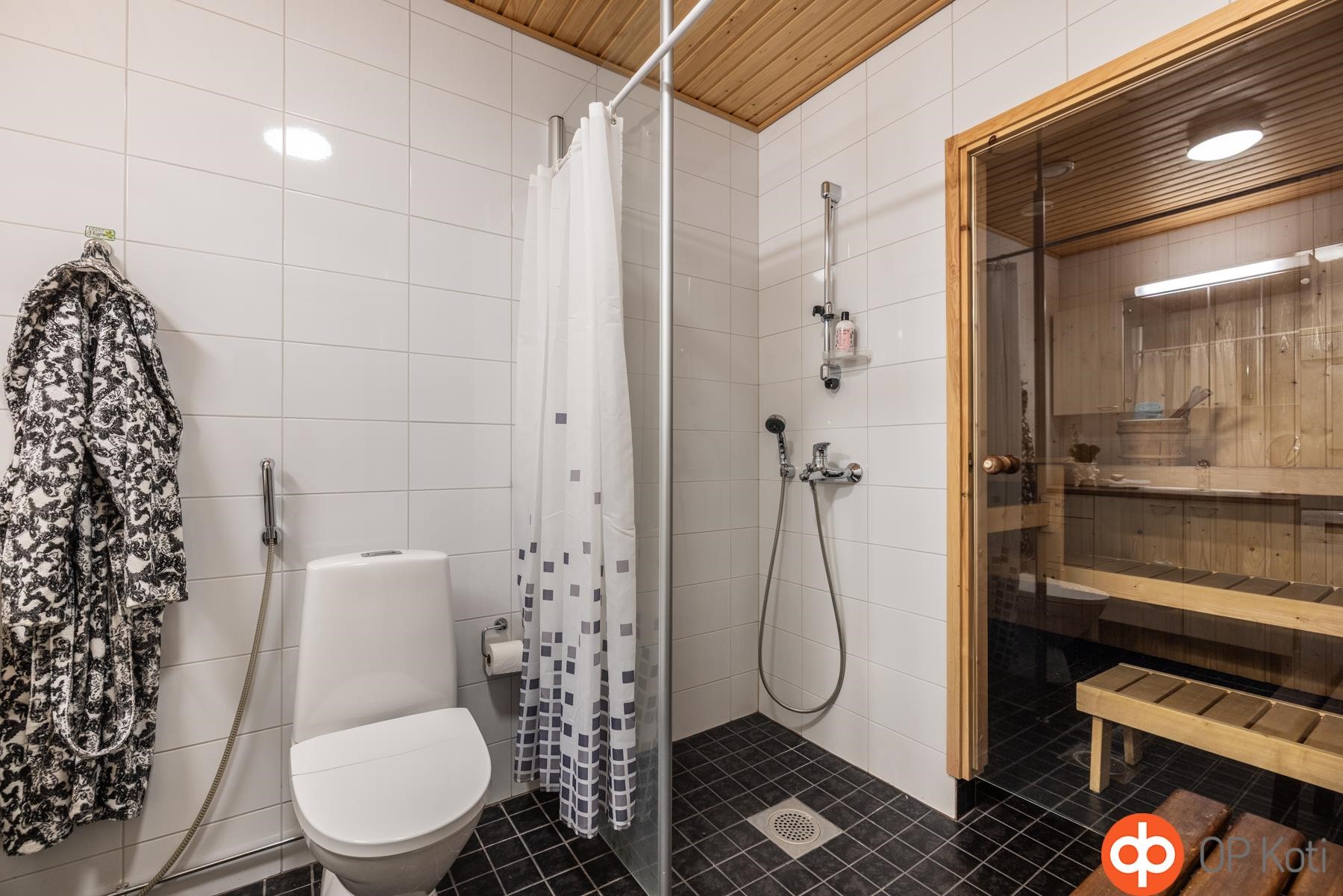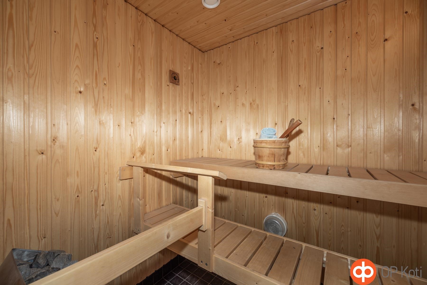 - Sauna, sähkökiuas, kylpyhuone, suihku, suihkuseinä, peilikaappi, allaskaappi, pesukoneliitäntä, lattialämmitys, kiinteät valaisimet.