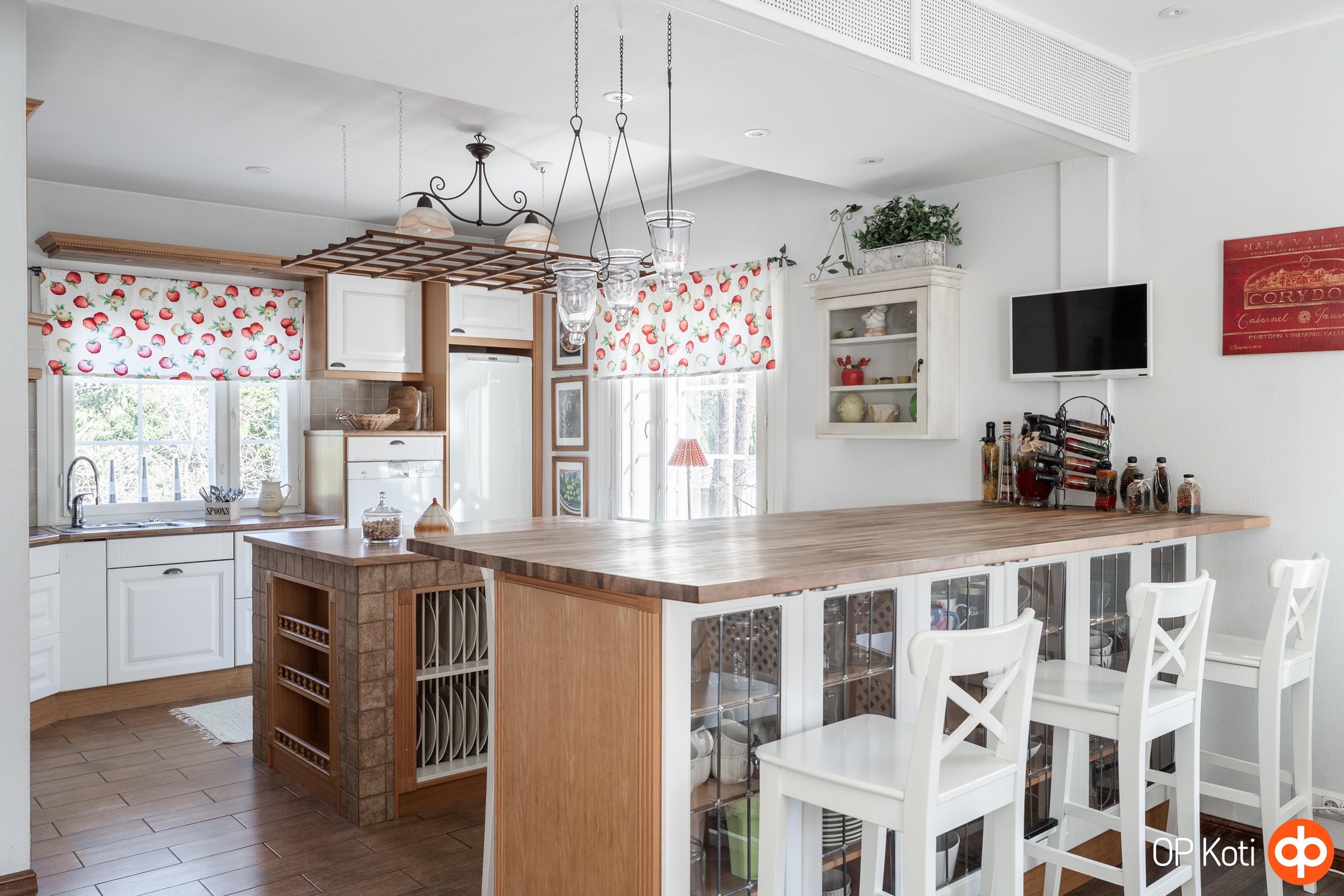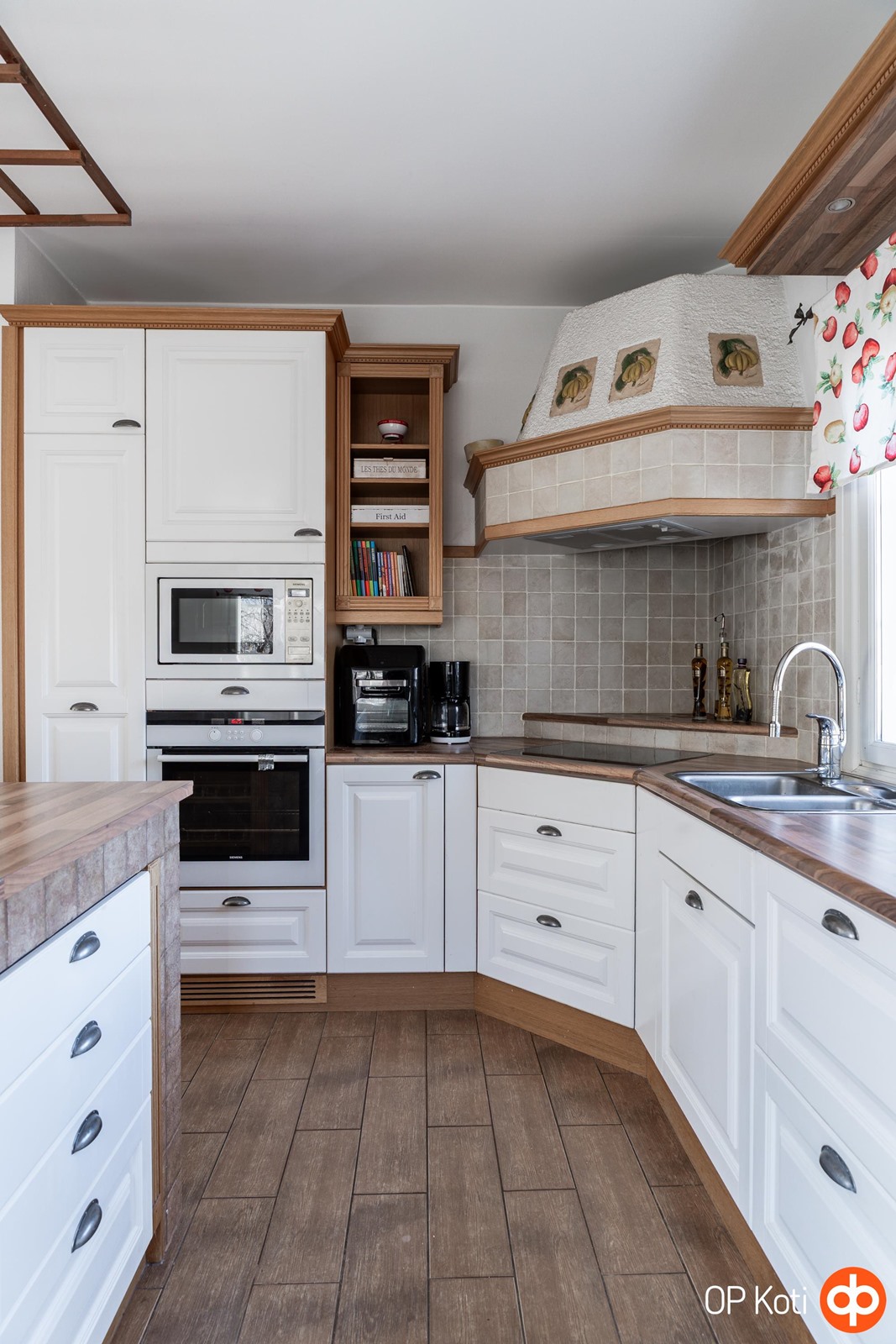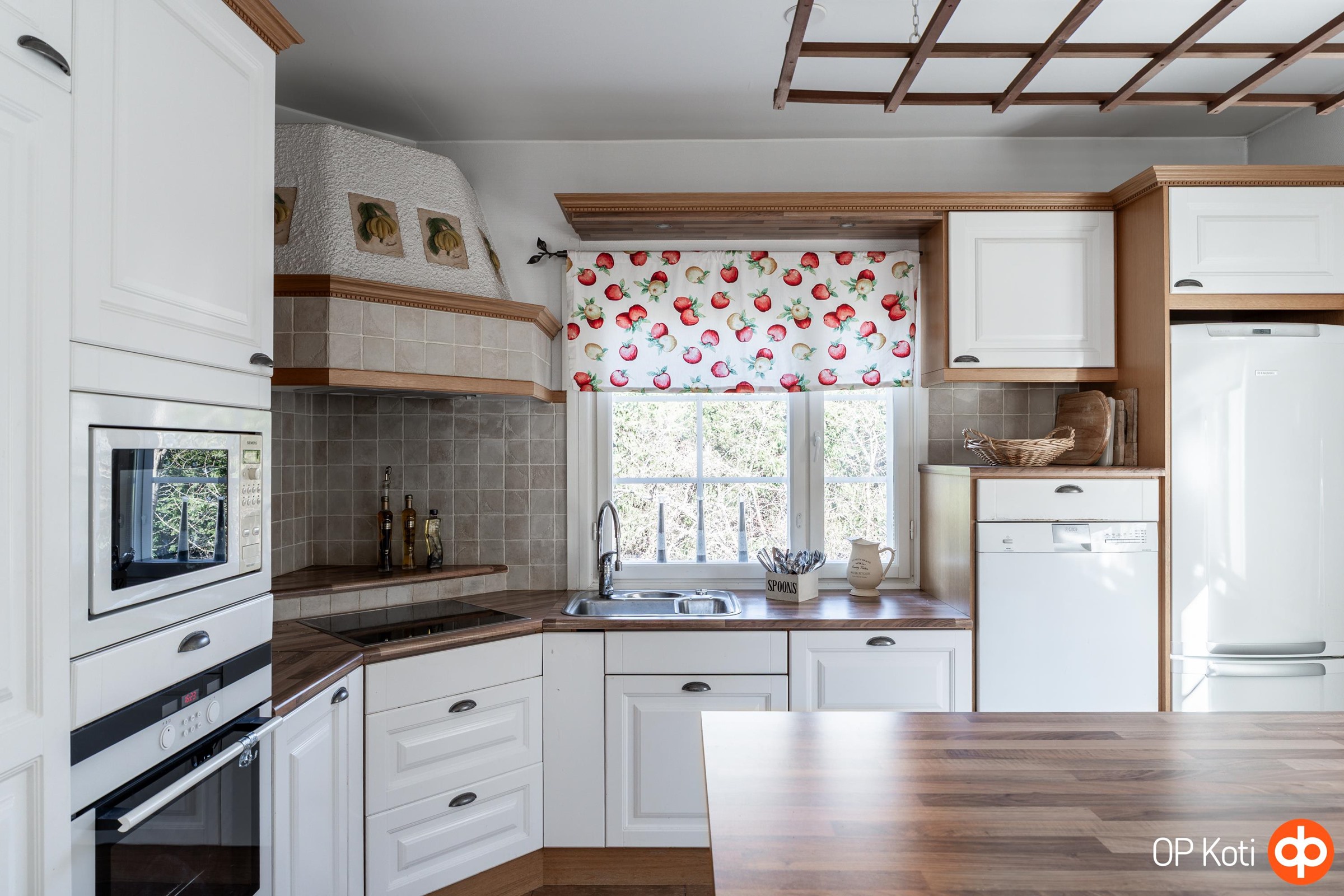 - Jääkaappipakastin, erillisuuni, keraaminen liesi, liesituuletin (oma hormi), mikroaaltouuni, astianpesukone, kaapistot.