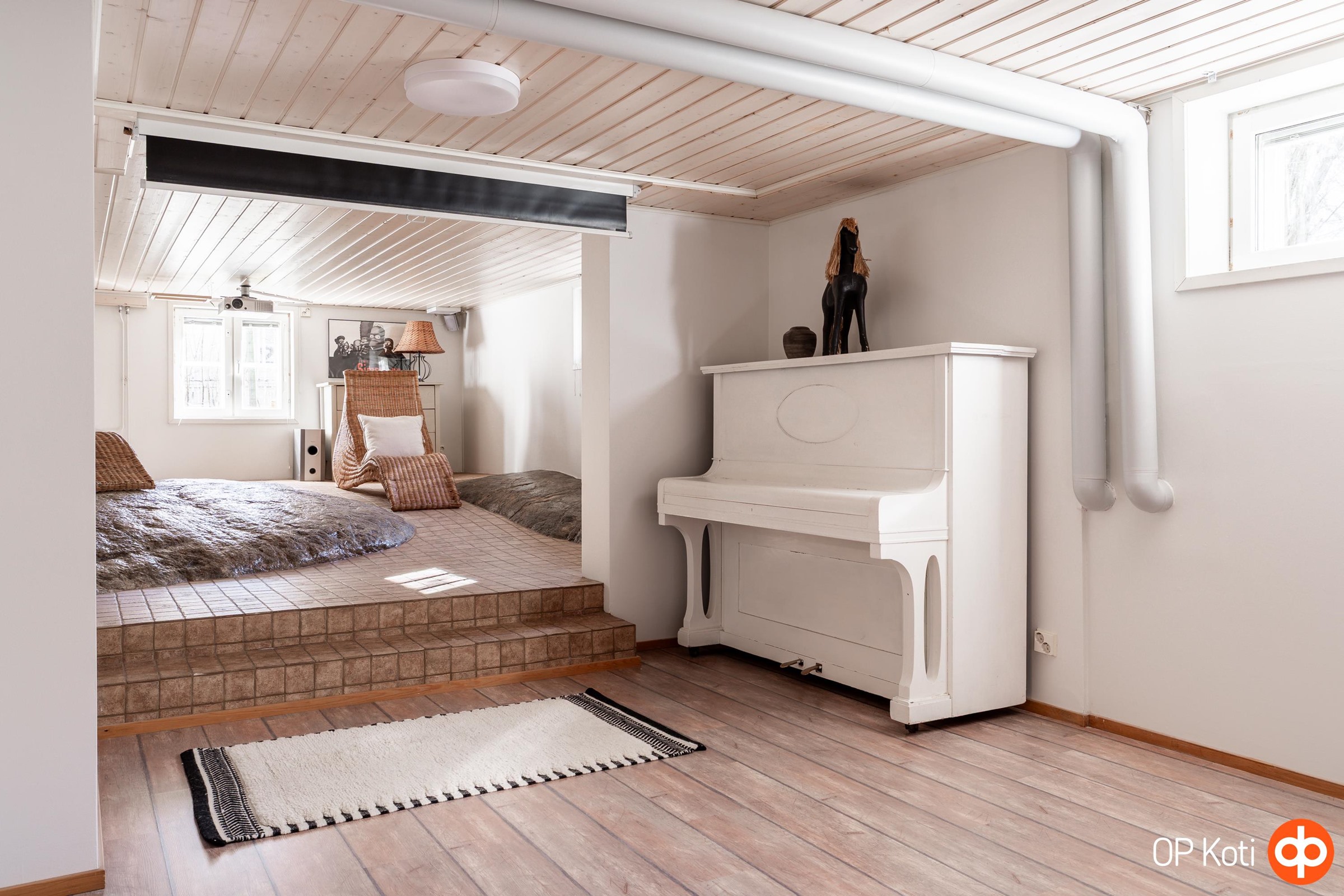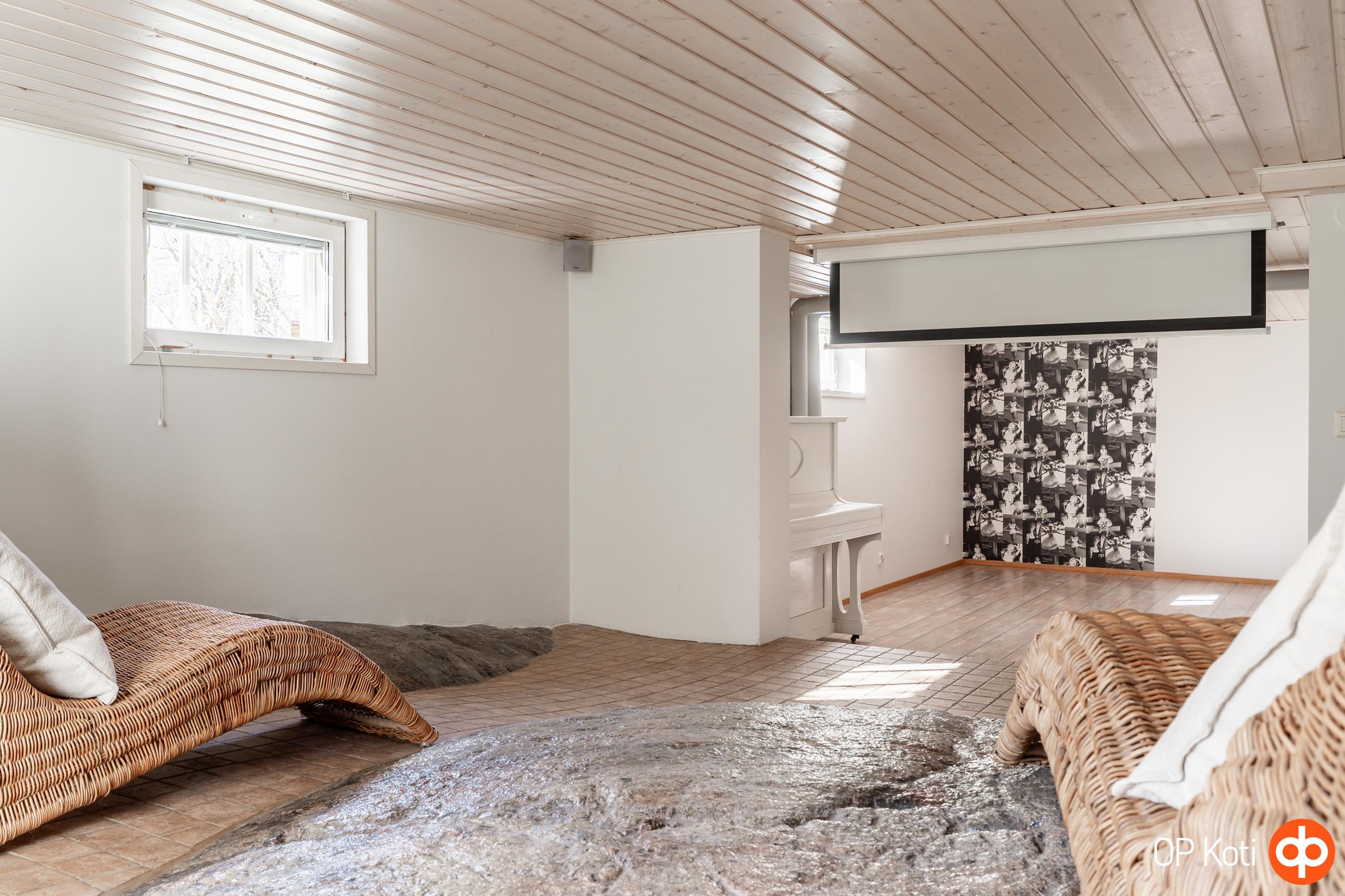 Alakerrassa sijaitsevat viihtyisät saunatilat, erillinen wc sekä todellinen elämystila: oma leffahuone, joka on varustettu videotykillä ja valkokankaalla. Täydellinen paikka elokuvailloille ja rennolle ajanvietolle.
