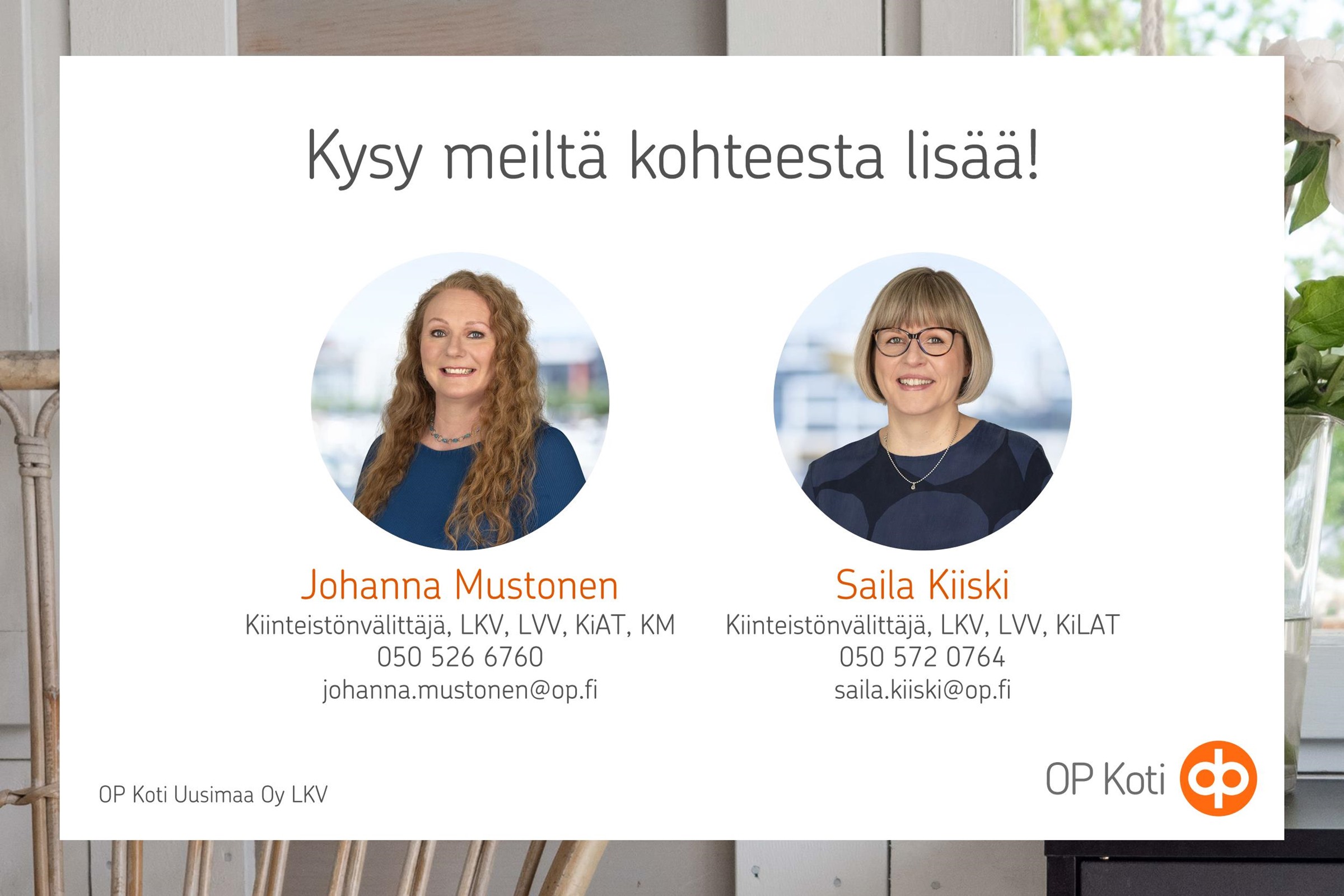 Varaa oma esittelyaikasi välittäjältä puh. 050 572 0764/Saila Kiiski tai 050 526 6760/Johanna Mustonen. Tarvitsetko rahoitusta uuden kotisi hankintaan? Meidän kauttamme löydät yhteyshenkilön OP Uusimaasta ja pääset sujuvasti lainaneuvotteluun.