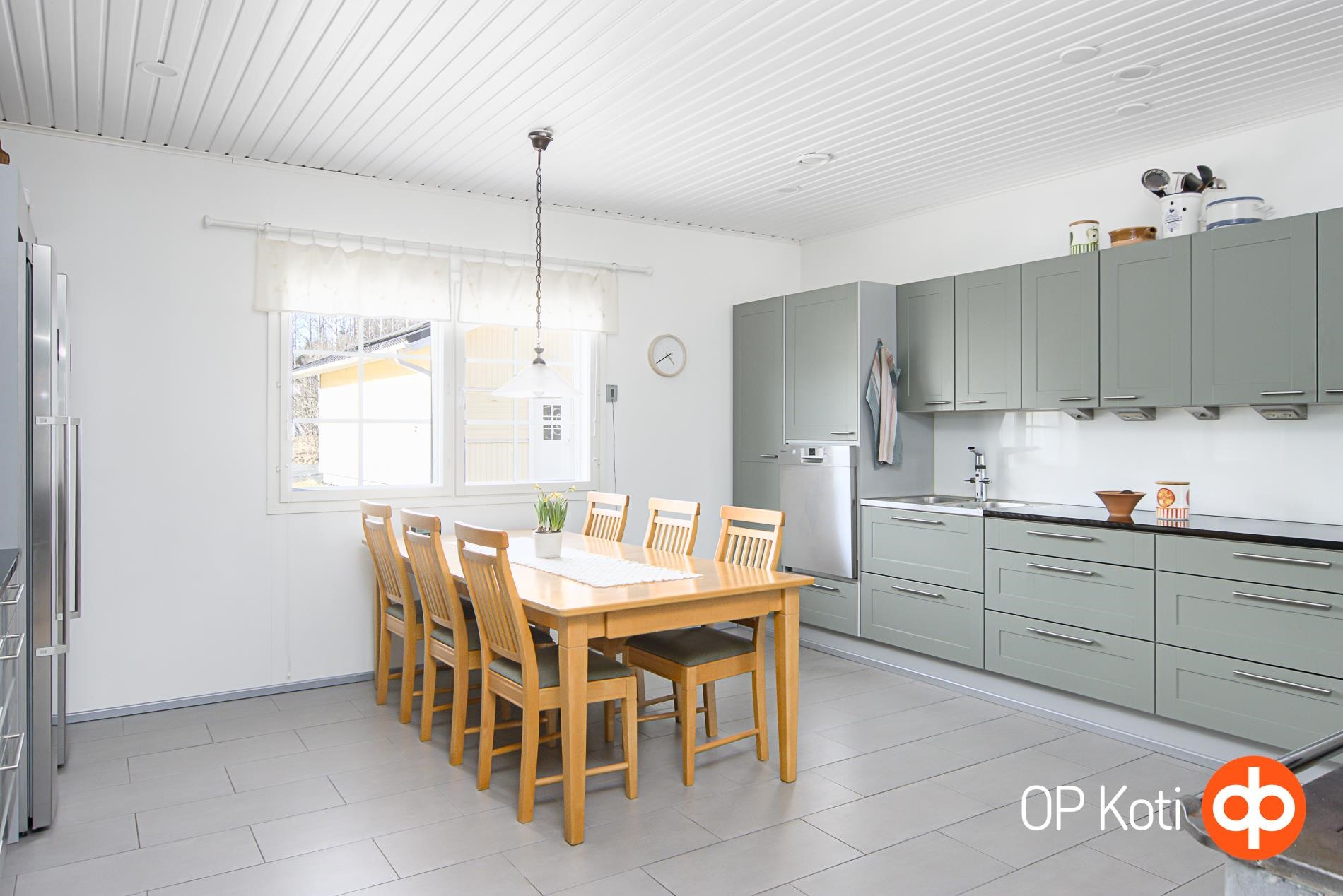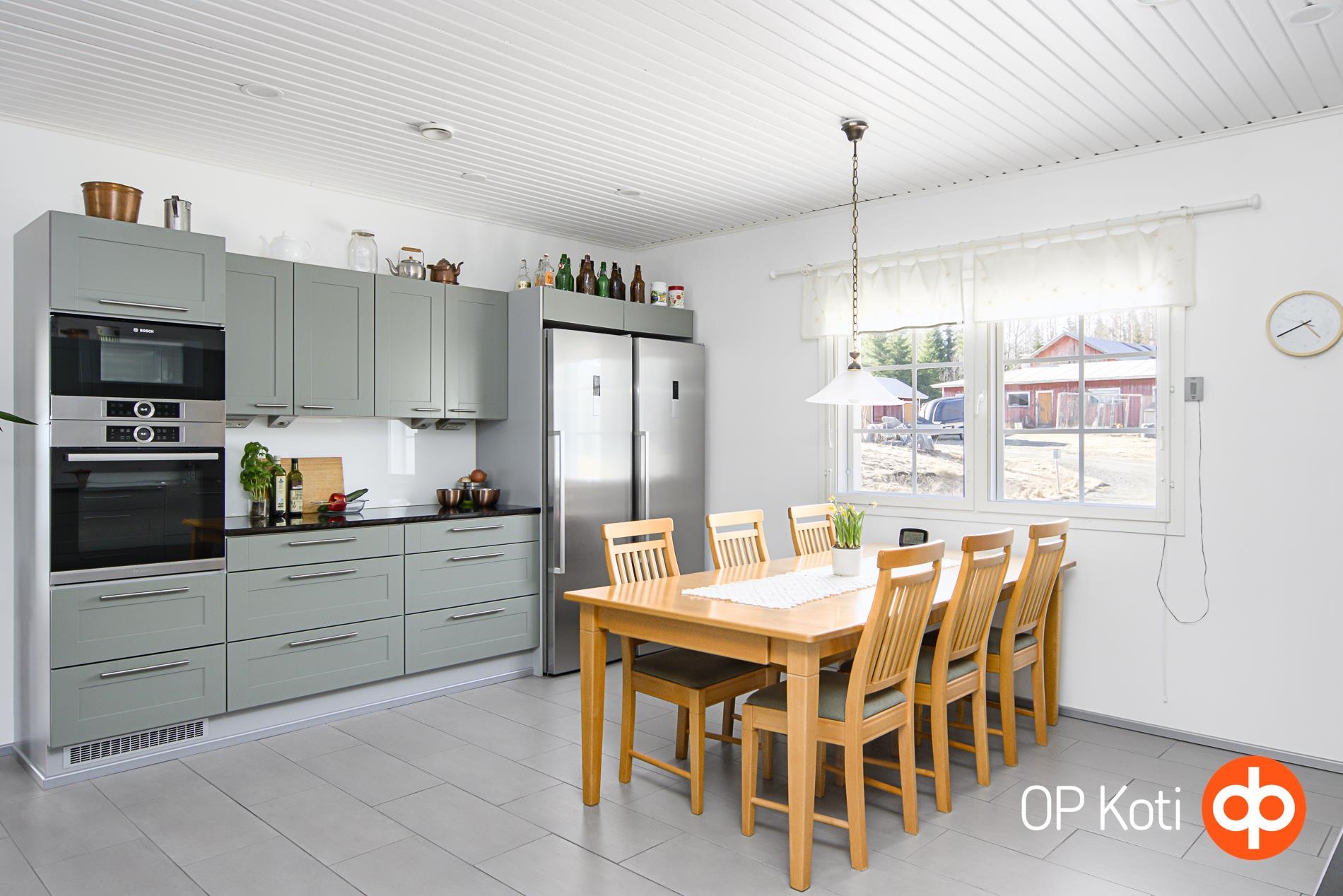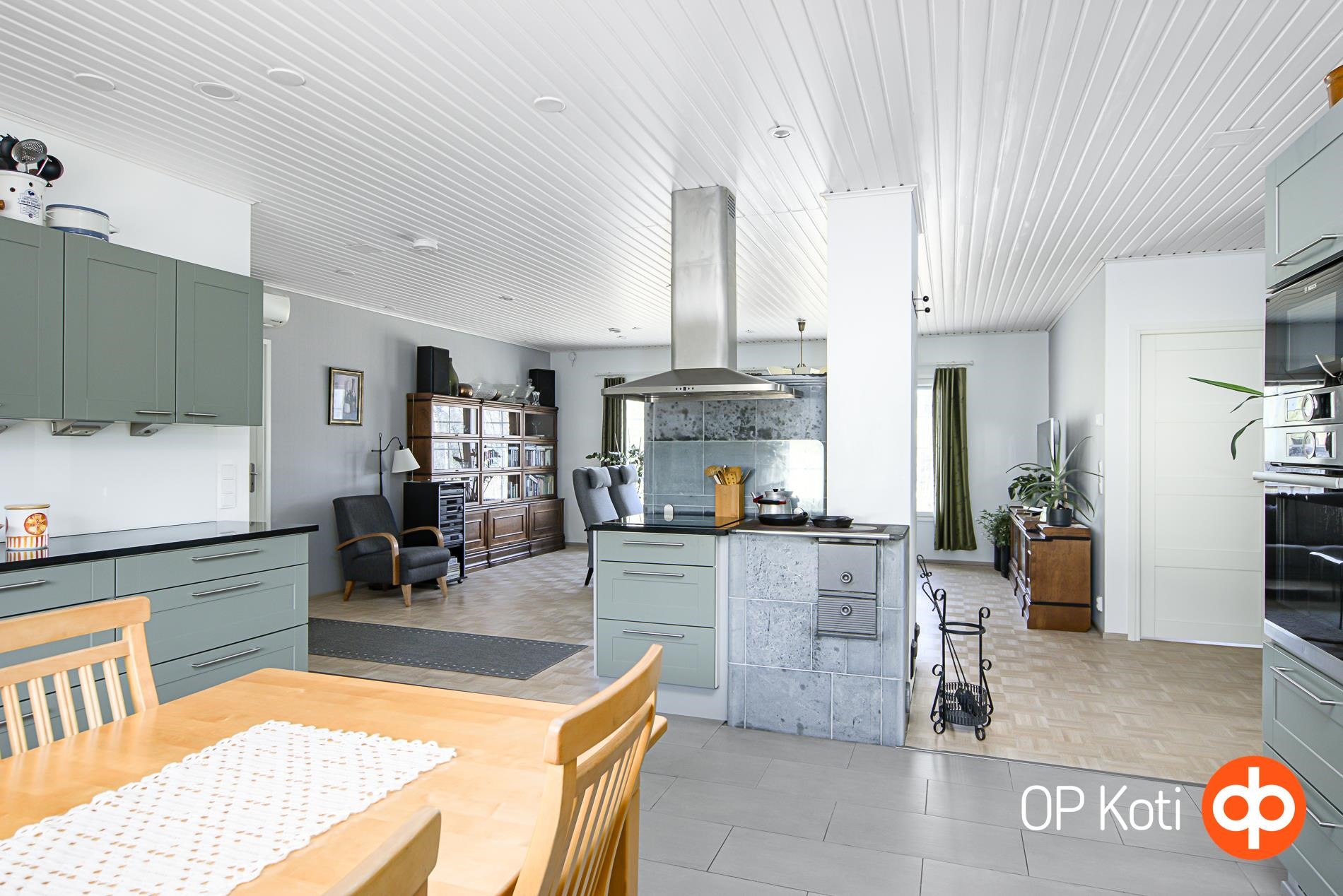 - Jääkaappi, pakastekaappi, erillisuuni, liesitaso induktioliesitaso, liesituuletin, leivinuuni + puuliesi, astianpesukone, kaapistot kaapistojen ovet vaihdettu v. 2025, kiinteät valaisimet, pöytätasojen materiaali kivitasot.