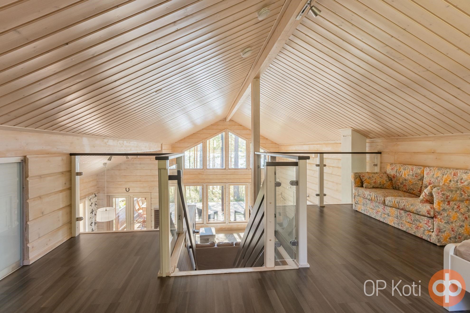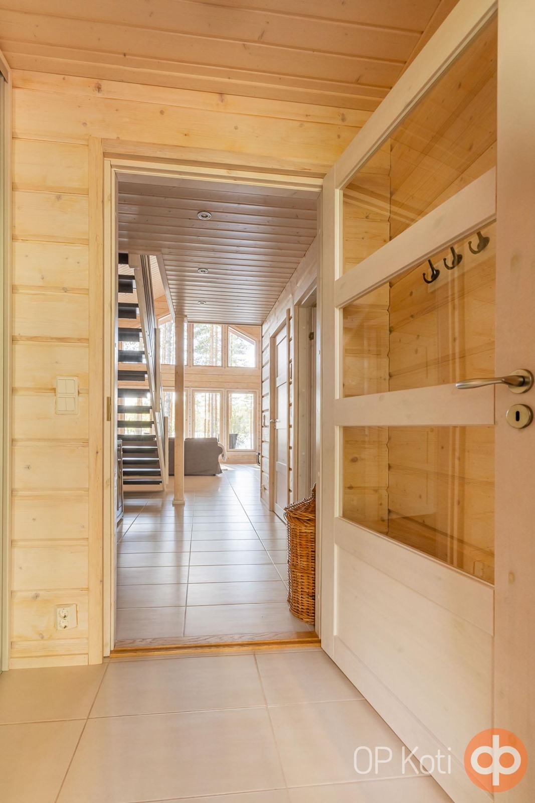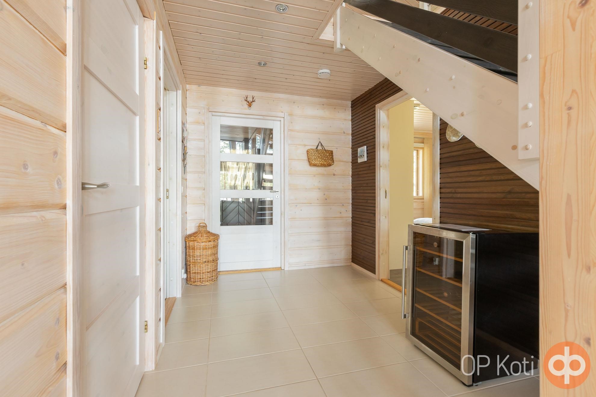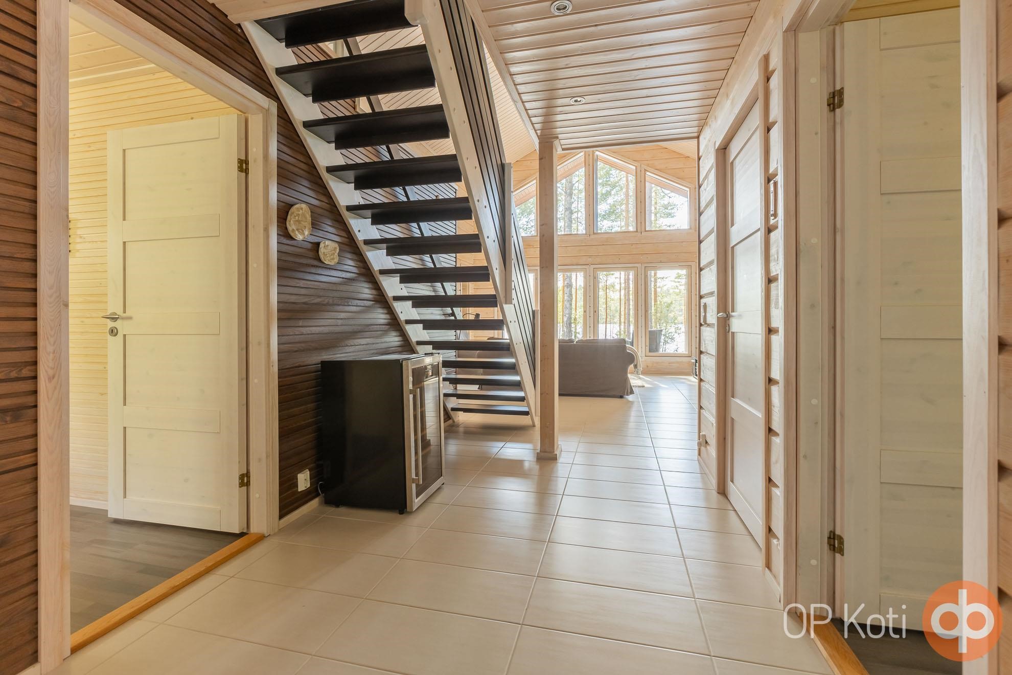 Keittiö: Lattia: laatta, seinät: valkokuullotettu hirsi, välitila: lasi. Olohuone: Lattia: laatta, seinät: valkokuullotettu hirsi. Makuuhuone 1: Lattia: laminaatti, seinät: valkokuullotettu hirsi. Makuuhuone 2: Lattia: laminaatti, seinät: valkokuullotettu hirsi. Kodinhoitohuone: Lattia: laatta, seinät: valkokuullotettu hirsi. Sauna: Lattia: laatta, seinät:. Kylpyhuone: Lattia: laatta, seinät: laatta. Wc: Lattia: laatta, seinät: laatta. Parvi: Lattia: laminaatti, seinät: valkokuullotettu hirsi.
