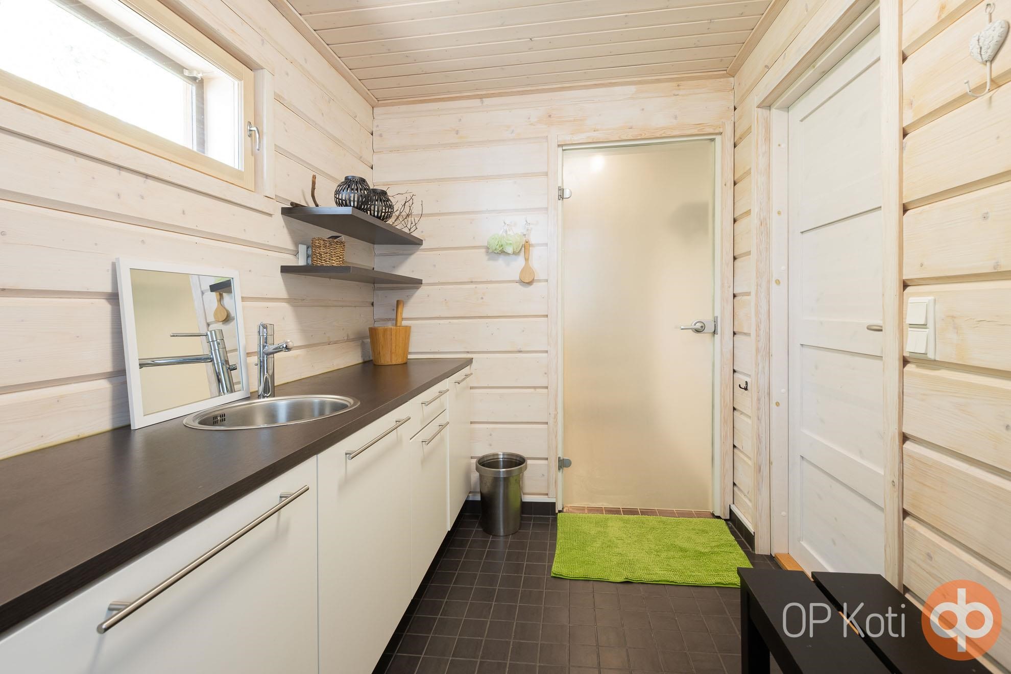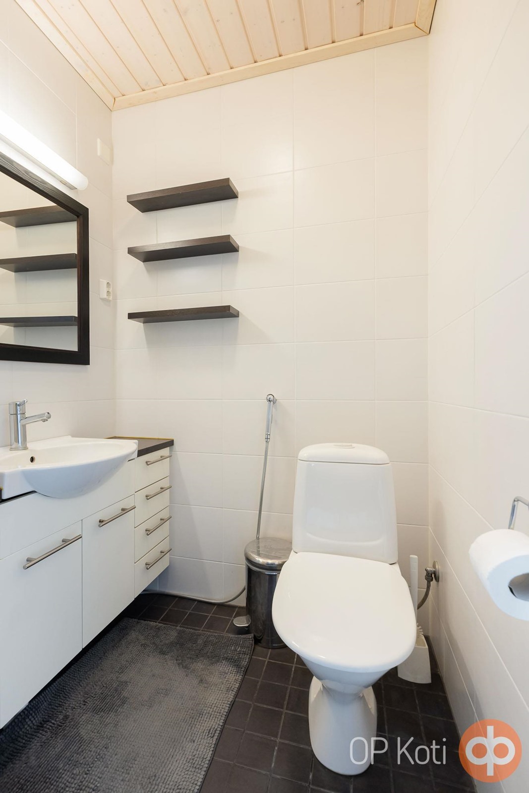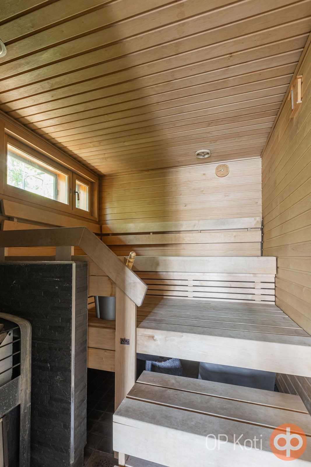 - Sauna, puukiuas, kylpyhuone, erillinen wc, suihku 2x suihkua, peilit erillisessä vessassa, allaskaappi Kodinhoitohuoneessa ja erillisessä vessassa, pesukoneliitäntä Kodinhoitohuoneessa, lattialämmitys, kiinteät valaisimet.