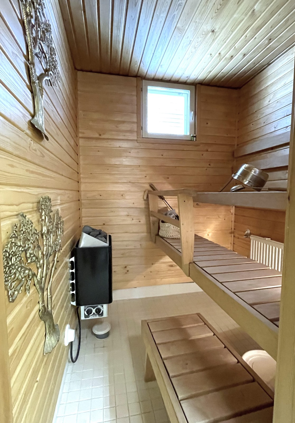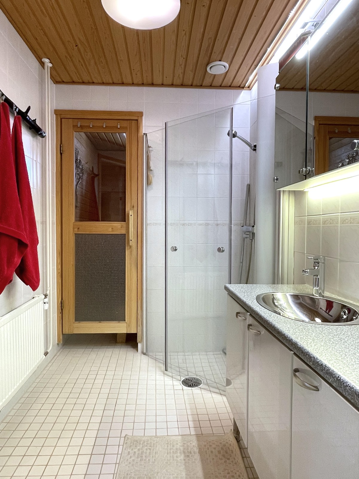- Sauna, sähkökiuas, kylpyhuone, erillinen wc, suihku, suihkuseinä, peilikaappi, allaskaappi, pesukoneliitäntä, lattialämmitys, kiinteät valaisimet, pyykinpesukone.