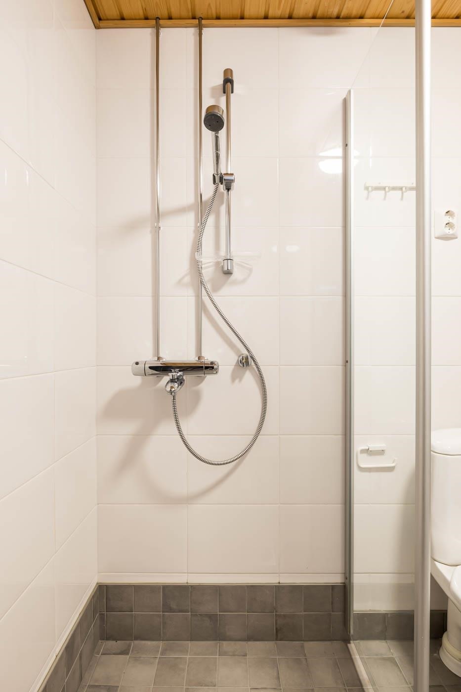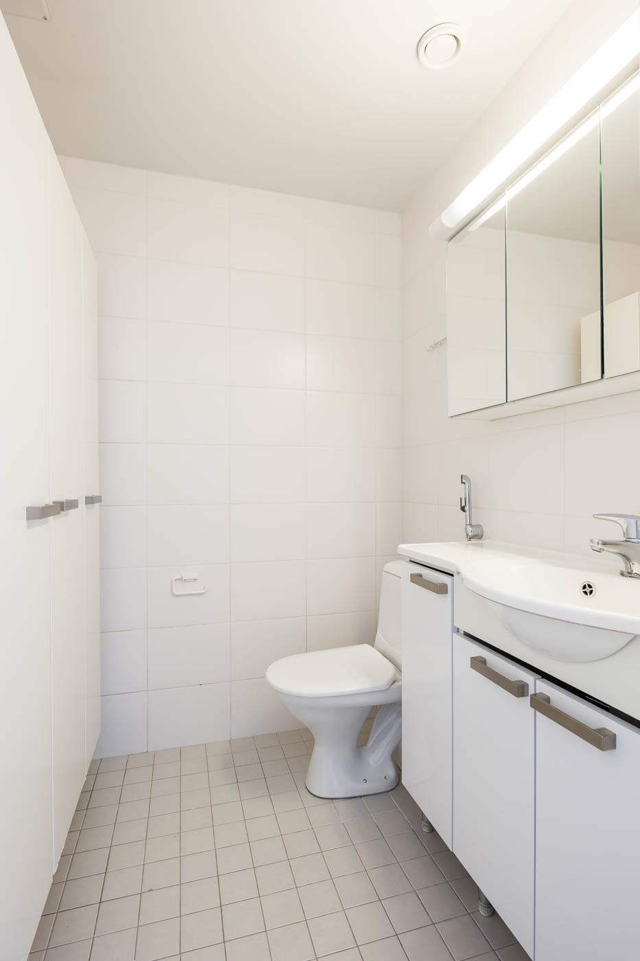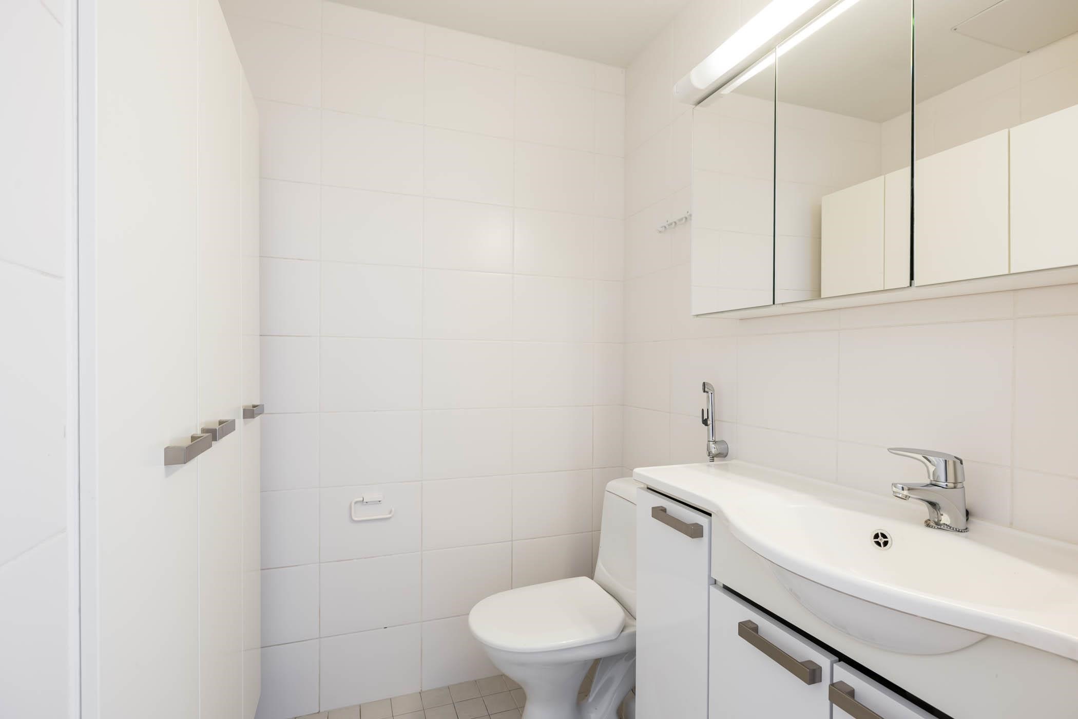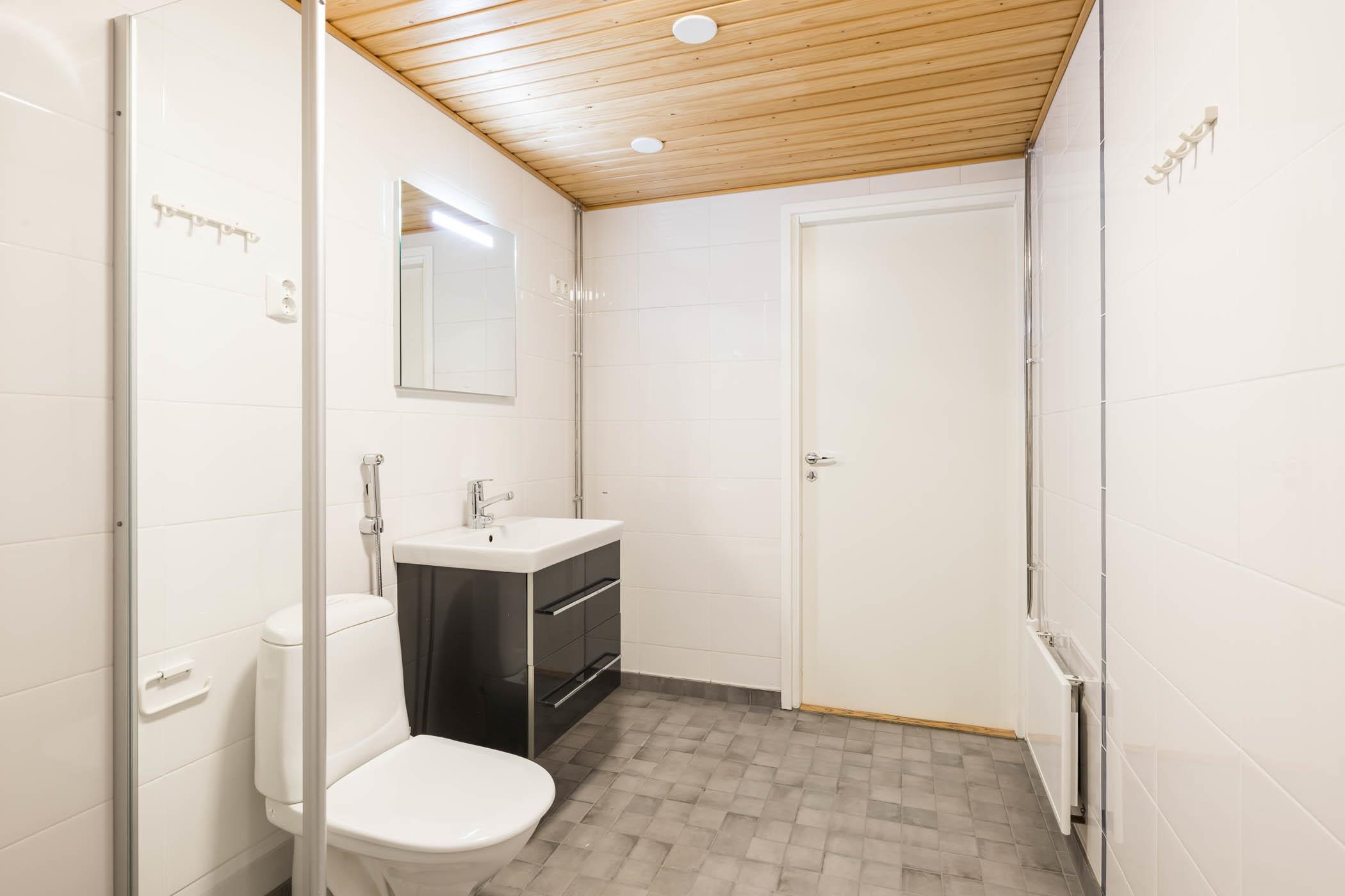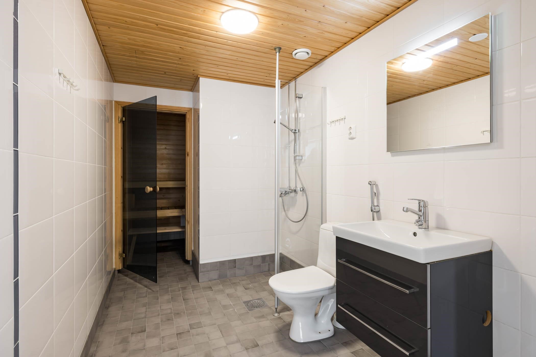 - Sauna, sähkökiuas, kylpyhuone, erillinen wc, suihku, suihkuseinä, peilit, peilikaappi, allaskaappi, pesukoneliitäntä, lattialämmitys (huoneiston sähköihin), kiinteät valaisimet.