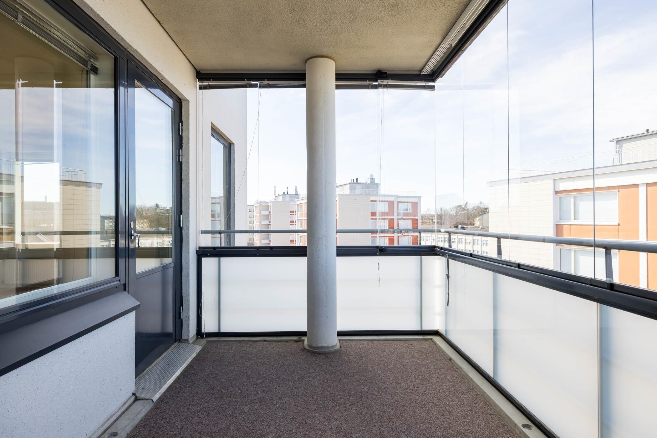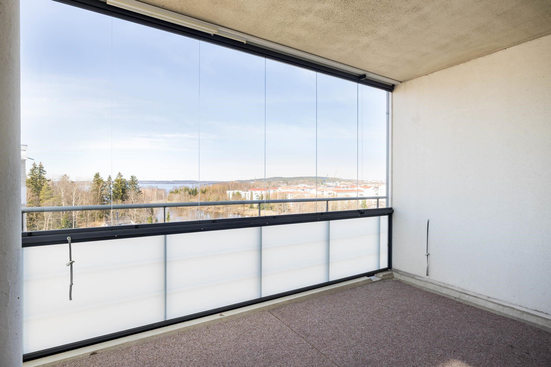 - Lasitettu parveke lännen suuntaan. Näkymä Pyhäjärvelle. Näkyy Näsinneula ja pyynikin näkötorni.