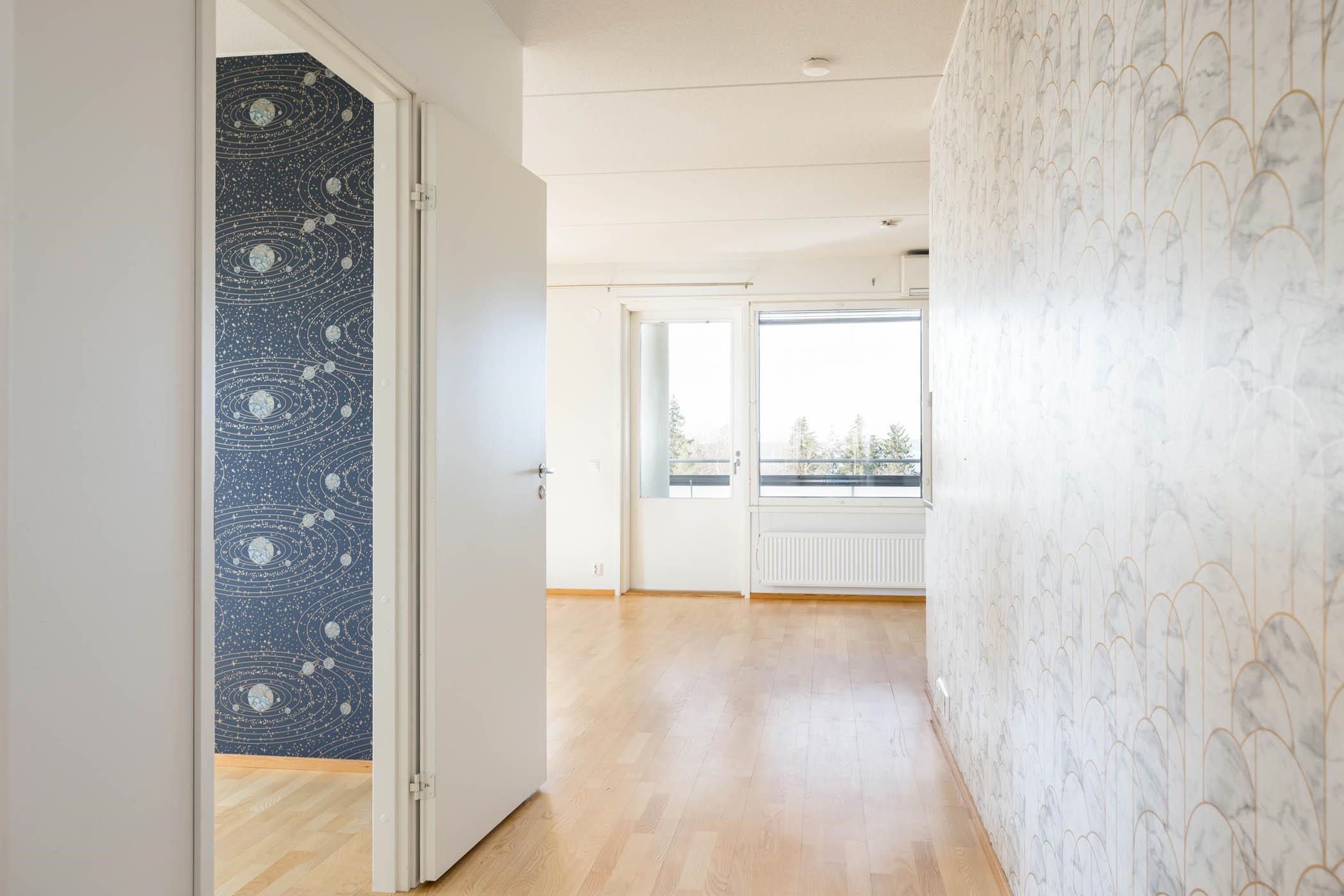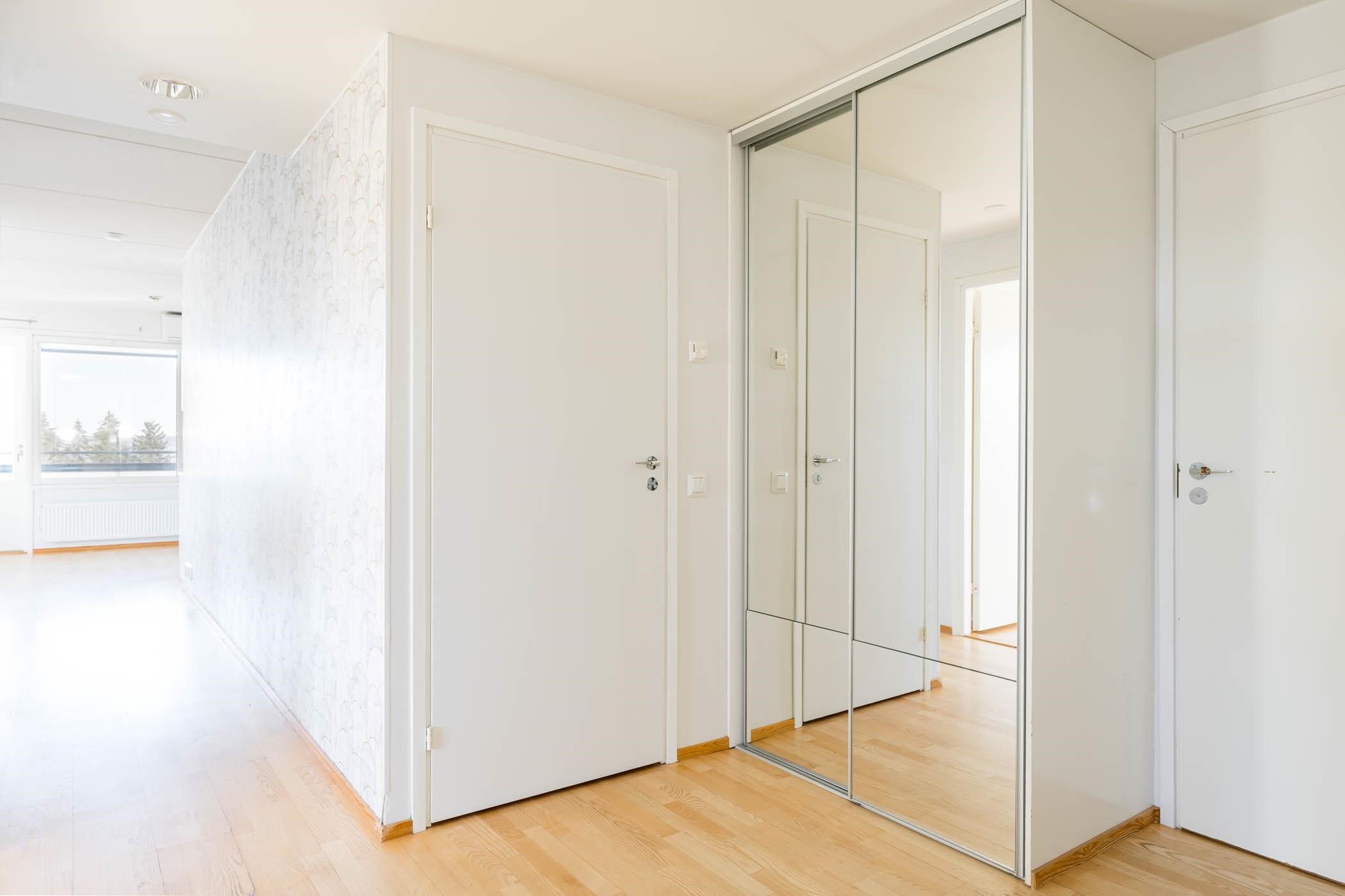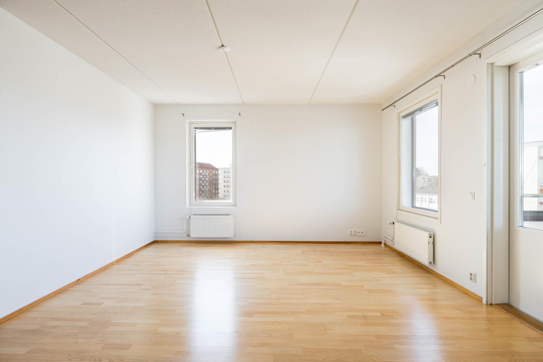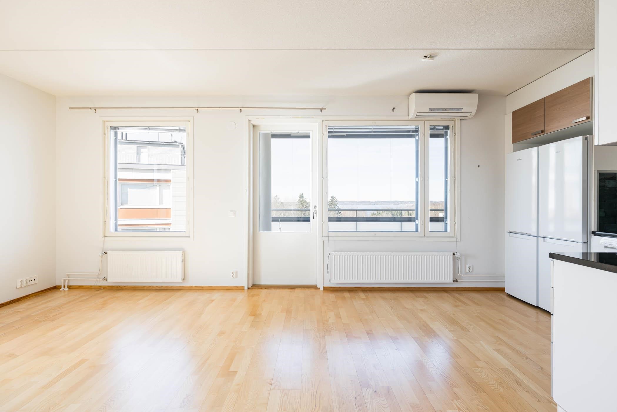 Asunnon pohjaratkaisu on avara ja selkeästi jäsennelty. Reilunkokoinen olohuone ja keittiö muodostavat viihtyisän kokonaisuuden, josta on käynti lasitetulle parvekkeelle nauttimaan ilta-auringosta ja maisemista. Keittiössä on runsaasti säilytys- ja työskentelytilaa, kivitasot sekä laadukkaat kodinkoneet, joita on vuosien varrella uusittu. Huoneistossa on kolme makuuhuonetta, mikä tarjoaa joustavuutta perheelle, työtilaksi tai vierashuoneeksi. Oman saunan, erillisen wc:n, vaatehuoneen ja hyvin suunniteltujen säilytystilojen ansiosta asuminen on mukavaa ja käytännöllistä. Ilmalämpöpumppu tuo lisämukavuutta ympäri vuoden.