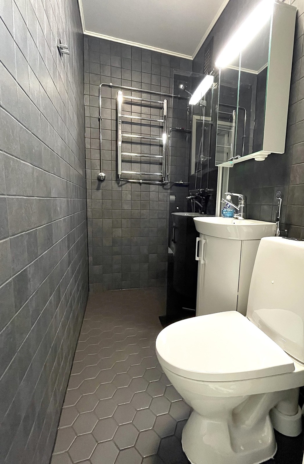 - Kylpyhuone, suihku, suihkuseinä, peilikaappi, allaskaappi, pesukoneliitäntä, lattialämmitys, kiinteät valaisimet, vesikiertoinen pyyhekuivain.