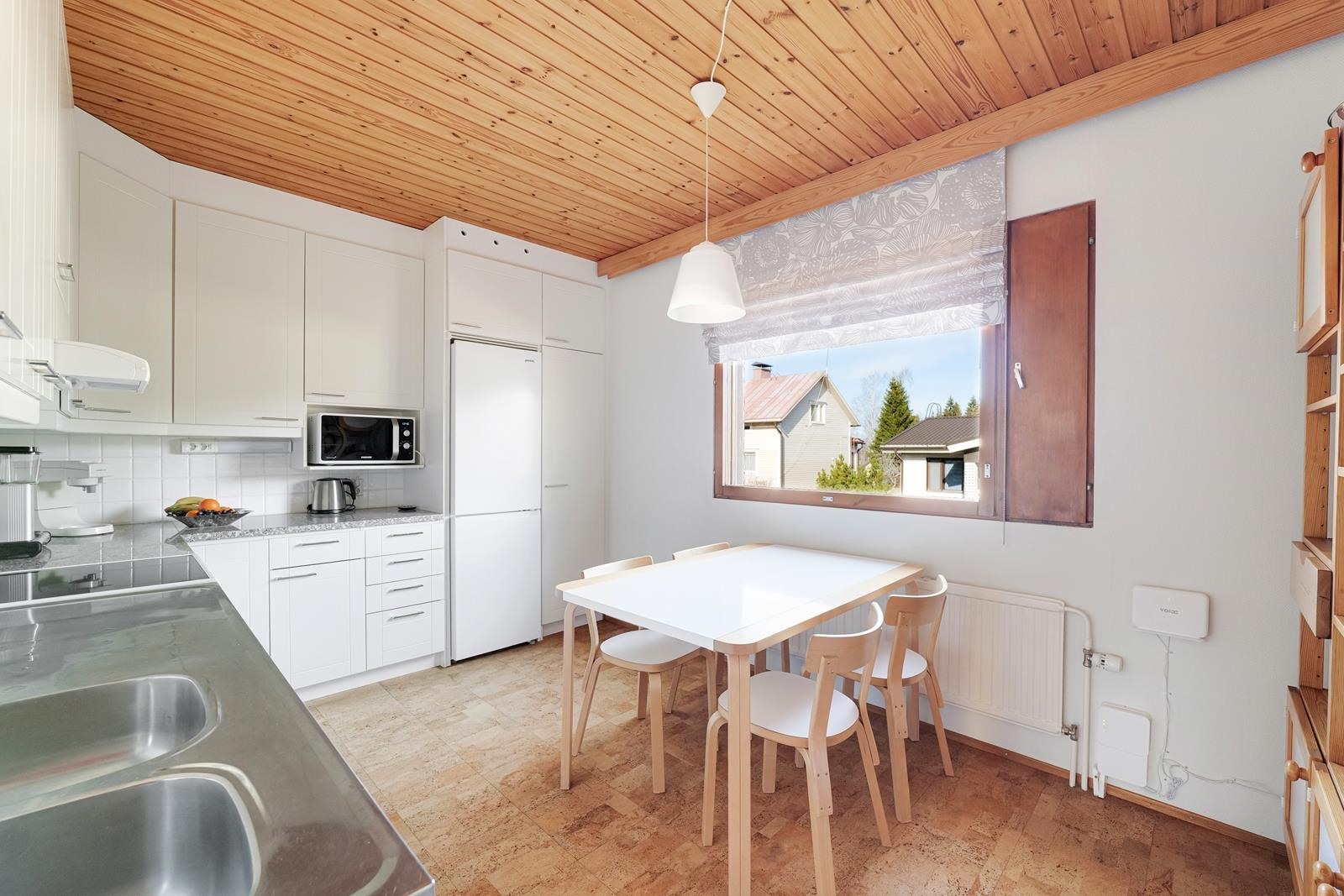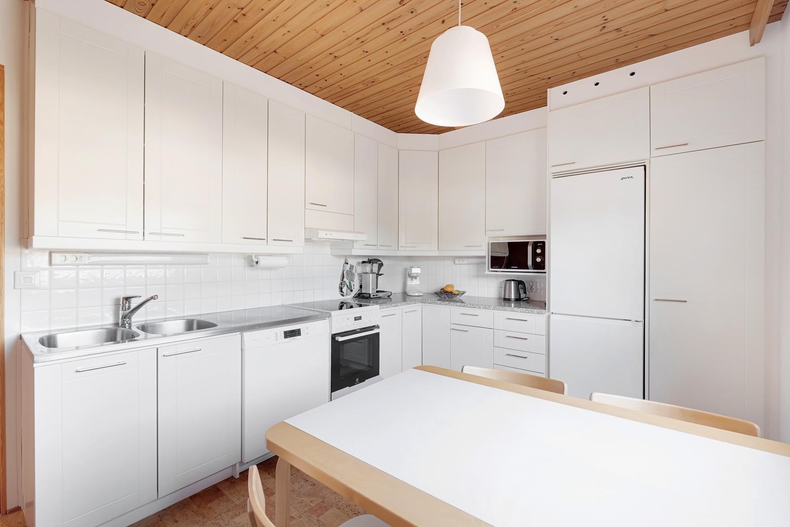 - Jääkaappipakastin, induktioliesi, liesituuletin, astianpesukone, kaapistot, kiinteät valaisimet, pöytätasojen materiaali kivitasot.