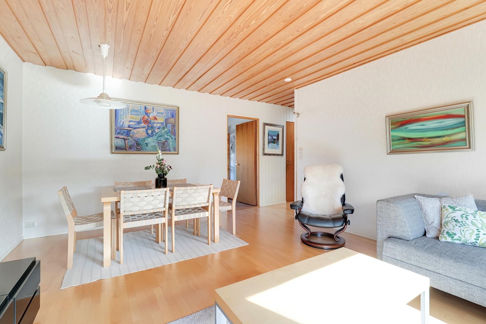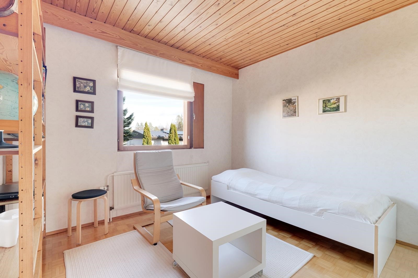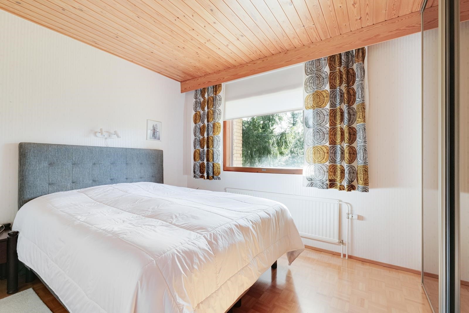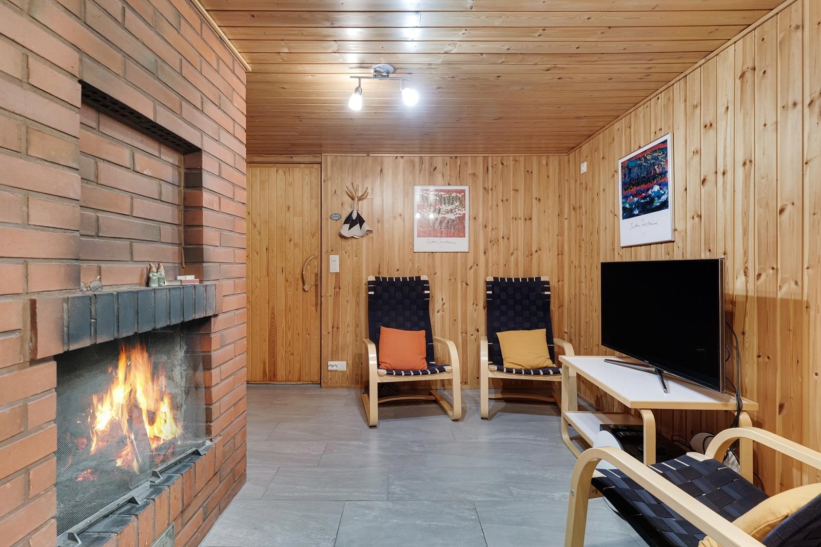 Keittiö: korkki / lasikuitutapetti. Olohuone: parketti / tapetti. Makuuhuone 1: parketti / tapetti. Makuuhuone 2: parketti / tapetti. Makuuhuone 3: parketti / tapetti. Kodinhoitohuone: maalattu betoni. Sauna: laatta / paneeli. Kylpyhuone: laatta / kaakeli. Wc: laatta / kaakeli / paneeli. takkahuone: laatta / paneeli.