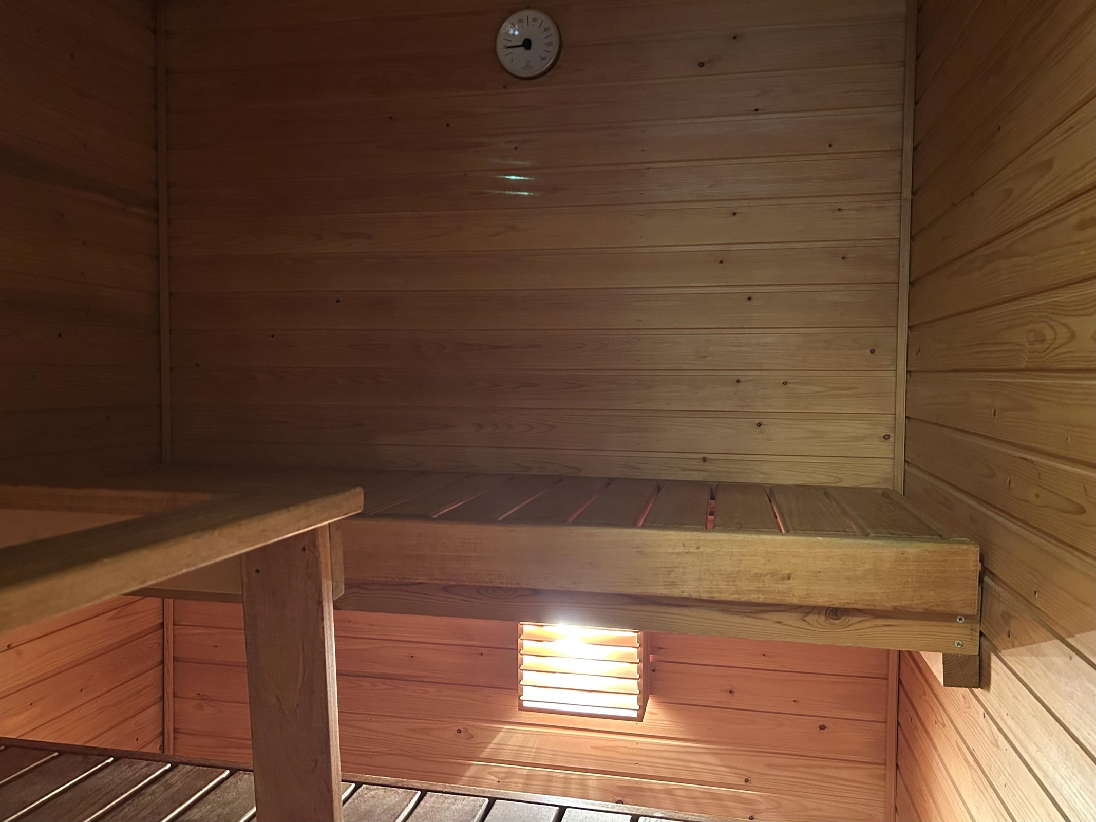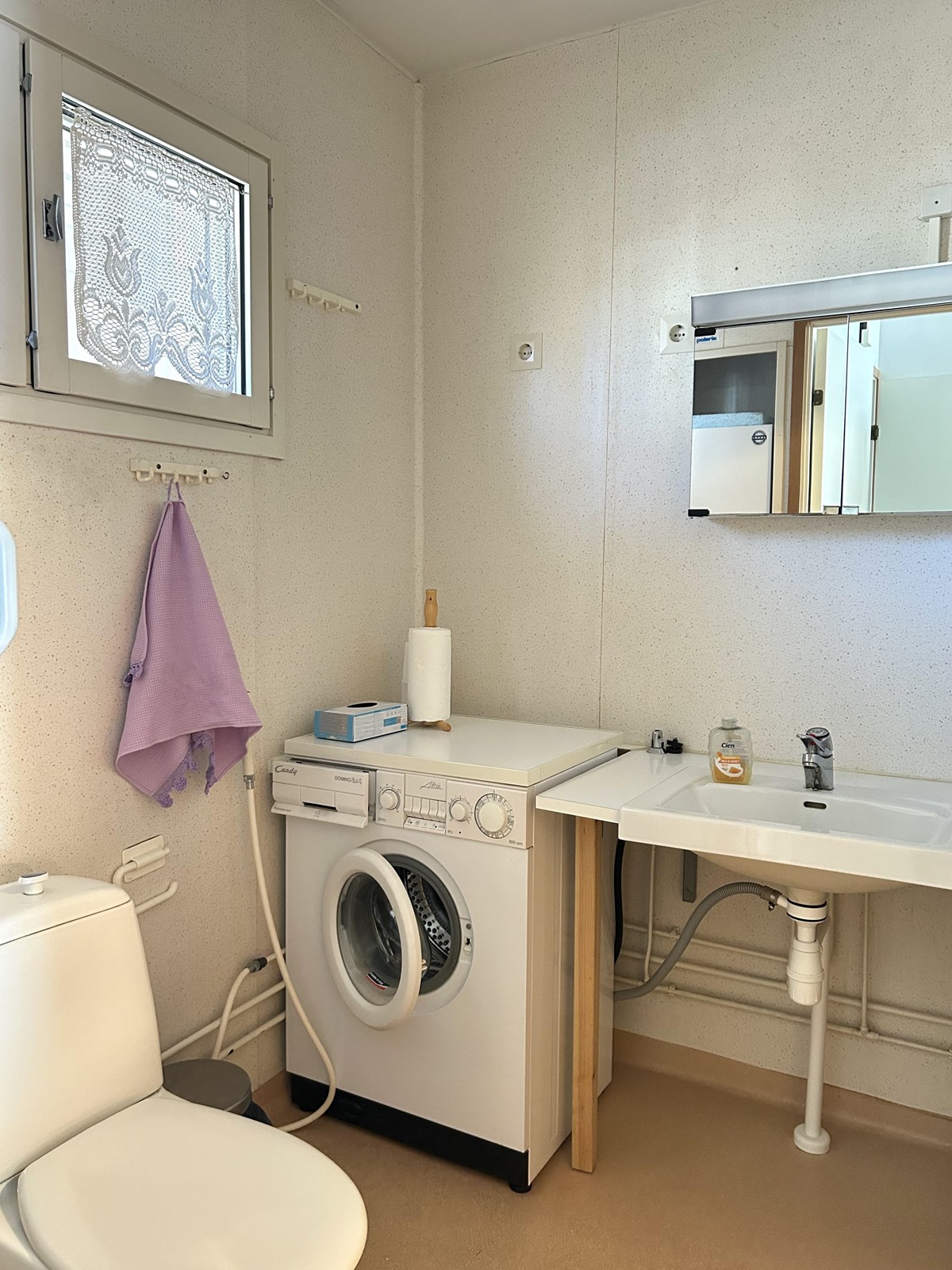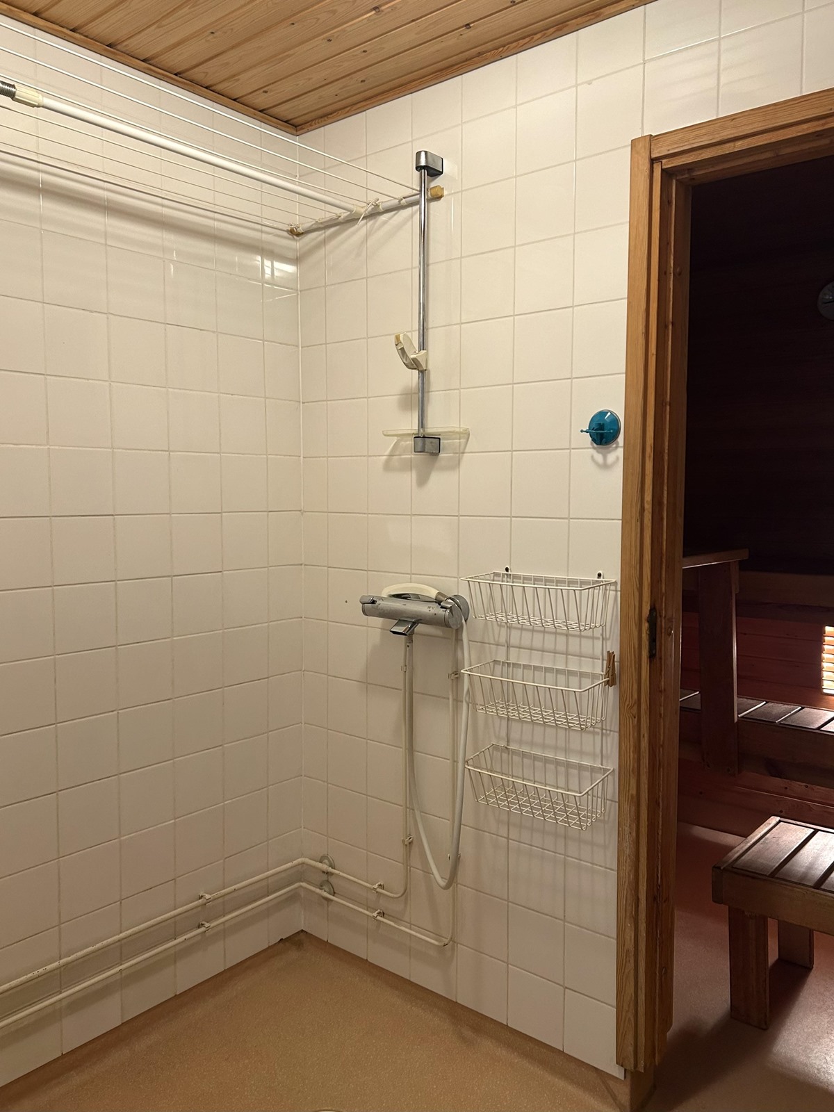 - Sauna, sähkökiuas, kylpyhuone, suihku, peilikaappi, pesukoneliitäntä, lattialämmitys Kylpyhuone ja sauna, kiinteät valaisimet. Saunaa ei ole käytetty 2011 jälkeen