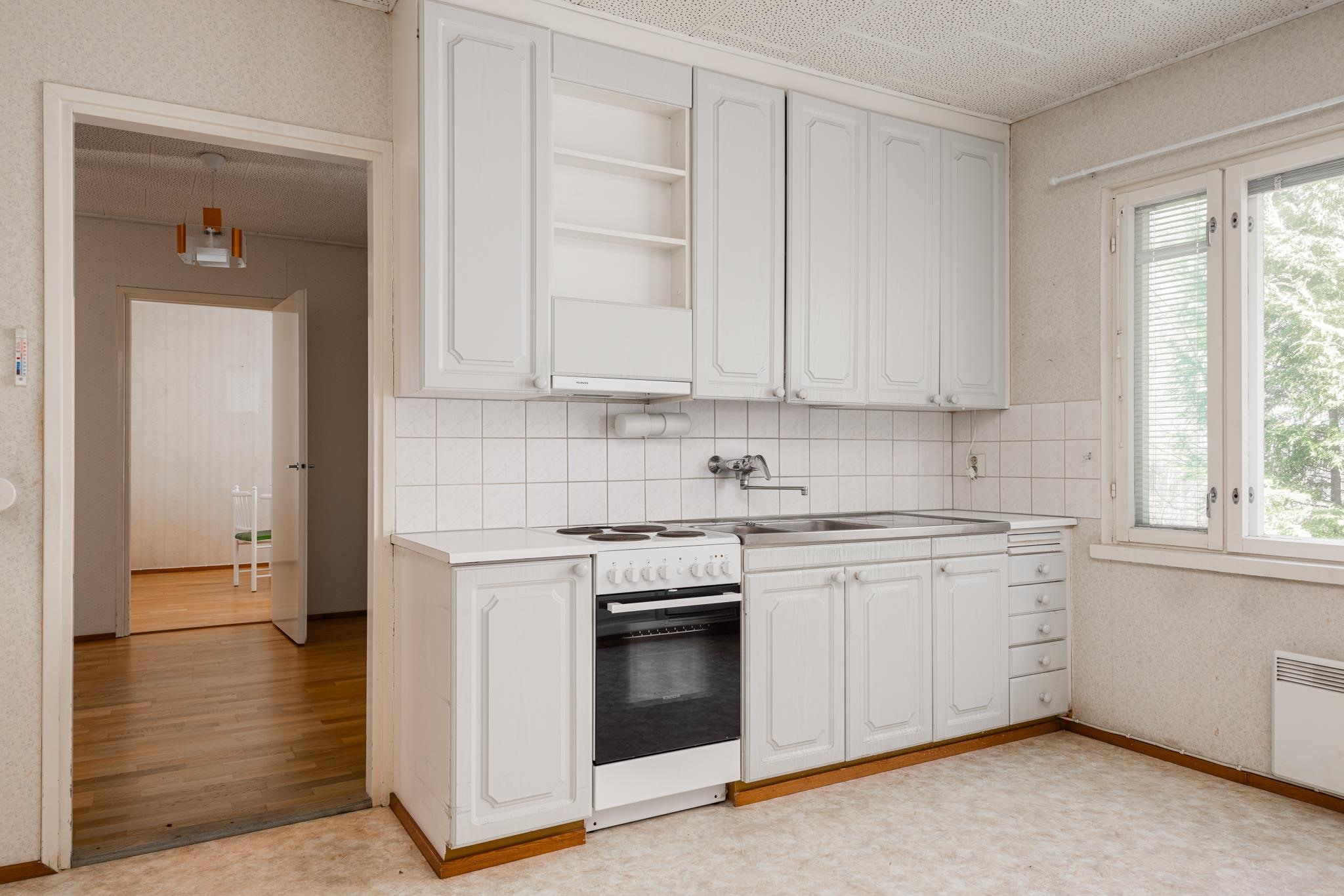 - Jääkaappipakastin, pakastekaappi, sähköliesi, liesituuletin, kaapistot, kiinteät valaisimet.