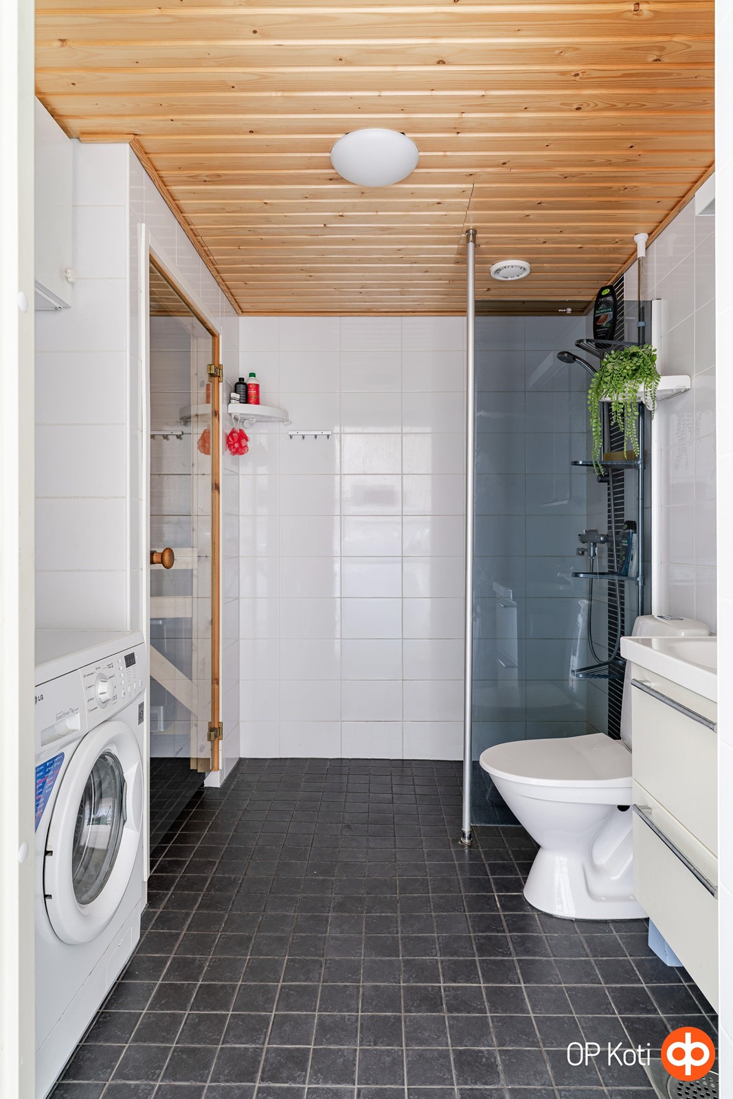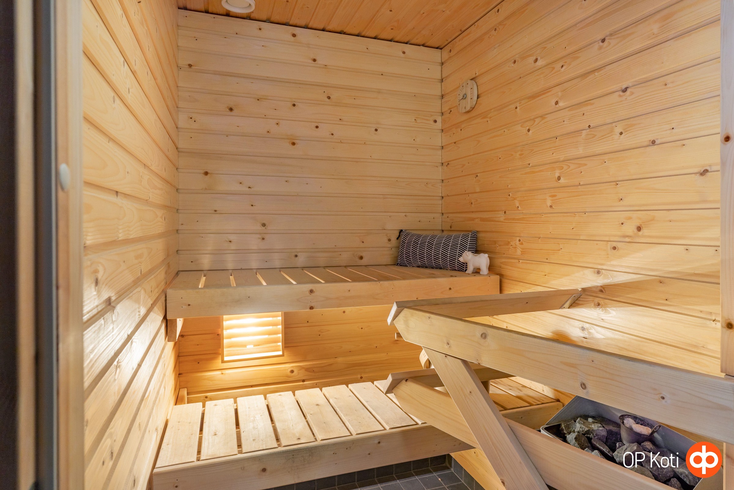 - Sauna, sähkökiuas, kylpyhuone, suihku, suihkuseinä, peilikaappi, allaskaappi, pesukoneliitäntä, lattialämmitys (sähköinen), kiinteät valaisimet.