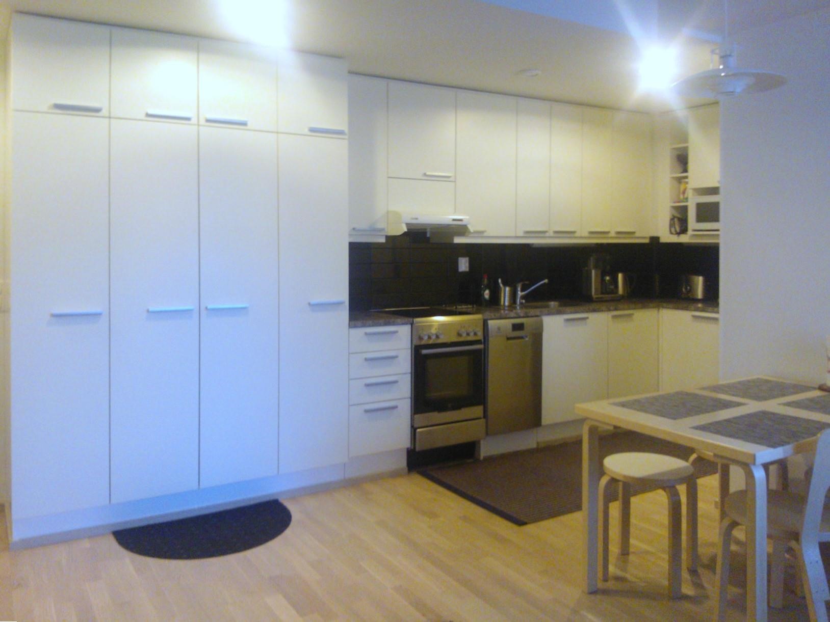 - Jääkaappipakastin, lattialiesi, liesituuletin, astianpesukone, kaapistot, kiinteät valaisimet.