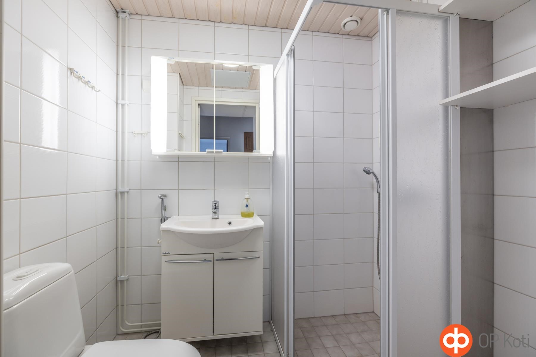 - Kylpyhuone, suihku, suihkukaappi, peilikaappi, allaskaappi, pesukoneliitäntä, lattialämmitys, kiinteät valaisimet.