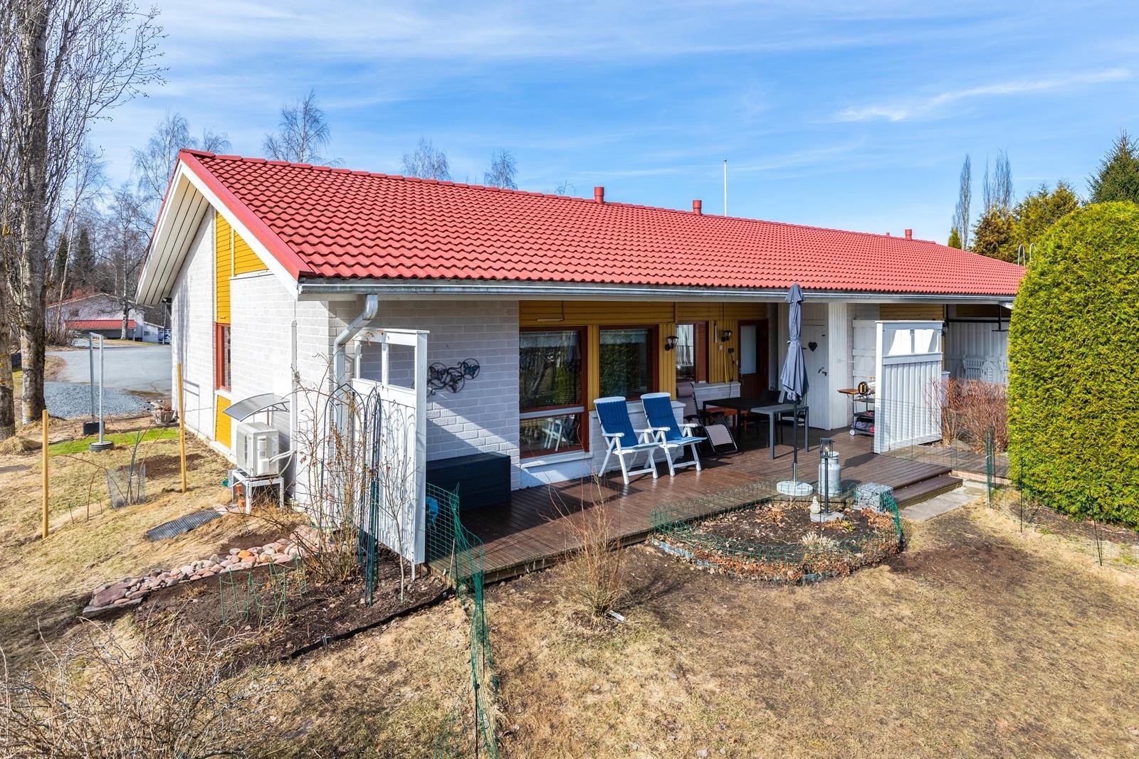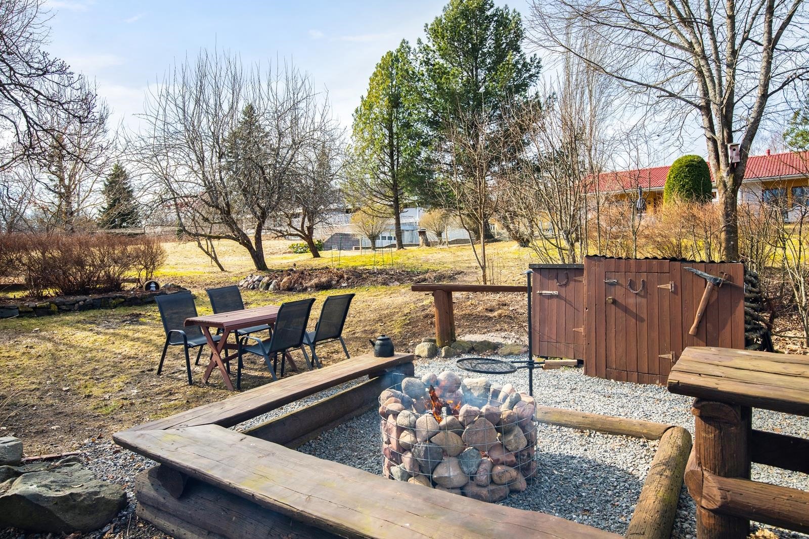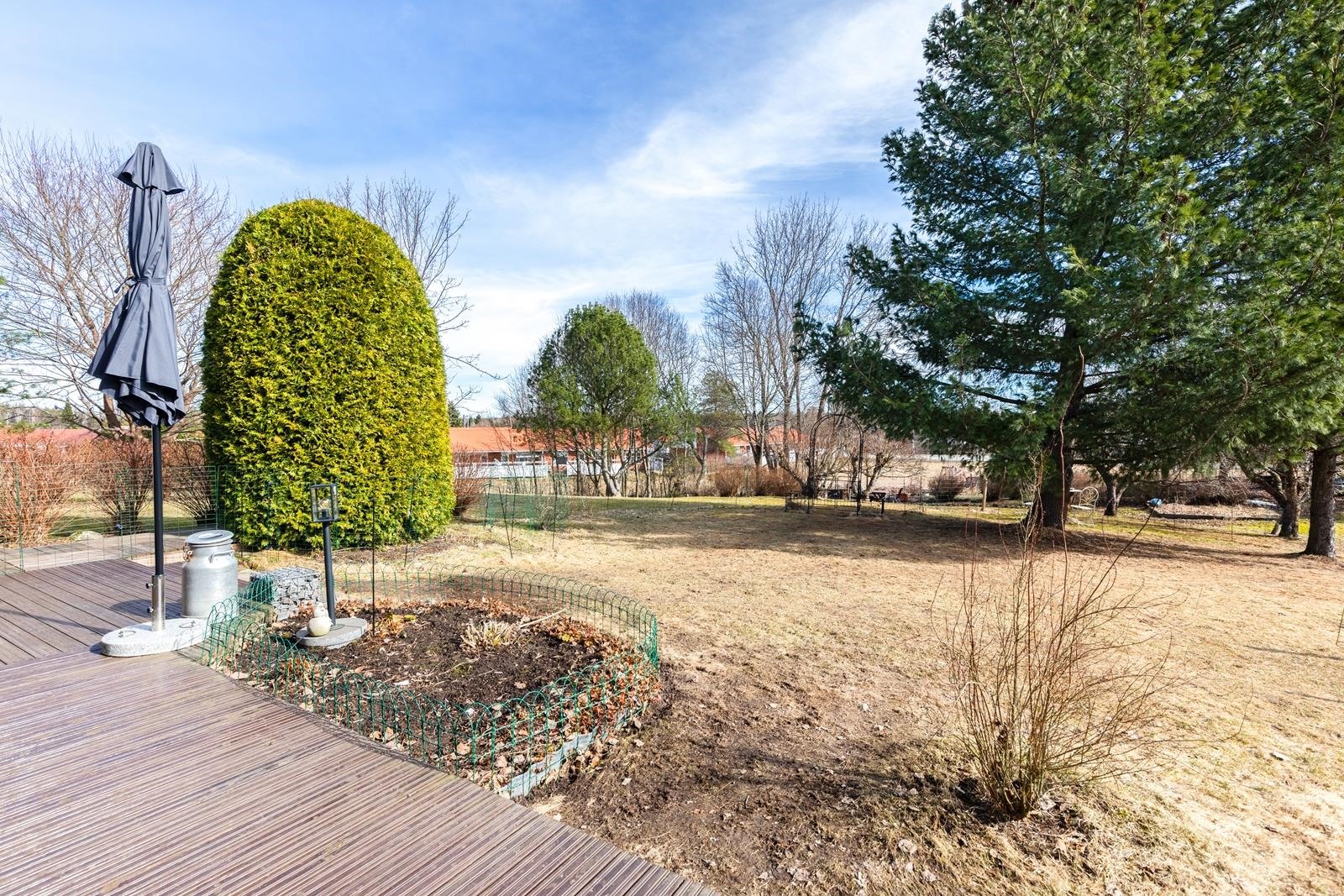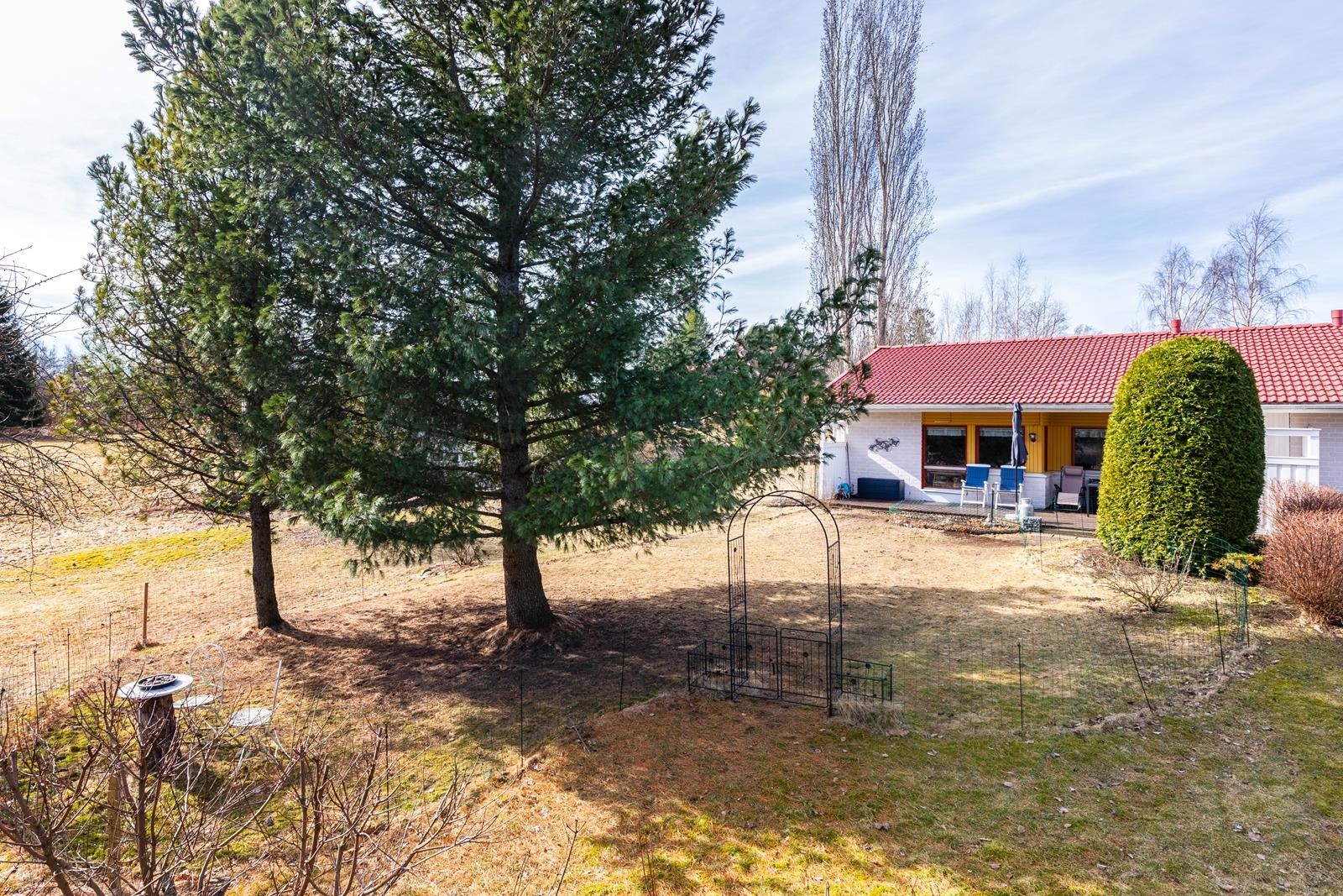 Erittäin viihtyisä ja hyvin hoidettu takapiha isolla terassilla, jossa katettua tilaa myös. Tämän taloyhtiön erityispiirteenä ja valttikorttina on erittäin laaja tontti, joka rajoittuu puistoon/peltoon. Tätä aluetta on hyödynnetty yhteisellä grillipaikalla ja tekemällä aluetta viihtyisämmäksi mm. erilaisia puita istuttamalla.