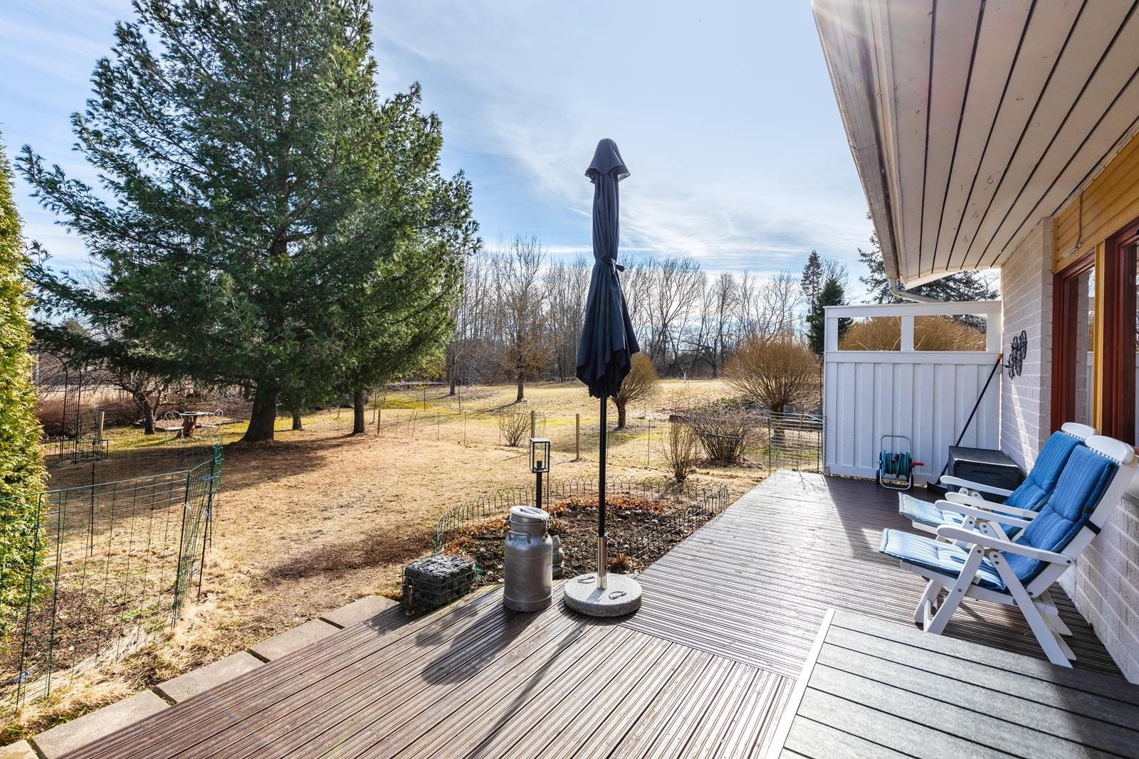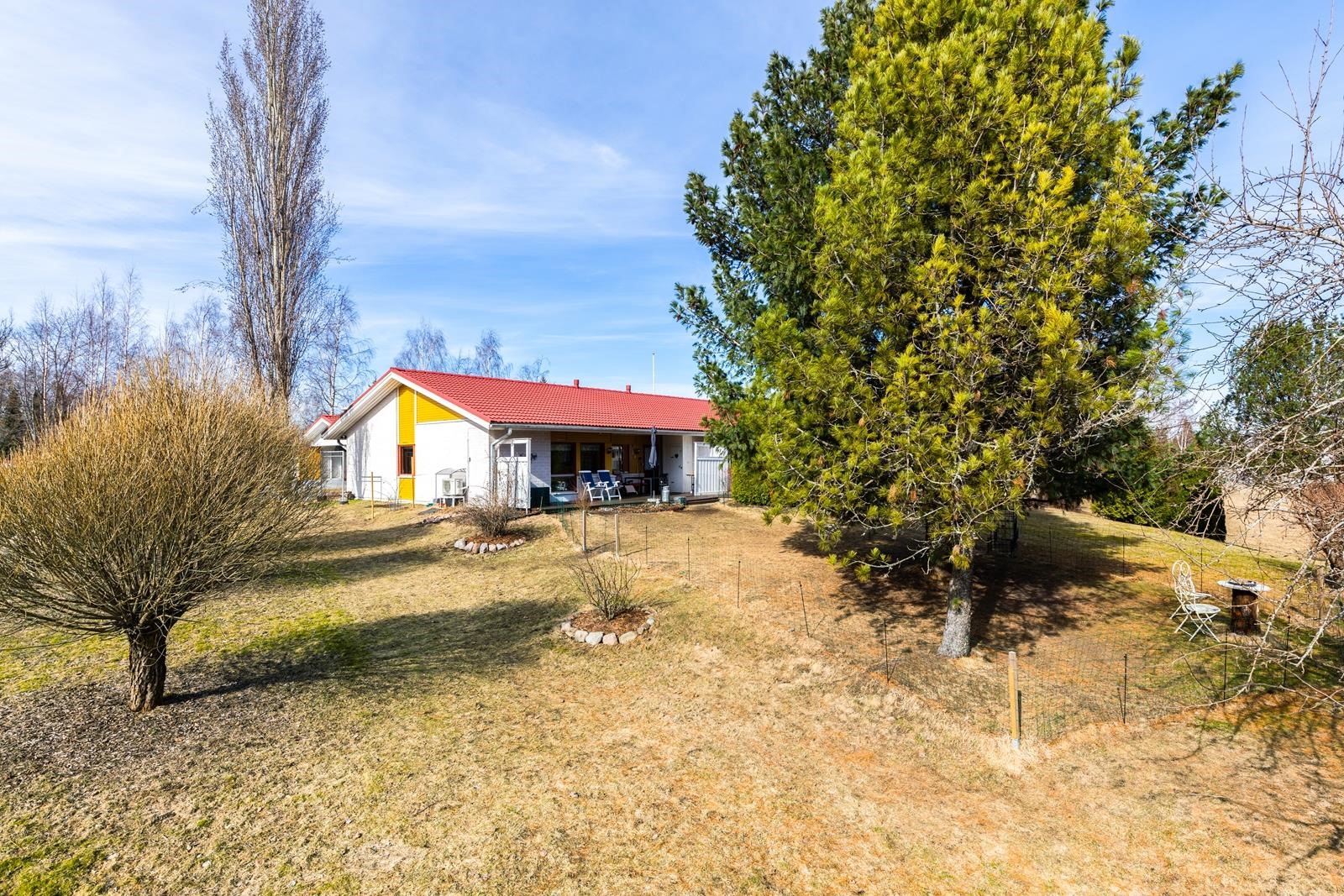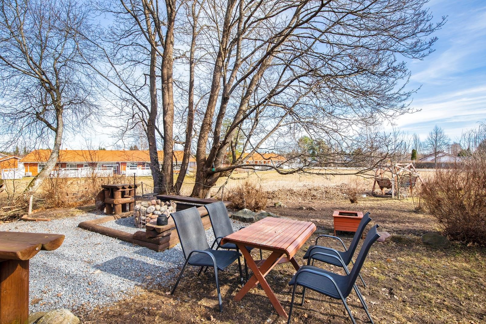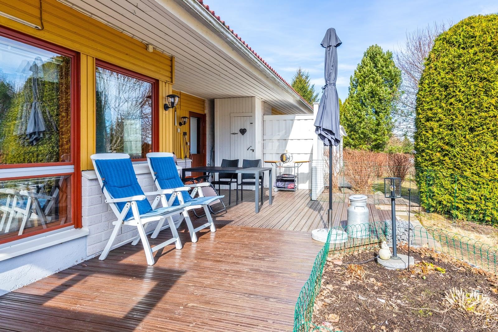 Erittäin viihtyisä ja hyvin hoidettu takapiha isolla terassilla, jossa katettua tilaa myös. Tämän taloyhtiön erityispiirteenä ja valttikorttina on erittäin laaja tontti, joka rajoittuu puistoon/peltoon. Tätä aluetta on hyödynnetty yhteisellä grillipaikalla ja tekemällä aluetta viihtyisämmäksi mm. erilaisia puita istuttamalla.