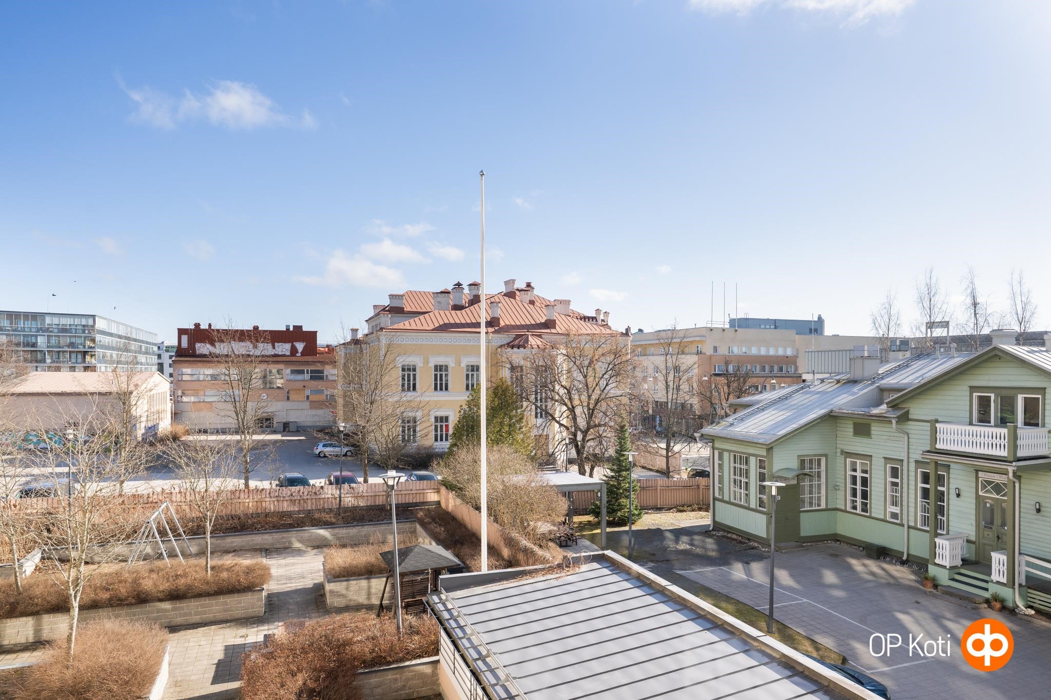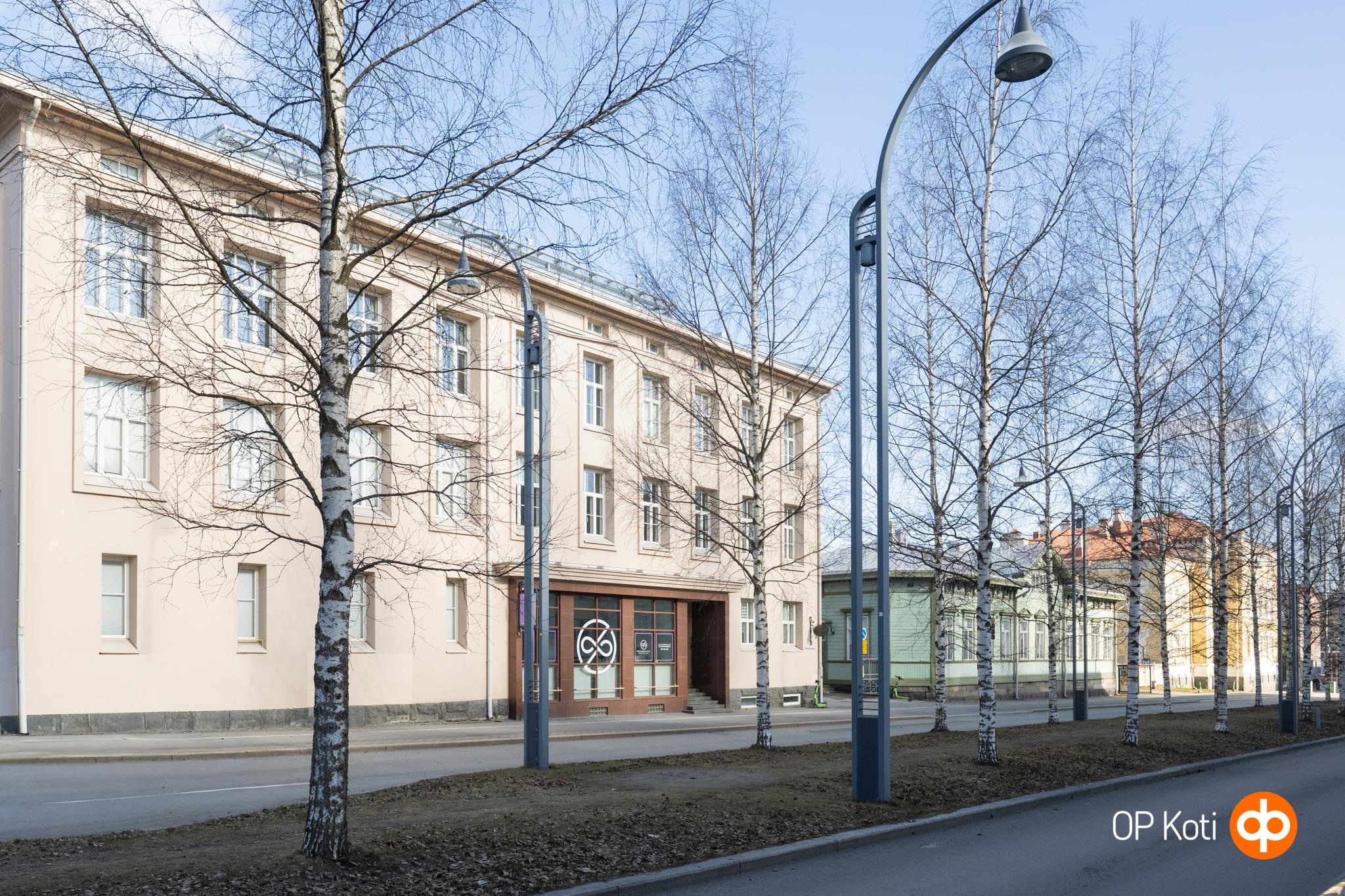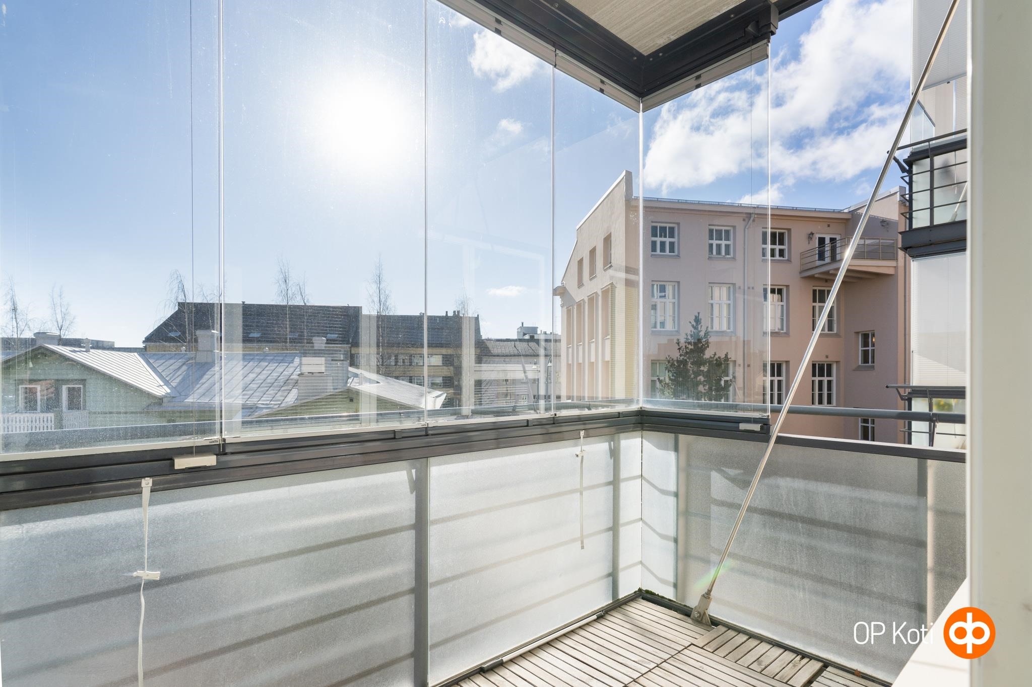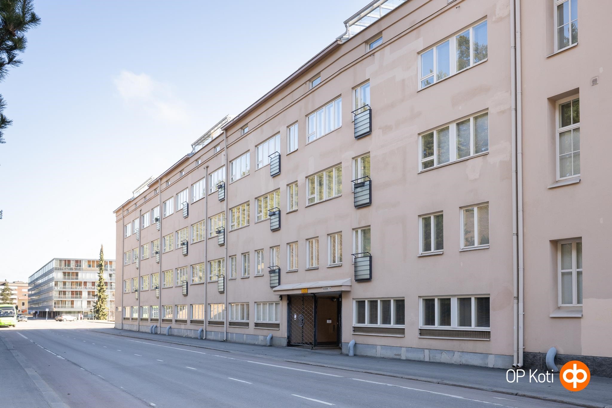 Tästä historiallisesta talosta uutta omistajaa etsii kolmannen kerroksen läpitalon saunallinen kaksio. Huoneistossa on kaksi parvekketta, joista makuuhuoneen yhteydessä oleva ranskalainen parveke suuntautuu Harjun suuntaan. Lasitettu parveke on olohuoneen yhteydessä, ja sieltä on näkymä talon sisäpihalle Yliopistonkadun suuntaan.